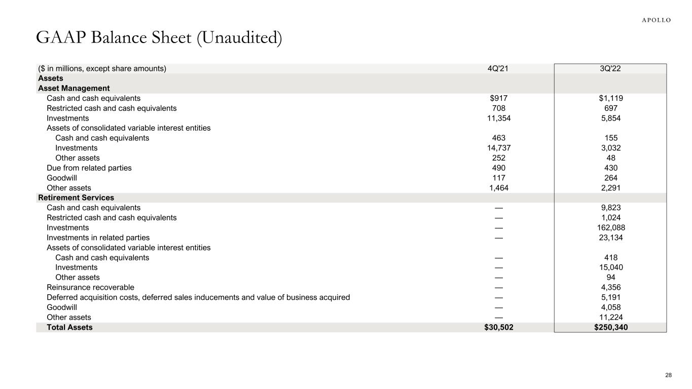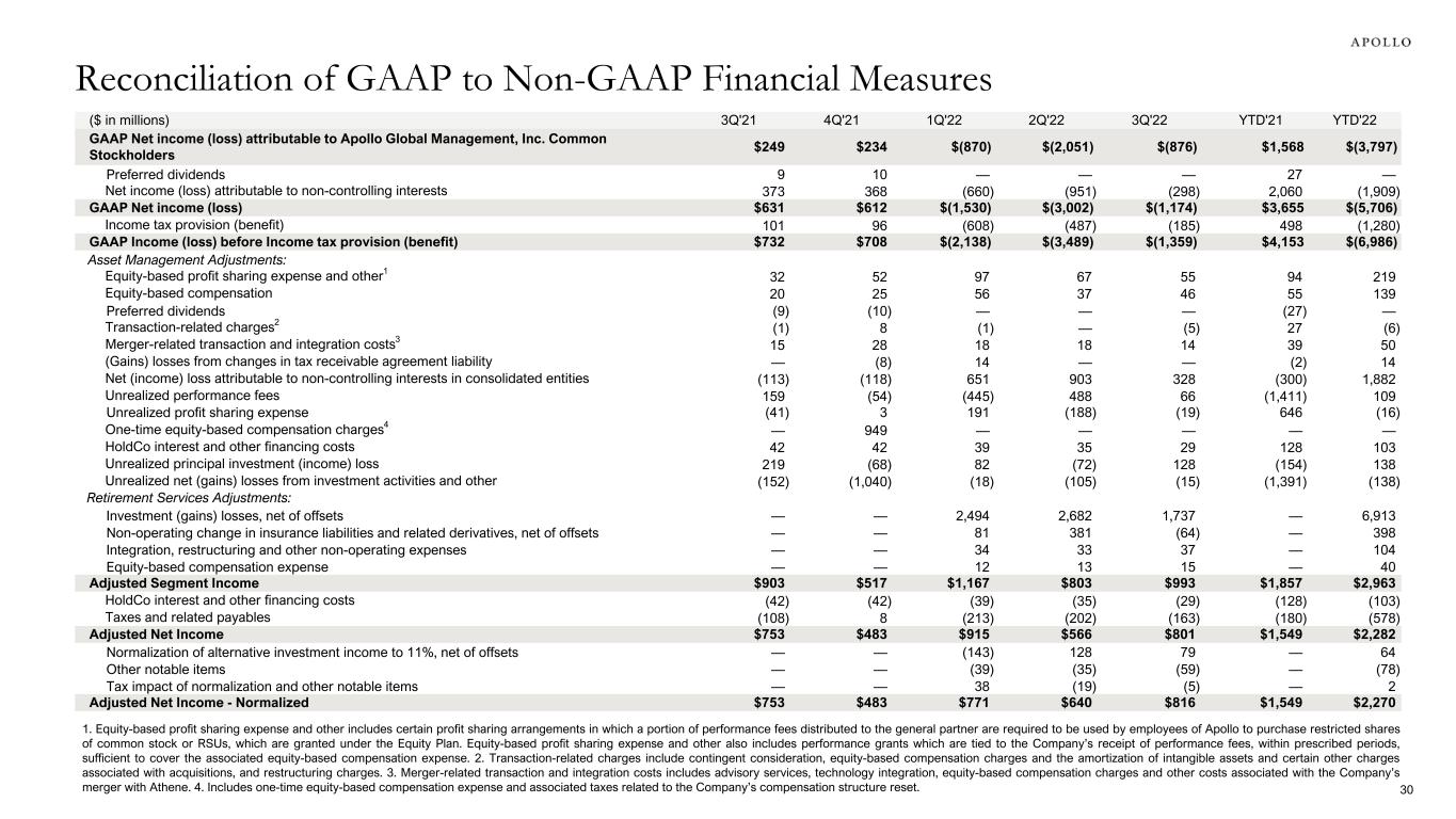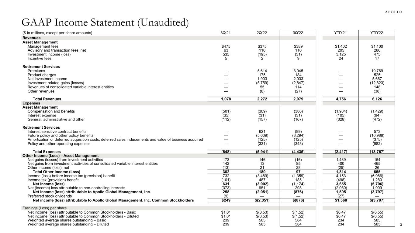 ($ in millions, except per share amounts) 3Q'21 2Q'22 3Q'22 YTD'21 YTD'22 Revenues Asset Management Management fees $475 $375 $389 $1,402 $1,100 Advisory and transaction fees, net 63 110 110 205 286 Investment income (loss) 535 (195) (31) 3,125 475 Incentive fees 5 2 9 24 17 Retirement Services Premiums — 5,614 3,045 — 10,769 Product charges — 175 184 — 525 Net investment income — 1,903 2,033 — 5,667 Investment related gains (losses) — (5,759) (2,847) — (12,823) Revenues of consolidated variable interest entities — 55 114 — 148 Other revenues — (8) (27) — (38) Total Revenues 1,078 2,272 2,979 4,756 6,126 Expenses Asset Management Compensation and benefits (501) (309) (386) (1,984) (1,429) Interest expense (35) (31) (31) (105) (94) General, administrative and other (112) (157) (167) (328) (472) Retirement Services Interest sensitive contract benefits — 621 (89) — 573 Future policy and other policy benefits — (5,609) (3,294) — (10,988) Amortization of deferred acquisition costs, deferred sales inducements and value of business acquired — (125) (125) — (375) Policy and other operating expenses — (331) (343) — (982) Total Expenses (648) (5,941) (4,435) (2,417) (13,767) Other Income (Loss) – Asset Management Net gains (losses) from investment activities 173 146 (16) 1,439 164 Net gains from investment activities of consolidated variable interest entities 142 13 85 400 465 Other income (loss), net (13) 21 28 (25) 26 Total Other Income (Loss) 302 180 97 1,814 655 Income (loss) before income tax (provision) benefit 732 (3,489) (1,359) 4,153 (6,986) Income tax (provision) benefit (101) 487 185 (498) 1,280 Net income (loss) 631 (3,002) (1,174) 3,655 (5,706) Net (income) loss attributable to non-controlling interests (373) 951 298 (2,060) 1,909 Net income (loss) attributable to Apollo Global Management, Inc. 258 (2,051) (876) 1,595 (3,797) Preferred stock dividends (9) — — (27) — Net income (loss) attributable to Apollo Global Management, Inc. Common Stockholders $249 $(2,051) $(876) $1,568 $(3,797) Earnings (Loss) per share Net income (loss) attributable to Common Stockholders - Basic $1.01 $(3.53) $(1.52) $6.47 $(6.55) Net income (loss) attributable to Common Stockholders - Diluted $1.01 $(3.53) $(1.52) $6.47 $(6.55) Weighted average shares outstanding – Basic 239 585 584 234 585 Weighted average shares outstanding – Diluted 239 585 584 234 585 GAAP Income Statement (Unaudited) 3