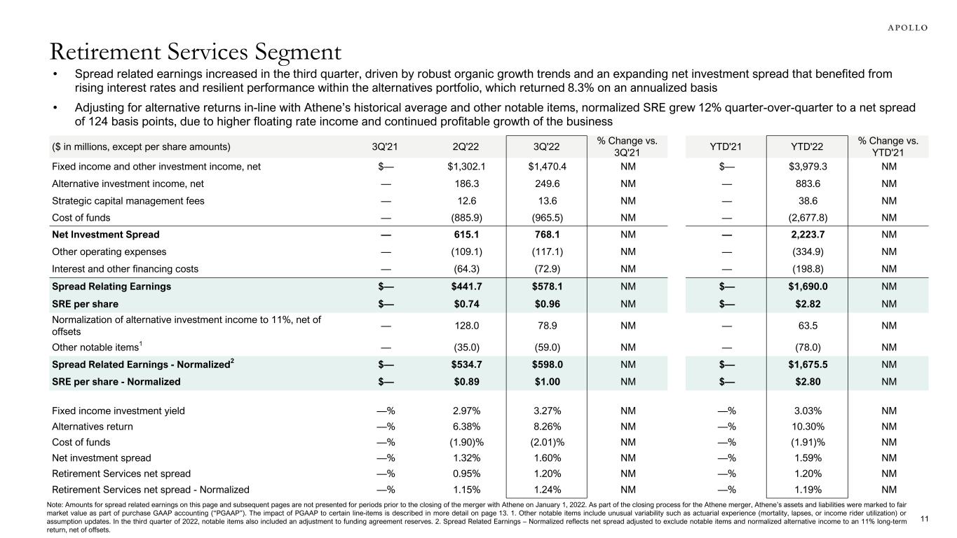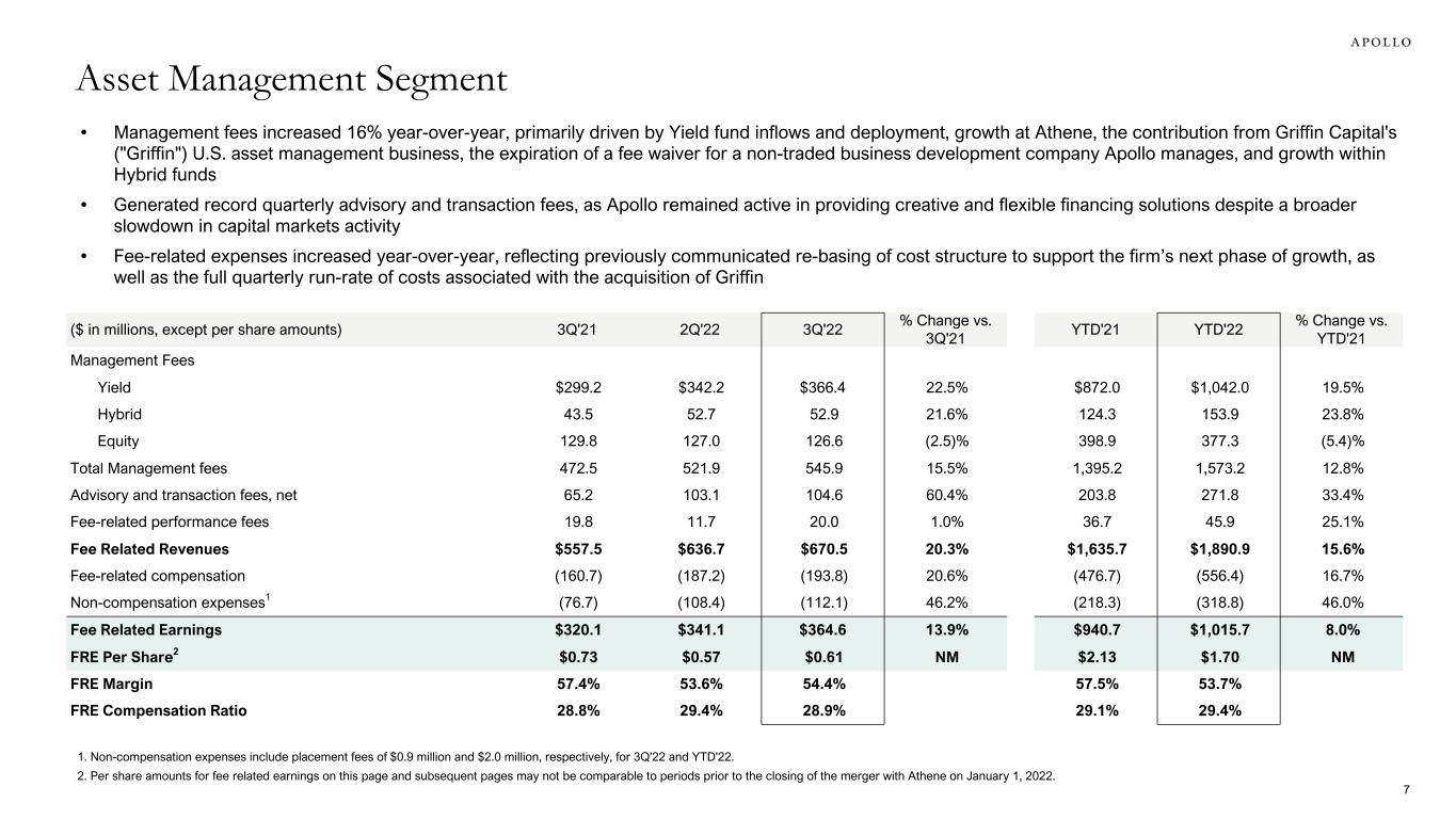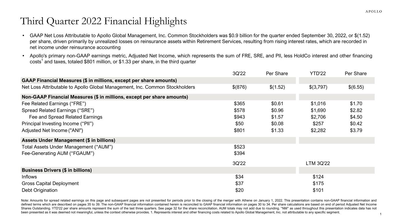 ($ in millions, except per share amounts) 3Q'21 2Q'22 3Q'22 YTD'21 YTD'22 Revenues Asset Management Management fees $475 $375 $389 $1,402 $1,100 Advisory and transaction fees, net 63 110 110 205 286 Investment income (loss) 535 (195) (31) 3,125 475 Incentive fees 5 2 9 24 17 Retirement Services Premiums — 5,614 3,045 — 10,769 Product charges — 175 184 — 525 Net investment income — 1,903 2,033 — 5,667 Investment related gains (losses) — (5,759) (2,847) — (12,823) Revenues of consolidated variable interest entities — 55 114 — 148 Other revenues — (8) (27) — (38) Total Revenues 1,078 2,272 2,979 4,756 6,126 Expenses Asset Management Compensation and benefits (501) (309) (386) (1,984) (1,429) Interest expense (35) (31) (31) (105) (94) General, administrative and other (112) (157) (167) (328) (472) Retirement Services Interest sensitive contract benefits — 621 (89) — 573 Future policy and other policy benefits — (5,609) (3,294) — (10,988) Amortization of deferred acquisition costs, deferred sales inducements and value of business acquired — (125) (125) — (375) Policy and other operating expenses — (331) (343) — (982) Total Expenses (648) (5,941) (4,435) (2,417) (13,767) Other Income (Loss) – Asset Management Net gains (losses) from investment activities 173 146 (16) 1,439 164 Net gains from investment activities of consolidated variable interest entities 142 13 85 400 465 Other income (loss), net (13) 21 28 (25) 26 Total Other Income (Loss) 302 180 97 1,814 655 Income (loss) before income tax (provision) benefit 732 (3,489) (1,359) 4,153 (6,986) Income tax (provision) benefit (101) 487 185 (498) 1,280 Net income (loss) 631 (3,002) (1,174) 3,655 (5,706) Net (income) loss attributable to non-controlling interests (373) 951 298 (2,060) 1,909 Net income (loss) attributable to Apollo Global Management, Inc. 258 (2,051) (876) 1,595 (3,797) Preferred stock dividends (9) — — (27) — Net income (loss) attributable to Apollo Global Management, Inc. Common Stockholders $249 $(2,051) $(876) $1,568 $(3,797) Earnings (Loss) per share Net income (loss) attributable to Common Stockholders - Basic $1.01 $(3.53) $(1.52) $6.47 $(6.55) Net income (loss) attributable to Common Stockholders - Diluted $1.01 $(3.53) $(1.52) $6.47 $(6.55) Weighted average shares outstanding – Basic 239 585 584 234 585 Weighted average shares outstanding – Diluted 239 585 584 234 585 GAAP Income Statement (Unaudited) 3