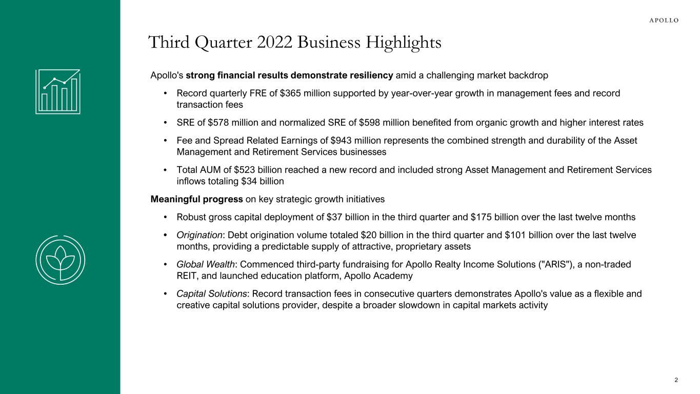 Third Quarter 2022 Business Highlights Apollo's strong financial results demonstrate resiliency amid a challenging market backdrop • Record quarterly FRE of $365 million supported by year-over-year growth in management fees and record transaction fees • SRE of $578 million and normalized SRE of $598 million benefited from organic growth and higher interest rates • Fee and Spread Related Earnings of $943 million represents the combined strength and durability of the Asset Management and Retirement Services businesses • Total AUM of $523 billion reached a new record and included strong Asset Management and Retirement Services inflows totaling $34 billion Meaningful progress on key strategic growth initiatives • Robust gross capital deployment of $37 billion in the third quarter and $175 billion over the last twelve months • Origination: Debt origination volume totaled $20 billion in the third quarter and $101 billion over the last twelve months, providing a predictable supply of attractive, proprietary assets • Global Wealth: Commenced third-party fundraising for Apollo Realty Income Solutions ("ARIS"), a non-traded REIT, and launched education platform, Apollo Academy • Capital Solutions: Record transaction fees in consecutive quarters demonstrates Apollo's value as a flexible and creative capital solutions provider, despite a broader slowdown in capital markets activity ✓ ✓ 2