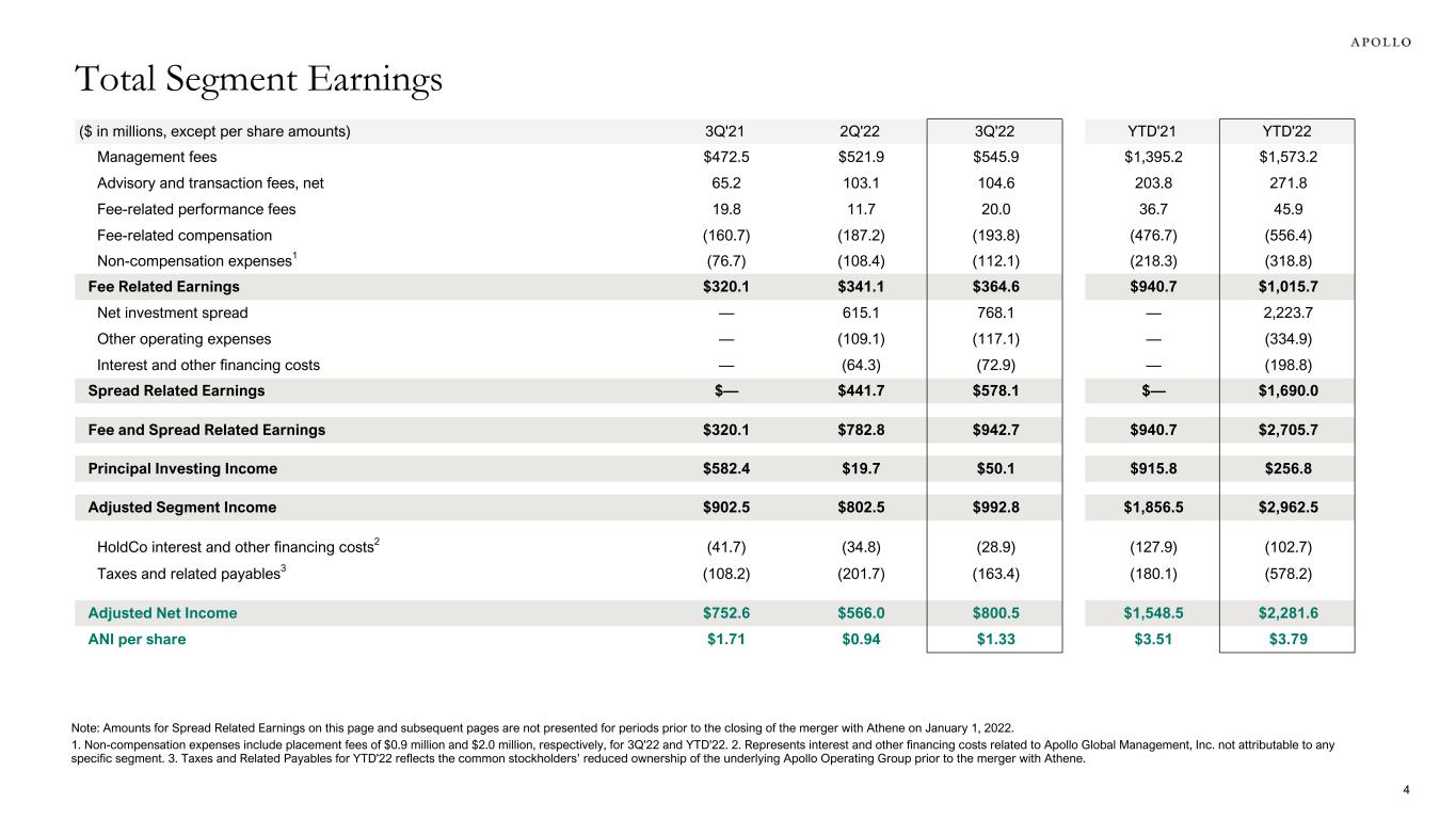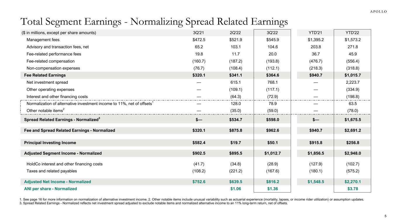 ($ in millions, except per share amounts) 3Q'21 2Q'22 3Q'22 YTD'21 YTD'22 Management fees $472.5 $521.9 $545.9 $1,395.2 $1,573.2 Advisory and transaction fees, net 65.2 103.1 104.6 203.8 271.8 Fee-related performance fees 19.8 11.7 20.0 36.7 45.9 Fee-related compensation (160.7) (187.2) (193.8) (476.7) (556.4) Non-compensation expenses1 (76.7) (108.4) (112.1) (218.3) (318.8) Fee Related Earnings $320.1 $341.1 $364.6 $940.7 $1,015.7 Net investment spread — 615.1 768.1 — 2,223.7 Other operating expenses — (109.1) (117.1) — (334.9) Interest and other financing costs — (64.3) (72.9) — (198.8) Spread Related Earnings $— $441.7 $578.1 $— $1,690.0 Fee and Spread Related Earnings $320.1 $782.8 $942.7 $940.7 $2,705.7 Principal Investing Income $582.4 $19.7 $50.1 $915.8 $256.8 Adjusted Segment Income $902.5 $802.5 $992.8 $1,856.5 $2,962.5 HoldCo interest and other financing costs2 (41.7) (34.8) (28.9) (127.9) (102.7) Taxes and related payables3 (108.2) (201.7) (163.4) (180.1) (578.2) Adjusted Net Income $752.6 $566.0 $800.5 $1,548.5 $2,281.6 ANI per share $1.71 $0.94 $1.33 $3.51 $3.79 Note: Amounts for Spread Related Earnings on this page and subsequent pages are not presented for periods prior to the closing of the merger with Athene on January 1, 2022. 1. Non-compensation expenses include placement fees of $0.9 million and $2.0 million, respectively, for 3Q'22 and YTD'22. 2. Represents interest and other financing costs related to Apollo Global Management, Inc. not attributable to any specific segment. 3. Taxes and Related Payables for YTD'22 reflects the common stockholders’ reduced ownership of the underlying Apollo Operating Group prior to the merger with Athene. Total Segment Earnings 4