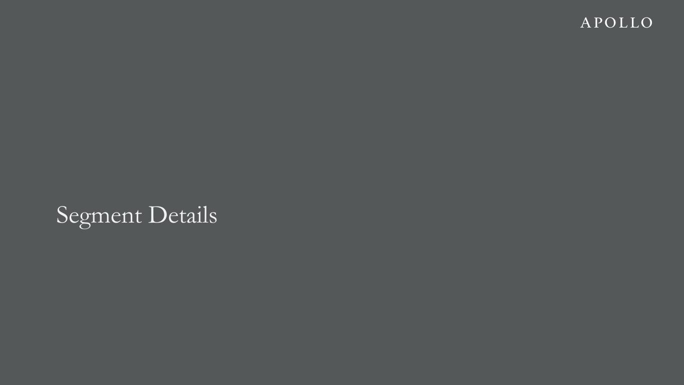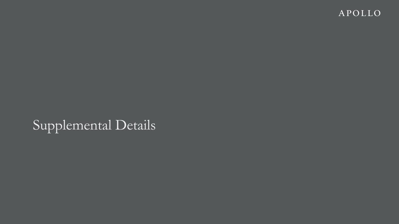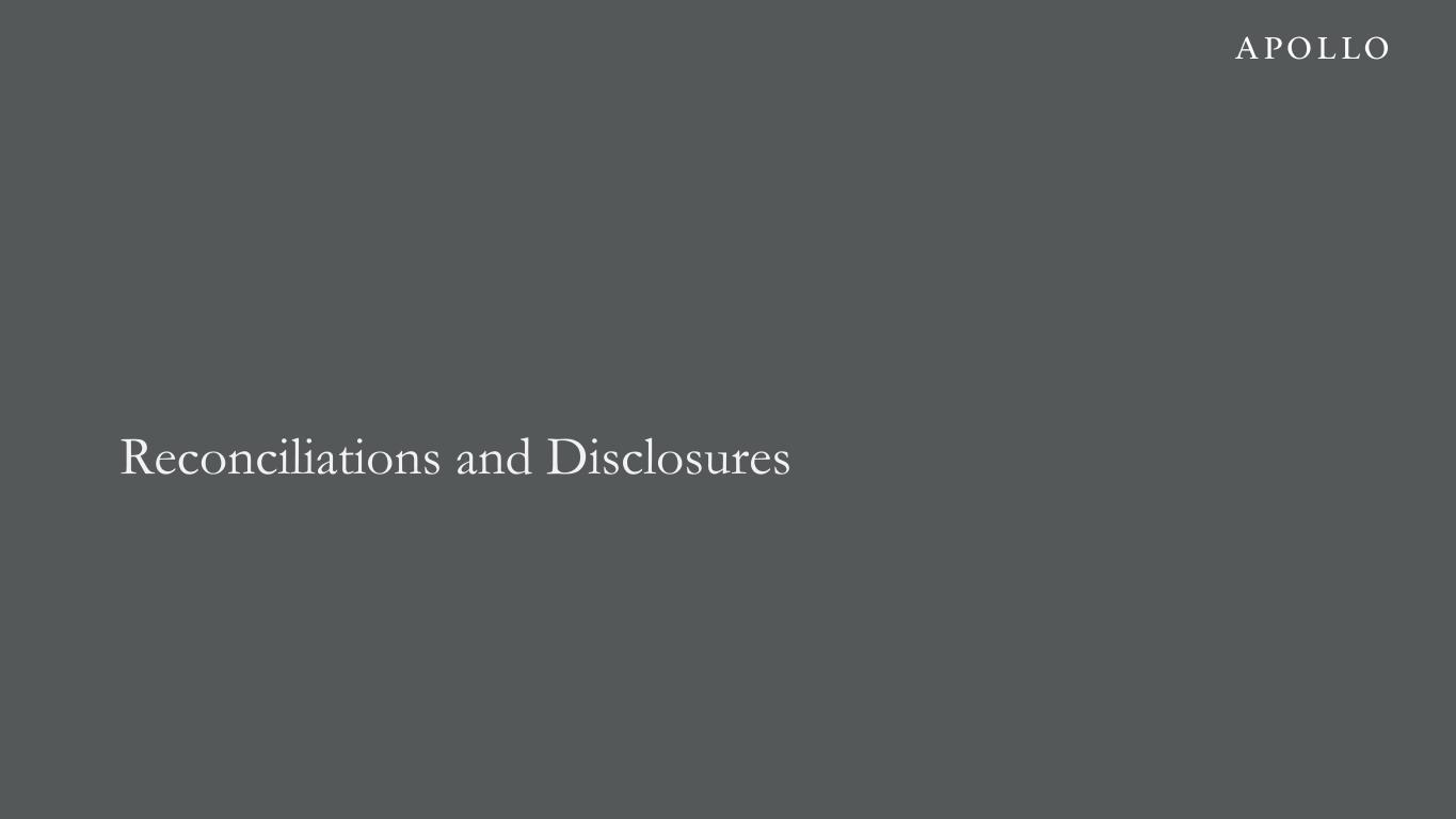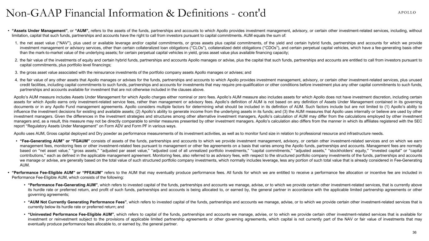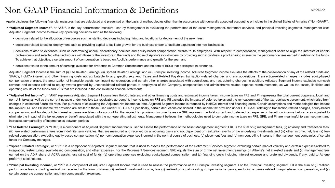 Apollo discloses the following financial measures that are calculated and presented on the basis of methodologies other than in accordance with generally accepted accounting principles in the United States of America (“Non-GAAP”): • “Adjusted Segment Income”, or “ASI”, is the key performance measure used by management in evaluating the performance of the asset management, retirement services, and principal investing segments. Management uses Adjusted Segment Income to make key operating decisions such as the following: ▪ decisions related to the allocation of resources such as staffing decisions including hiring and locations for deployment of the new hires; ▪ decisions related to capital deployment such as providing capital to facilitate growth for the business and/or to facilitate expansion into new businesses; ▪ decisions related to expenses, such as determining annual discretionary bonuses and equity-based compensation awards to its employees. With respect to compensation, management seeks to align the interests of certain professionals and selected other individuals with those of the investors in the funds and those of Apollo’s stockholders by providing such individuals a profit sharing interest in the performance fees earned in relation to the funds. To achieve that objective, a certain amount of compensation is based on Apollo’s performance and growth for the year; and ▪ decisions related to the amount of earnings available for dividends to Common Stockholders and holders of RSUs that participate in dividends. Adjusted Segment Income is the sum of (i) Fee Related Earnings, (ii) Spread Related Earnings, and (iii) Principal Investing Income. Adjusted Segment Income excludes the effects of the consolidation of any of the related funds and SPACs, HoldCo interest and other financing costs not attributable to any specific segment, Taxes and Related Payables, transaction-related charges and any acquisitions. Transaction-related charges includes equity-based compensation charges, the amortization of intangible assets, contingent consideration, and certain other charges associated with acquisitions, and restructuring charges. In addition, Adjusted Segment Income excludes non-cash revenue and expense related to equity awards granted by unconsolidated related parties to employees of the Company, compensation and administrative related expense reimbursements, as well as the assets, liabilities and operating results of the funds and VIEs that are included in the consolidated financial statements. • “Adjusted Net Income” or “ANI” represents Adjusted Segment Income less HoldCo interest and other financing costs and estimated income taxes. Income taxes on FRE and PII represents the total current corporate, local, and non-U.S. taxes as well as the current payable under Apollo’s tax receivable agreement. Income taxes on FRE and PII excludes the impacts of deferred taxes and the remeasurement of the tax receivable agreement, which arise from changes in estimated future tax rates. For purposes of calculating the Adjusted Net Income tax rate, Adjusted Segment Income is reduced by HoldCo interest and financing costs. Certain assumptions and methodologies that impact the implied FRE and PII income tax provision are similar to those used under U.S. GAAP. Specifically, certain deductions considered in the income tax provision under U.S. GAAP relating to transaction related charges, equity-based compensation, and tax deductible interest expense are taken into account for the implied tax provision. Income Taxes on SRE represent the total current and deferred tax expense or benefit on income before taxes adjusted to eliminate the impact of the tax expense or benefit associated with the non-operating adjustments. Management believes the methodologies used to compute income taxes on FRE, SRE, and PII are meaningful to each segment and increases comparability of income taxes between periods. • “Fee Related Earnings”, or “FRE”, is a component of Adjusted Segment Income that is used to assess the performance of the Asset Management segment. FRE is the sum of (i) management fees, (ii) advisory and transaction fees, (iii) fee-related performance fees from indefinite term vehicles, that are measured and received on a recurring basis and not dependent on realization events of the underlying investments and (iv) other income, net, less (a) fee- related compensation, excluding equity-based compensation, (b) non-compensation expenses incurred in the normal course of business, (c) placement fees and (d) non-controlling interests in the management companies of certain funds the Company manages. • “Spread Related Earnings”, or “SRE” is a component of Adjusted Segment Income that is used to assess the performance of the Retirement Services segment, excluding certain market volatility and certain expenses related to integration, restructuring, equity-based compensation, and other expenses. For the Retirement Services segment, SRE equals the sum of (i) the net investment earnings on Athene’s net invested assets and (ii) management fees earned on the ADIP share of ACRA assets, less (x) cost of funds, (y) operating expenses excluding equity-based compensation and (z) financing costs including interest expense and preferred dividends, if any, paid to Athene preferred stockholders. • “Principal Investing Income”, or “PII” is a component of Adjusted Segment Income that is used to assess the performance of the Principal Investing segment. For the Principal Investing segment, PII is the sum of (i) realized performance fees, excluding realizations received in the form of shares, (ii) realized investment income, less (x) realized principal investing compensation expense, excluding expense related to equity-based compensation, and (y) certain corporate compensation and non-compensation expenses. Non-GAAP Financial Information & Definitions 35