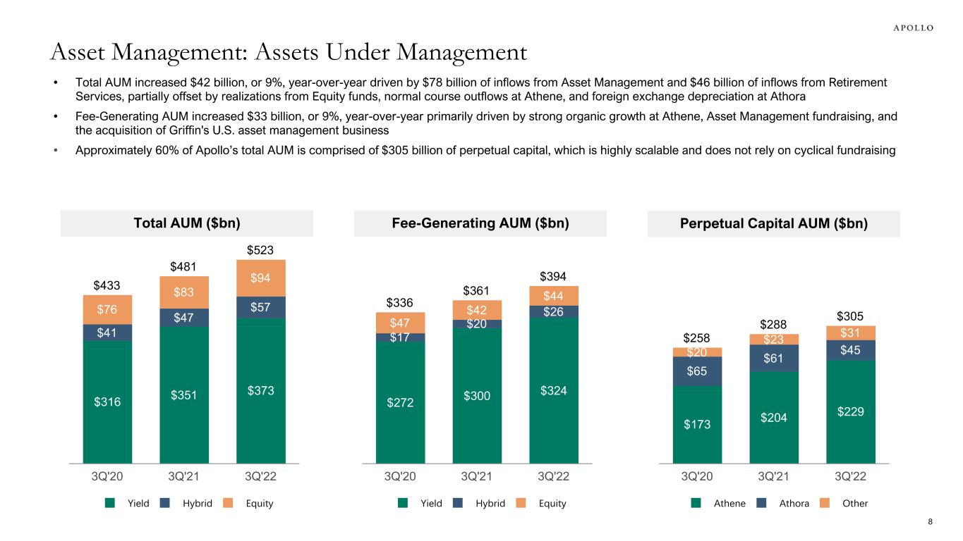 ($ in millions, except per share amounts) 3Q'21 2Q'22 3Q'22 % Change vs. 3Q'21 YTD'21 YTD'22 % Change vs. YTD'21 Management Fees Yield $299.2 $342.2 $366.4 22.5% $872.0 $1,042.0 19.5% Hybrid 43.5 52.7 52.9 21.6% 124.3 153.9 23.8% Equity 129.8 127.0 126.6 (2.5)% 398.9 377.3 (5.4)% Total Management fees 472.5 521.9 545.9 15.5% 1,395.2 1,573.2 12.8% Advisory and transaction fees, net 65.2 103.1 104.6 60.4% 203.8 271.8 33.4% Fee-related performance fees 19.8 11.7 20.0 1.0% 36.7 45.9 25.1% Fee Related Revenues $557.5 $636.7 $670.5 20.3% $1,635.7 $1,890.9 15.6% Fee-related compensation (160.7) (187.2) (193.8) 20.6% (476.7) (556.4) 16.7% Non-compensation expenses1 (76.7) (108.4) (112.1) 46.2% (218.3) (318.8) 46.0% Fee Related Earnings $320.1 $341.1 $364.6 13.9% $940.7 $1,015.7 8.0% FRE Per Share2 $0.73 $0.57 $0.61 NM $2.13 $1.70 NM FRE Margin 57.4% 53.6% 54.4% 57.5% 53.7% FRE Compensation Ratio 28.8% 29.4% 28.9% 29.1% 29.4% • Management fees increased 16% year-over-year, primarily driven by Yield fund inflows and deployment, growth at Athene, the contribution from Griffin Capital's ("Griffin") U.S. asset management business, the expiration of a fee waiver for a non-traded business development company Apollo manages, and growth within Hybrid funds • Generated record quarterly advisory and transaction fees, as Apollo remained active in providing creative and flexible financing solutions despite a broader slowdown in capital markets activity • Fee-related expenses increased year-over-year, reflecting previously communicated re-basing of cost structure to support the firm’s next phase of growth, as well as the full quarterly run-rate of costs associated with the acquisition of Griffin Asset Management Segment 1. Non-compensation expenses include placement fees of $0.9 million and $2.0 million, respectively, for 3Q'22 and YTD'22. 2. Per share amounts for fee related earnings on this page and subsequent pages may not be comparable to periods prior to the closing of the merger with Athene on January 1, 2022. 7