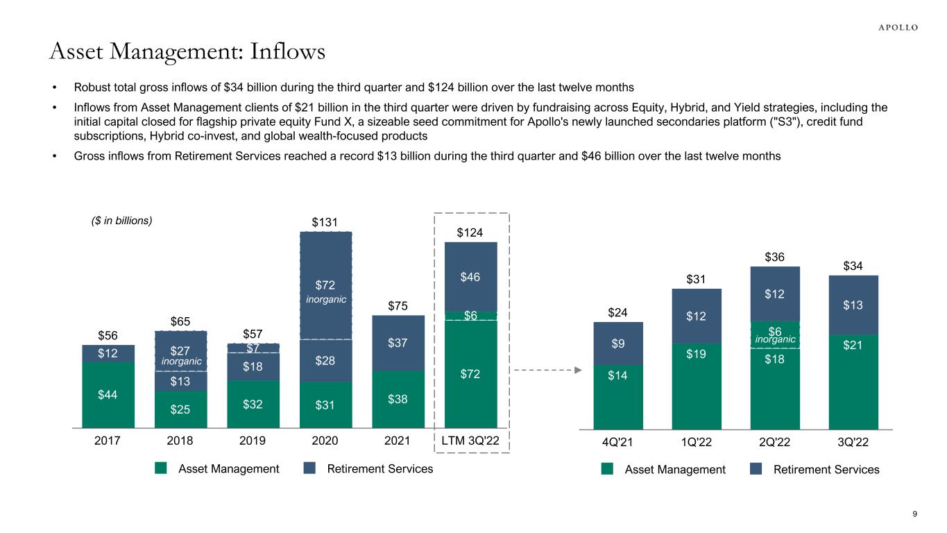 Total AUM ($bn) Fee-Generating AUM ($bn) • Total AUM increased $42 billion, or 9%, year-over-year driven by $78 billion of inflows from Asset Management and $46 billion of inflows from Retirement Services, partially offset by realizations from Equity funds, normal course outflows at Athene, and foreign exchange depreciation at Athora • Fee-Generating AUM increased $33 billion, or 9%, year-over-year primarily driven by strong organic growth at Athene, Asset Management fundraising, and the acquisition of Griffin's U.S. asset management business • Approximately 60% of Apollo’s total AUM is comprised of $305 billion of perpetual capital, which is highly scalable and does not rely on cyclical fundraising $433 $481 $523 $316 $351 $373 $41 $47 $57$76 $83 $94 Yield Hybrid Equity 3Q'20 3Q'21 3Q'22 $336 $361 $394 $272 $300 $324 $17 $20 $26 $47 $42 $44 Yield Hybrid Equity 3Q'20 3Q'21 3Q'22 Perpetual Capital AUM ($bn) $258 $288 $305 $173 $204 $229 $65 $61 $45$20 $23 $31 Athene Athora Other 3Q'20 3Q'21 3Q'22 8 Asset Management: Assets Under Management
