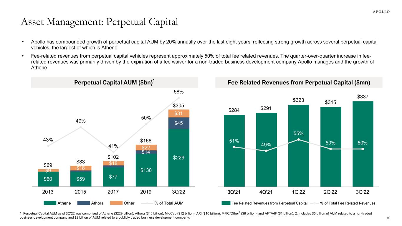 $56 $75 $124 $65 $57 $131 $44 $25 $32 $31 $38 $72 $6 $12 $13 $18 $28 $37 $46 $27 $7 $72 Asset Management Retirement Services 2017 2018 2019 2020 2021 LTM 3Q'22 • Robust total gross inflows of $34 billion during the third quarter and $124 billion over the last twelve months • Inflows from Asset Management clients of $21 billion in the third quarter were driven by fundraising across Equity, Hybrid, and Yield strategies, including the initial capital closed for flagship private equity Fund X, a sizeable seed commitment for Apollo's newly launched secondaries platform ("S3"), credit fund subscriptions, Hybrid co-invest, and global wealth-focused products • Gross inflows from Retirement Services reached a record $13 billion during the third quarter and $46 billion over the last twelve months ($ in billions) Asset Management: Inflows inorganic inorganic 9 $24 $31 $36 $34 $14 $19 $18 $21 $6 $9 $12 $12 $13 Asset Management Retirement Services 4Q'21 1Q'22 2Q'22 3Q'22 inorganic