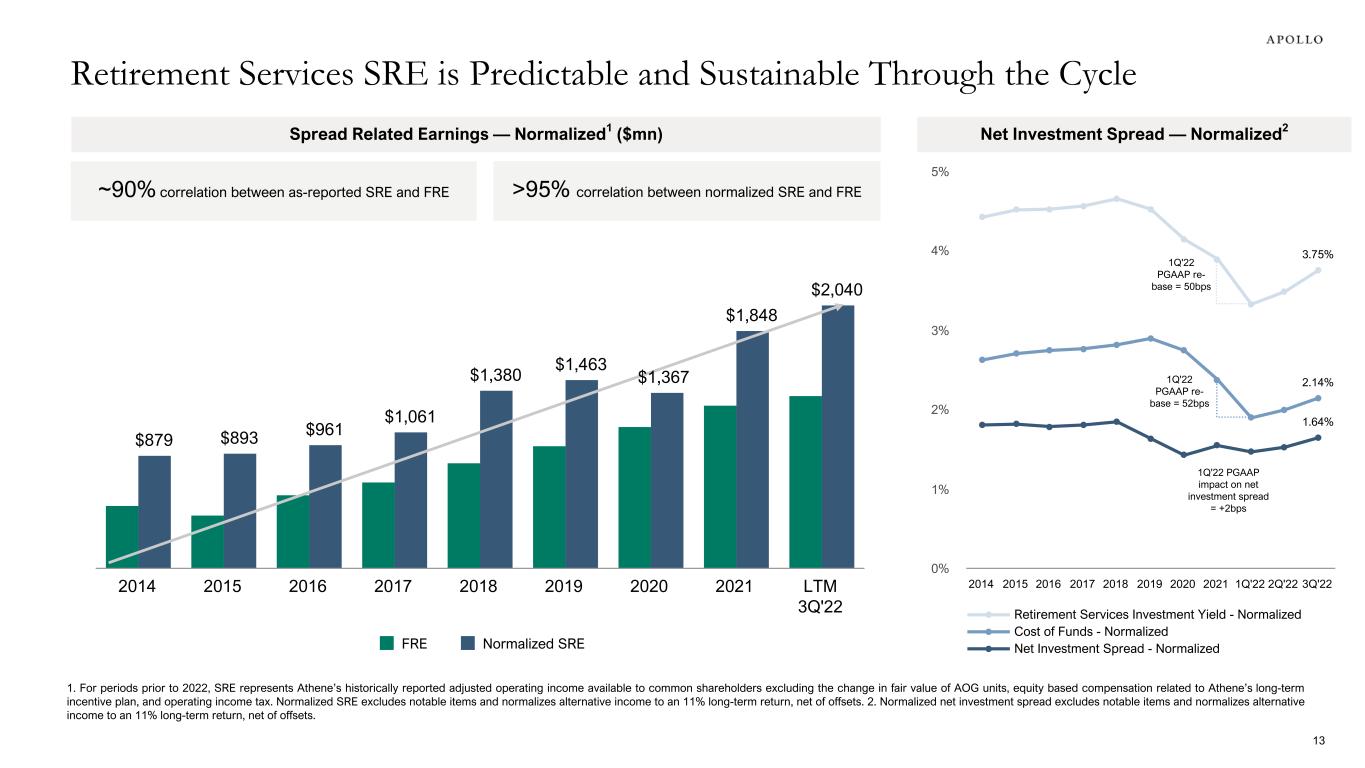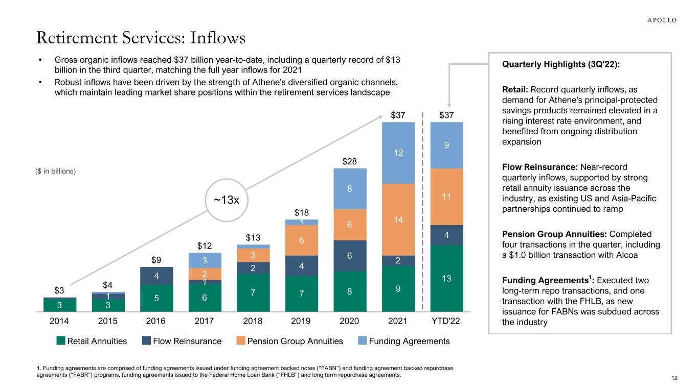 $3 $9 $4 $12 $13 $18 $28 $37 $37 3 3 5 6 7 7 8 9 13 1 4 1 2 4 6 2 4 2 3 6 6 14 11 3 1 8 12 9 Retail Annuities Flow Reinsurance Pension Group Annuities Funding Agreements 2014 2015 2016 2017 2018 2019 2020 2021 YTD'22 ~13x • Gross organic inflows reached $37 billion year-to-date, including a quarterly record of $13 billion in the third quarter, matching the full year inflows for 2021 • Robust inflows have been driven by the strength of Athene's diversified organic channels, which maintain leading market share positions within the retirement services landscape Quarterly Highlights (3Q'22): Retail: Record quarterly inflows, as demand for Athene's principal-protected savings products remained elevated in a rising interest rate environment, and benefited from ongoing distribution expansion Flow Reinsurance: Near-record quarterly inflows, supported by strong retail annuity issuance across the industry, as existing US and Asia-Pacific partnerships continued to ramp Pension Group Annuities: Completed four transactions in the quarter, including a $1.0 billion transaction with Alcoa Funding Agreements1: Executed two long-term repo transactions, and one transaction with the FHLB, as new issuance for FABNs was subdued across the industry ($ in billions) 1. Funding agreements are comprised of funding agreements issued under funding agreement backed notes (“FABN”) and funding agreement backed repurchase agreements (“FABR”) programs, funding agreements issued to the Federal Home Loan Bank (“FHLB”) and long term repurchase agreements. 12 Retirement Services: Inflows
