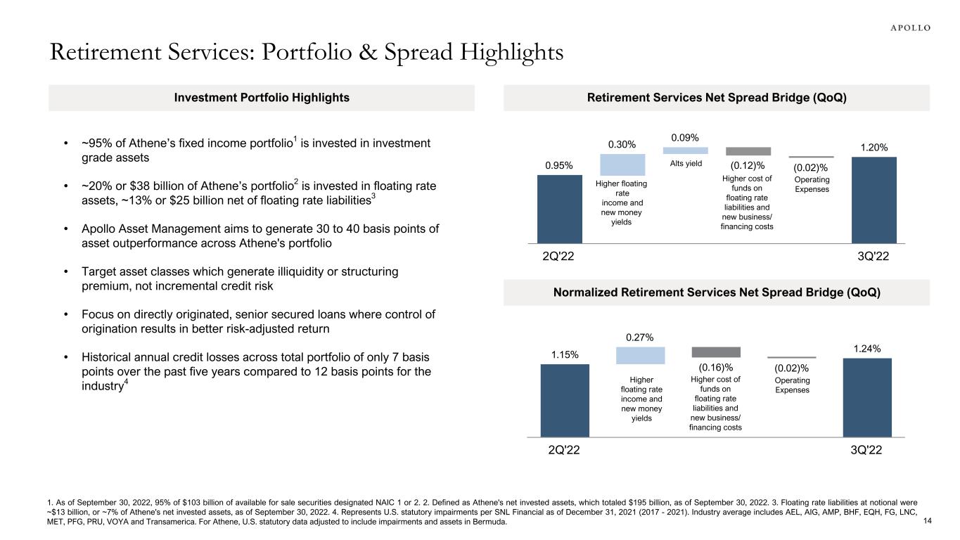 Spread Related Earnings — Normalized1 ($mn) Net Investment Spread — Normalized2 $879 $893 $961 $1,061 $1,380 $1,463 $1,848 $2,040 FRE Normalized SRE 2014 2015 2016 2017 2018 2019 2020 2021 LTM 3Q'22 3.75% 2.14% 1.64% Retirement Services Investment Yield - Normalized Cost of Funds - Normalized Net Investment Spread - Normalized 2014 2015 2016 2017 2018 2019 2020 2021 1Q'22 2Q'22 3Q'22 0% 1% 2% 3% 4% 5% 1Q'22 PGAAP impact on net investment spread = +2bps ~90% correlation between as-reported SRE and FRE >95% correlation between normalized SRE and FRE 1Q'22 PGAAP re- base = 50bps 1Q'22 PGAAP re- base = 52bps Retirement Services SRE is Predictable and Sustainable Through the Cycle 1. For periods prior to 2022, SRE represents Athene’s historically reported adjusted operating income available to common shareholders excluding the change in fair value of AOG units, equity based compensation related to Athene’s long-term incentive plan, and operating income tax. Normalized SRE excludes notable items and normalizes alternative income to an 11% long-term return, net of offsets. 2. Normalized net investment spread excludes notable items and normalizes alternative income to an 11% long-term return, net of offsets. 13 $1,367