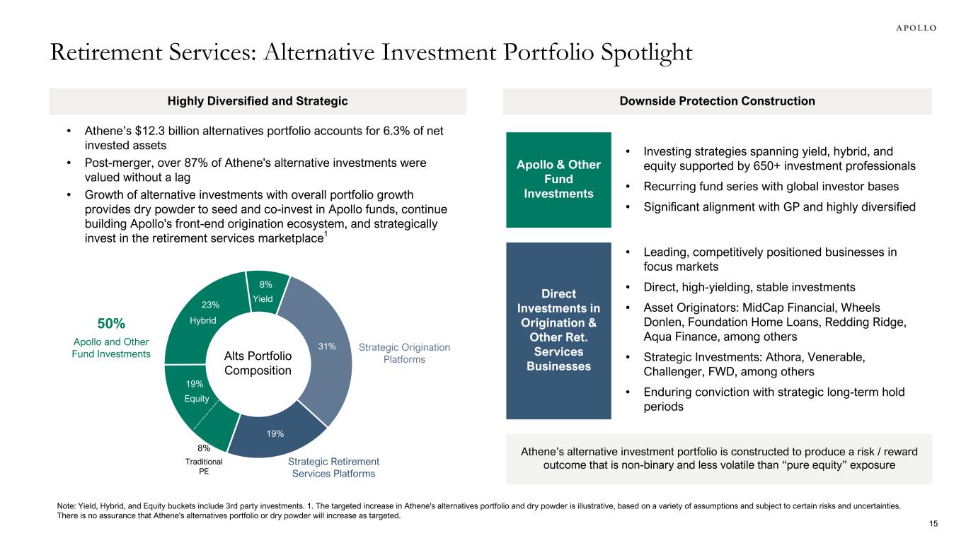 1.15% 0.27% (0.16)% (0.02)% 1.24% 2Q'22 3Q'22 0.95% 0.30% 0.09% (0.12)% (0.02)% 1.20% 2Q'22 3Q'22 Investment Portfolio Highlights Retirement Services Net Spread Bridge (QoQ) Normalized Retirement Services Net Spread Bridge (QoQ) • ~95% of Athene’s fixed income portfolio1 is invested in investment grade assets • ~20% or $38 billion of Athene’s portfolio2 is invested in floating rate assets, ~13% or $25 billion net of floating rate liabilities3 • Apollo Asset Management aims to generate 30 to 40 basis points of asset outperformance across Athene's portfolio • Target asset classes which generate illiquidity or structuring premium, not incremental credit risk • Focus on directly originated, senior secured loans where control of origination results in better risk-adjusted return • Historical annual credit losses across total portfolio of only 7 basis points over the past five years compared to 12 basis points for the industry4 Higher floating rate income and new money yields Alts yield Higher cost of funds on floating rate liabilities and new business/ financing costs Higher floating rate income and new money yields Higher cost of funds on floating rate liabilities and new business/ financing costs Operating Expenses Retirement Services: Portfolio & Spread Highlights 1. As of September 30, 2022, 95% of $103 billion of available for sale securities designated NAIC 1 or 2. 2. Defined as Athene's net invested assets, which totaled $195 billion, as of September 30, 2022. 3. Floating rate liabilities at notional were ~$13 billion, or ~7% of Athene's net invested assets, as of September 30, 2022. 4. Represents U.S. statutory impairments per SNL Financial as of December 31, 2021 (2017 - 2021). Industry average includes AEL, AIG, AMP, BHF, EQH, FG, LNC, MET, PFG, PRU, VOYA and Transamerica. For Athene, U.S. statutory data adjusted to include impairments and assets in Bermuda. 14 Operating Expenses