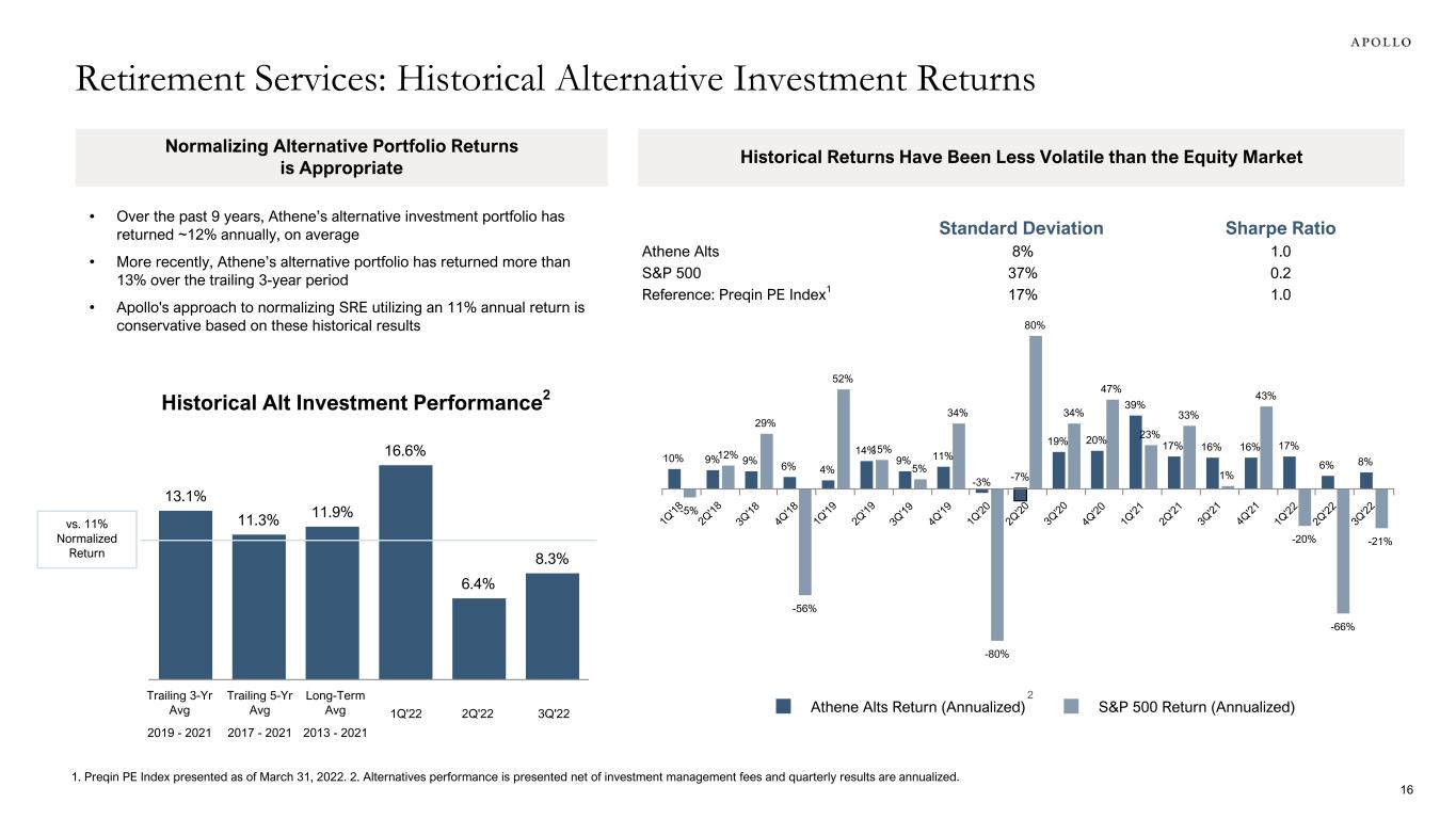 10% 9% 9% 6% 4% 14% 9% 11% -3% 19% 20% 39% 17% 16% 16% 17% 6% 8% -5% 12% 29% -56% 52% 15% 5% 34% -80% 80% 34% 47% 23% 33% 1% 43% -20% -66% -21% Athene Alts Return (Annualized) S&P 500 Return (Annualized) 1Q '18 2Q '18 3Q '18 4Q '18 1Q '19 2Q '19 3Q '19 4Q '19 1Q '20 2Q '20 3Q '20 4Q '20 1Q '21 2Q '21 3Q '21 4Q '21 1Q '22 2Q '22 3Q '22 Normalizing Alternative Portfolio Returns is Appropriate Historical Returns Have Been Less Volatile than the Equity Market • Over the past 9 years, Athene’s alternative investment portfolio has returned ~12% annually, on average • More recently, Athene’s alternative portfolio has returned more than 13% over the trailing 3-year period • Apollo's approach to normalizing SRE utilizing an 11% annual return is conservative based on these historical results 13.1% 11.3% 11.9% 16.6% 6.4% 8.3% Historical Alt Investment Performance2 Trailing 3-Yr Avg Trailing 5-Yr Avg Long-Term Avg 1Q'22 2Q'22 3Q'22 2019 - 2021 2017 - 2021 2013 - 2021 vs. 11% Normalized Return Standard Deviation Sharpe Ratio Athene Alts 8% 1.0 S&P 500 37% 0.2 Reference: Preqin PE Index1 17% 1.0 2 1. Preqin PE Index presented as of March 31, 2022. 2. Alternatives performance is presented net of investment management fees and quarterly results are annualized. 16 Retirement Services: Historical Alternative Investment Returns -7%