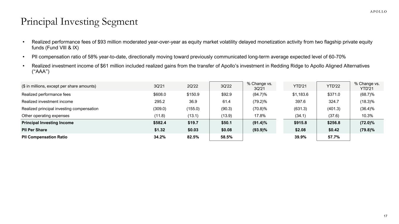 • Realized performance fees of $93 million moderated year-over-year as equity market volatility delayed monetization activity from two flagship private equity funds (Fund VIII & IX) • PII compensation ratio of 58% year-to-date, directionally moving toward previously communicated long-term average expected level of 60-70% • Realized investment income of $61 million included realized gains from the transfer of Apollo’s investment in Redding Ridge to Apollo Aligned Alternatives (“AAA”) ($ in millions, except per share amounts) 3Q'21 2Q'22 3Q'22 % Change vs. 3Q'21 YTD'21 YTD'22 % Change vs. YTD'21 Realized performance fees $608.0 $150.9 $92.9 (84.7)% $1,183.6 $371.0 (68.7)% Realized investment income 295.2 36.9 61.4 (79.2)% 397.6 324.7 (18.3)% Realized principal investing compensation (309.0) (155.0) (90.3) (70.8)% (631.3) (401.3) (36.4)% Other operating expenses (11.8) (13.1) (13.9) 17.8% (34.1) (37.6) 10.3% Principal Investing Income $582.4 $19.7 $50.1 (91.4)% $915.8 $256.8 (72.0)% PII Per Share $1.32 $0.03 $0.08 (93.9)% $2.08 $0.42 (79.8)% PII Compensation Ratio 34.2% 82.5% 58.5% 39.9% 57.7% Principal Investing Segment 17