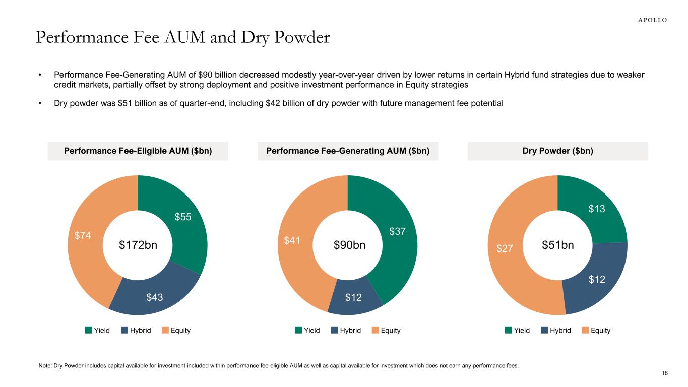 • “Assets Under Management”, or “AUM”, refers to the assets of the funds, partnerships and accounts to which Apollo provides investment management, advisory, or certain other investment-related services, including, without limitation, capital that such funds, partnerships and accounts have the right to call from investors pursuant to capital commitments. AUM equals the sum of: 1. the net asset value (“NAV”), plus used or available leverage and/or capital commitments, or gross assets plus capital commitments, of the yield and certain hybrid funds, partnerships and accounts for which we provide investment management or advisory services, other than certain collateralized loan obligations (“CLOs”), collateralized debt obligations (“CDOs”), and certain perpetual capital vehicles, which have a fee-generating basis other than the mark-to-market value of the underlying assets; for certain perpetual capital vehicles in yield, gross asset value plus available financing capacity; 2. the fair value of the investments of equity and certain hybrid funds, partnerships and accounts Apollo manages or advise, plus the capital that such funds, partnerships and accounts are entitled to call from investors pursuant to capital commitments, plus portfolio level financings; 3. the gross asset value associated with the reinsurance investments of the portfolio company assets Apollo manages or advises; and 4. the fair value of any other assets that Apollo manages or advises for the funds, partnerships and accounts to which Apollo provides investment management, advisory, or certain other investment-related services, plus unused credit facilities, including capital commitments to such funds, partnerships and accounts for investments that may require pre-qualification or other conditions before investment plus any other capital commitments to such funds, partnerships and accounts available for investment that are not otherwise included in the clauses above. Apollo’s AUM measure includes Assets Under Management for which Apollo charges either nominal or zero fees. Apollo’s AUM measure also includes assets for which Apollo does not have investment discretion, including certain assets for which Apollo earns only investment-related service fees, rather than management or advisory fees. Apollo’s definition of AUM is not based on any definition of Assets Under Management contained in its governing documents or in any Apollo Fund management agreements. Apollo considers multiple factors for determining what should be included in its definition of AUM. Such factors include but are not limited to (1) Apollo’s ability to influence the investment decisions for existing and available assets; (2) Apollo’s ability to generate income from the underlying assets in its funds; and (3) the AUM measures that Apollo uses internally or believe are used by other investment managers. Given the differences in the investment strategies and structures among other alternative investment managers, Apollo’s calculation of AUM may differ from the calculations employed by other investment managers and, as a result, this measure may not be directly comparable to similar measures presented by other investment managers. Apollo’s calculation also differs from the manner in which its affiliates registered with the SEC report “Regulatory Assets Under Management” on Form ADV and Form PF in various ways. Apollo uses AUM, Gross capital deployed and Dry powder as performance measurements of its investment activities, as well as to monitor fund size in relation to professional resource and infrastructure needs. • “Fee-Generating AUM” or “FGAUM” consists of assets of the funds, partnerships and accounts to which we provide investment management, advisory, or certain other investment-related services and on which we earn management fees, monitoring fees or other investment-related fees pursuant to management or other fee agreements on a basis that varies among the Apollo funds, partnerships and accounts. Management fees are normally based on “net asset value,” “gross assets,” “adjusted par asset value,” “adjusted cost of all unrealized portfolio investments,” “capital commitments,” “adjusted assets,” “stockholders’ equity,” “invested capital” or “capital contributions,” each as defined in the applicable management agreement. Monitoring fees, also referred to as advisory fees, with respect to the structured portfolio company investments of the funds, partnerships and accounts we manage or advise, are generally based on the total value of such structured portfolio company investments, which normally includes leverage, less any portion of such total value that is already considered in Fee-Generating AUM. • “Performance Fee-Eligible AUM” or “PFEAUM” refers to the AUM that may eventually produce performance fees. All funds for which we are entitled to receive a performance fee allocation or incentive fee are included in Performance Fee-Eligible AUM, which consists of the following: • “Performance Fee-Generating AUM”, which refers to invested capital of the funds, partnerships and accounts we manage, advise, or to which we provide certain other investment-related services, that is currently above its hurdle rate or preferred return, and profit of such funds, partnerships and accounts is being allocated to, or earned by, the general partner in accordance with the applicable limited partnership agreements or other governing agreements; • “AUM Not Currently Generating Performance Fees”, which refers to invested capital of the funds, partnerships and accounts we manage, advise, or to which we provide certain other investment-related services that is currently below its hurdle rate or preferred return; and • “Uninvested Performance Fee-Eligible AUM”, which refers to capital of the funds, partnerships and accounts we manage, advise, or to which we provide ce