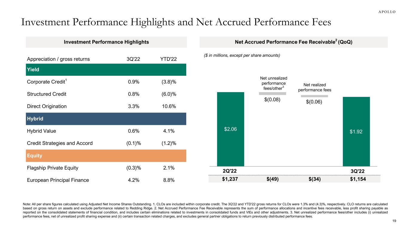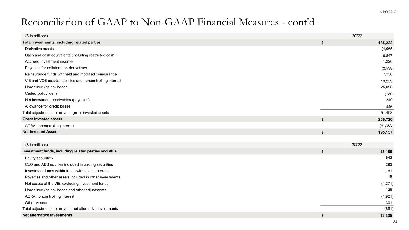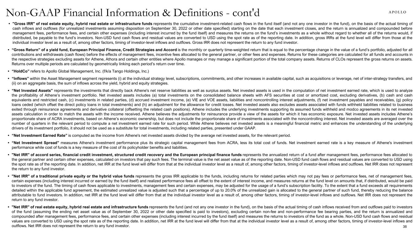 • "Gross IRR" of real estate equity, hybrid real estate or infrastructure funds represents the cumulative investment-related cash flows in the fund itself (and not any one investor in the fund), on the basis of the actual timing of cash inflows and outflows (for unrealized investments assuming disposition on September 30, 2022 or other date specified) starting on the date that each investment closes, and the return is annualized and compounded before management fees, performance fees, and certain other expenses (including interest incurred by the fund itself) and measures the returns on the fund’s investments as a whole without regard to whether all of the returns would, if distributed, be payable to the fund’s investors. Non-USD fund cash flows and residual values are converted to USD using the spot rate as of the reporting date. In addition, gross IRRs at the fund level will differ from those at the individual investor level as a result of, among other factors, timing of investor-level inflows and outflows. Gross IRR does not represent the return to any fund investor. • “Gross Return” of a yield fund, European Principal Finance, Credit Strategies and Accord is the monthly or quarterly time-weighted return that is equal to the percentage change in the value of a fund’s portfolio, adjusted for all contributions and withdrawals (cash flows) before the effects of management fees, incentive fees allocated to the general partner, or other fees and expenses. Returns for these categories are calculated for all funds and accounts in the respective strategies excluding assets for Athene, Athora and certain other entities where Apollo manages or may manage a significant portion of the total company assets. Returns of CLOs represent the gross returns on assets. Returns over multiple periods are calculated by geometrically linking each period’s return over time. • “HoldCo” refers to Apollo Global Management, Inc. (f/k/a Tango Holdings, Inc.) • “Inflows” within the Asset Management segment represents (i) at the individual strategy level, subscriptions, commitments, and other increases in available capital, such as acquisitions or leverage, net of inter-strategy transfers, and (ii) on an aggregate basis, the sum of inflows across the yield, hybrid and equity strategies. • “Net Invested Assets” represents the investments that directly back Athene's net reserve liabilities as well as surplus assets. Net invested assets is used in the computation of net investment earned rate, which is used to analyze the profitability of Athene’s investment portfolio. Net invested assets includes (a) total investments on the consolidated balance sheets with AFS securities at cost or amortized cost, excluding derivatives, (b) cash and cash equivalents and restricted cash, (c) investments in related parties, (d) accrued investment income, (e) VIE and VOE assets, liabilities and noncontrolling interest adjustments, (f) net investment payables and receivables, (g) policy loans ceded (which offset the direct policy loans in total investments) and (h) an adjustment for the allowance for credit losses. Net invested assets also excludes assets associated with funds withheld liabilities related to business exited through reinsurance agreements and derivative collateral (offsetting the related cash positions). Athene includes the underlying investments supporting its assumed funds withheld and modco agreements in its net invested assets calculation in order to match the assets with the income received. Athene believes the adjustments for reinsurance provide a view of the assets for which it has economic exposure. Net invested assets includes Athene’s proportionate share of ACRA investments, based on Athene’s economic ownership, but does not include the proportionate share of investments associated with the noncontrolling interest. Net invested assets are averaged over the number of quarters in the relevant period to compute a net investment earned rate for such period. While Athene believes net invested assets is a meaningful financial metric and enhances the understanding of the underlying drivers of its investment portfolio, it should not be used as a substitute for total investments, including related parties, presented under GAAP. • “Net Investment Earned Rate” is computed as the income from Athene's net invested assets divided by the average net invested assets, for the relevant period. • “Net Investment Spread” measures Athene's investment performance plus its strategic capital management fees from ACRA, less its total cost of funds. Net investment earned rate is a key measure of Athene's investment performance while cost of funds is a key measure of the cost of its policyholder benefits and liabilities. • "Net IRR" of accord series, financial credit investment, structured credit recovery and the European principal finance funds represents the annualized return of a fund after management fees, performance fees allocated to the general partner and certain other expenses, calculated on investors that pay such fees. The terminal value is the net asset value as of the reporting date. Non-USD fund cash flows and residual values are converted to USD using the spot rate as of the reporting date. In addition, net IRR at the fund level will differ from that at the individual investor level as a result of, among other factors, timing of investor-level inflows and outflows. Net IRR does not represent the return to any fund investor. • "Net IRR" of a traditional private equity or the hybrid value funds represents the gross IRR applicable to the funds, including returns for related parties which may not pay fees or performance fees, net of management fees, certain expenses (including interest incurred or earned by the fund itself) and realized performance fees all offset to the extent of interest income, and measures returns at the fund level on amounts that, if distributed, would