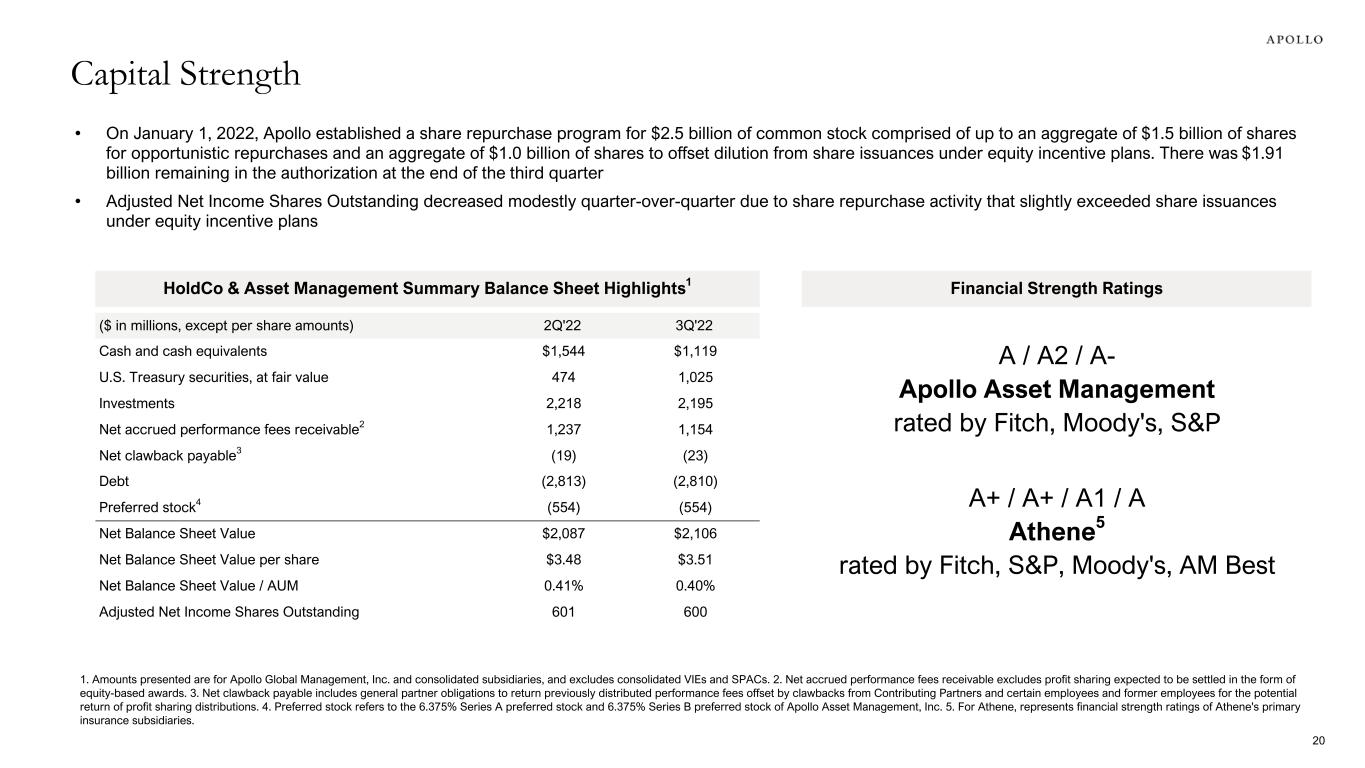 • On January 1, 2022, Apollo established a share repurchase program for $2.5 billion of common stock comprised of up to an aggregate of $1.5 billion of shares for opportunistic repurchases and an aggregate of $1.0 billion of shares to offset dilution from share issuances under equity incentive plans. There was $1.91 billion remaining in the authorization at the end of the third quarter • Adjusted Net Income Shares Outstanding decreased modestly quarter-over-quarter due to share repurchase activity that slightly exceeded share issuances under equity incentive plans HoldCo & Asset Management Summary Balance Sheet Highlights1 Financial Strength Ratings ($ in millions, except per share amounts) 2Q'22 3Q'22 Cash and cash equivalents $1,544 $1,119 U.S. Treasury securities, at fair value 474 1,025 Investments 2,218 2,195 Net accrued performance fees receivable2 1,237 1,154 Net clawback payable3 (19) (23) Debt (2,813) (2,810) Preferred stock4 (554) (554) Net Balance Sheet Value $2,087 $2,106 Net Balance Sheet Value per share $3.48 $3.51 Net Balance Sheet Value / AUM 0.41% 0.40% Adjusted Net Income Shares Outstanding 601 600 A / A2 / A- Apollo Asset Management rated by Fitch, Moody's, S&P A+ / A+ / A1 / A Athene5 rated by Fitch, S&P, Moody's, AM Best 1. Amounts presented are for Apollo Global Management, Inc. and consolidated subsidiaries, and excludes consolidated VIEs and SPACs. 2. Net accrued performance fees receivable excludes profit sharing expected to be settled in the form of equity-based awards. 3. Net clawback payable includes general partner obligations to return previously distributed performance fees offset by clawbacks from Contributing Partners and certain employees and former employees for the potential return of profit sharing distributions. 4. Preferred stock refers to the 6.375% Series A preferred stock and 6.375% Series B preferred stock of Apollo Asset Management, Inc. 5. For Athene, represents financial strength ratings of Athene's primary insurance subsidiaries. Capital Strength 20