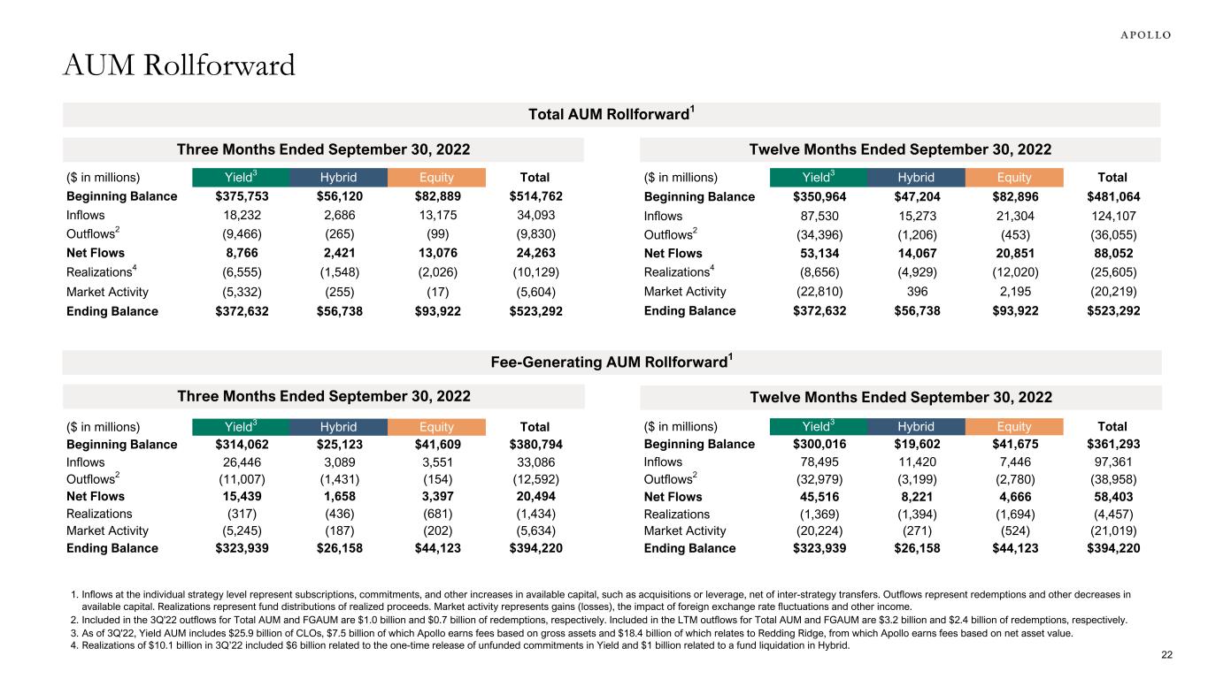 ($ in millions) Yield3 Hybrid Equity Total Beginning Balance $375,753 $56,120 $82,889 $514,762 Inflows 18,232 2,686 13,175 34,093 Outflows2 (9,466) (265) (99) (9,830) Net Flows 8,766 2,421 13,076 24,263 Realizations4 (6,555) (1,548) (2,026) (10,129) Market Activity (5,332) (255) (17) (5,604) Ending Balance $372,632 $56,738 $93,922 $523,292 Three Months Ended September 30, 2022 ($ in millions) Yield3 Hybrid Equity Total Beginning Balance $350,964 $47,204 $82,896 $481,064 Inflows 87,530 15,273 21,304 124,107 Outflows2 (34,396) (1,206) (453) (36,055) Net Flows 53,134 14,067 20,851 88,052 Realizations4 (8,656) (4,929) (12,020) (25,605) Market Activity (22,810) 396 2,195 (20,219) Ending Balance $372,632 $56,738 $93,922 $523,292 Twelve Months Ended September 30, 2022 ($ in millions) Yield3 Hybrid Equity Total Beginning Balance $314,062 $25,123 $41,609 $380,794 Inflows 26,446 3,089 3,551 33,086 Outflows2 (11,007) (1,431) (154) (12,592) Net Flows 15,439 1,658 3,397 20,494 Realizations (317) (436) (681) (1,434) Market Activity (5,245) (187) (202) (5,634) Ending Balance $323,939 $26,158 $44,123 $394,220 Three Months Ended September 30, 2022 ($ in millions) Yield3 Hybrid Equity Total Beginning Balance $300,016 $19,602 $41,675 $361,293 Inflows 78,495 11,420 7,446 97,361 Outflows2 (32,979) (3,199) (2,780) (38,958) Net Flows 45,516 8,221 4,666 58,403 Realizations (1,369) (1,394) (1,694) (4,457) Market Activity (20,224) (271) (524) (21,019) Ending Balance $323,939 $26,158 $44,123 $394,220 Twelve Months Ended September 30, 2022 Fee-Generating AUM Rollforward1 Total AUM Rollforward1 1. Inflows at the individual strategy level represent subscriptions, commitments, and other increases in available capital, such as acquisitions or leverage, net of inter-strategy transfers. Outflows represent redemptions and other decreases in available capital. Realizations represent fund distributions of realized proceeds. Market activity represents gains (losses), the impact of foreign exchange rate fluctuations and other income. 2. Included in the 3Q'22 outflows for Total AUM and FGAUM are $1.0 billion and $0.7 billion of redemptions, respectively. Included in the LTM outflows for Total AUM and FGAUM are $3.2 billion and $2.4 billion of redemptions, respectively. 3. As of 3Q'22, Yield AUM includes $25.9 billion of CLOs, $7.5 billion of which Apollo earns fees based on gross assets and $18.4 billion of which relates to Redding Ridge, from which Apollo earns fees based on net asset value. 4. Realizations of $10.1 billion in 3Q’22 included $6 billion related to the one-time release of unfunded commitments in Yield and $1 billion related to a fund liquidation in Hybrid. AUM Rollforward 22