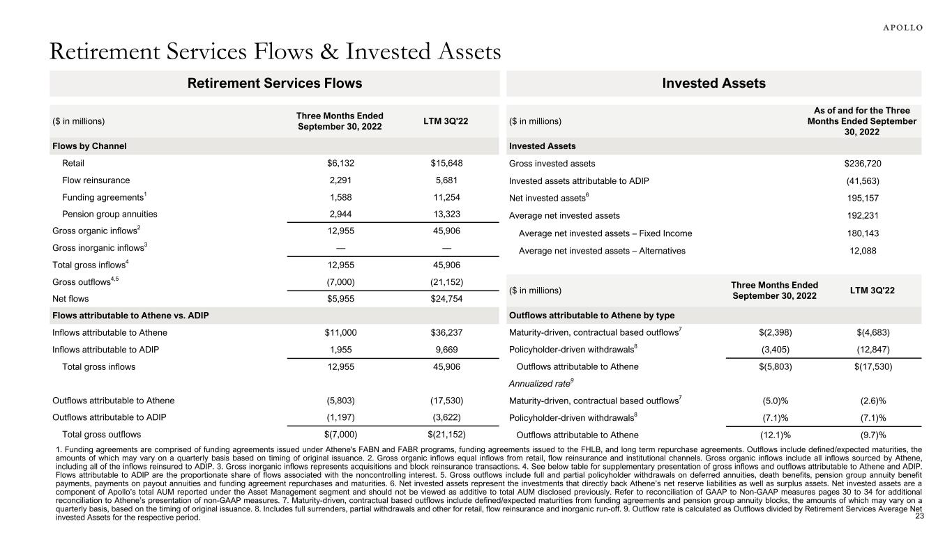 ($ in millions) Three Months Ended September 30, 2022 LTM 3Q'22 Flows by Channel Retail $6,132 $15,648 Flow reinsurance 2,291 5,681 Funding agreements1 1,588 11,254 Pension group annuities 2,944 13,323 Gross organic inflows2 12,955 45,906 Gross inorganic inflows3 — — Total gross inflows4 12,955 45,906 Gross outflows4,5 (7,000) (21,152) Net flows $5,955 $24,754 Flows attributable to Athene vs. ADIP Inflows attributable to Athene $11,000 $36,237 Inflows attributable to ADIP 1,955 9,669 Total gross inflows 12,955 45,906 Outflows attributable to Athene (5,803) (17,530) Outflows attributable to ADIP (1,197) (3,622) Total gross outflows $(7,000) $(21,152) ($ in millions) As of and for the Three Months Ended September 30, 2022 Invested Assets Gross invested assets $236,720 Invested assets attributable to ADIP (41,563) Net invested assets6 195,157 Average net invested assets 192,231 Average net invested assets – Fixed Income 180,143 Average net invested assets – Alternatives 12,088 Retirement Services Flows Invested Assets 23 1. Funding agreements are comprised of funding agreements issued under Athene's FABN and FABR programs, funding agreements issued to the FHLB, and long term repurchase agreements. Outflows include defined/expected maturities, the amounts of which may vary on a quarterly basis based on timing of original issuance. 2. Gross organic inflows equal inflows from retail, flow reinsurance and institutional channels. Gross organic inflows include all inflows sourced by Athene, including all of the inflows reinsured to ADIP. 3. Gross inorganic inflows represents acquisitions and block reinsurance transactions. 4. See below table for supplementary presentation of gross inflows and outflows attributable to Athene and ADIP. Flows attributable to ADIP are the proportionate share of flows associated with the noncontrolling interest. 5. Gross outflows include full and partial policyholder withdrawals on deferred annuities, death benefits, pension group annuity benefit payments, payments on payout annuities and funding agreement repurchases and maturities. 6. Net invested assets represent the investments that directly back Athene’s net reserve liabilities as well as surplus assets. Net invested assets are a component of Apollo’s total AUM reported under the Asset Management segment and should not be viewed as additive to total AUM disclosed previously. Refer to reconciliation of GAAP to Non-GAAP measures pages 30 to 34 for additional reconciliation to Athene’s presentation of non-GAAP measures. 7. Maturity-driven, contractual based outflows include defined/expected maturities from funding agreements and pension group annuity blocks, the amounts of which may vary on a quarterly basis, based on the timing of original issuance. 8. Includes full surrenders, partial withdrawals and other for retail, flow reinsurance and inorganic run-off. 9. Outflow rate is calculated as Outflows divided by Retirement Services Average Net invested Assets for the respective period. ($ in millions) Three Months Ended September 30, 2022 LTM 3Q'22 Outflows attributable to Athene by type Maturity-driven, contractual based outflows7 $(2,398) $(4,683) Policyholder-driven withdrawals8 (3,405) (12,847) Outflows attributable to Athene $(5,803) $(17,530) Annualized rate9 Maturity-driven, contractual based outflows7 (5.0)% (2.6)% Policyholder-driven withdrawals8 (7.1)% (7.1)% Outflows attributable to Athene (12.1)% (9.7)% Retirement Services Flows & Invested Assets