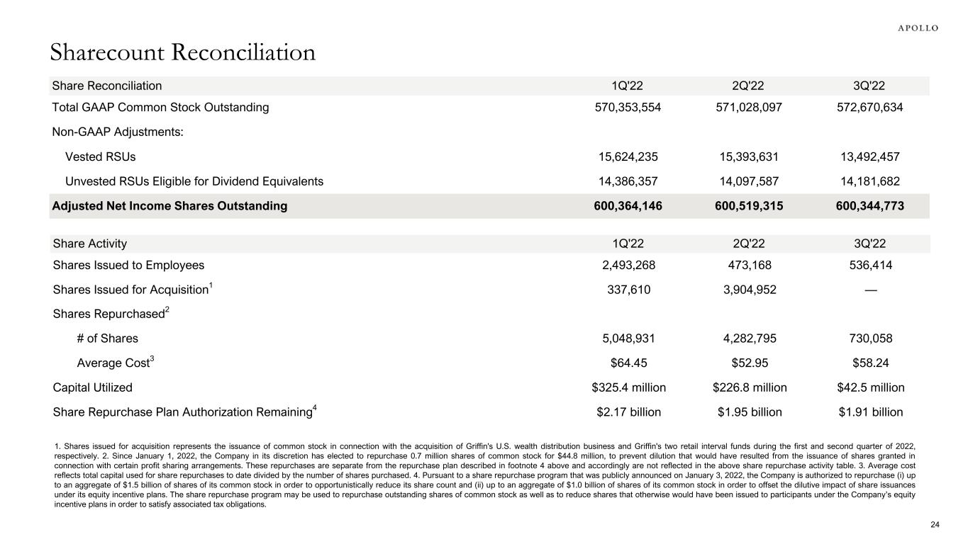Share Reconciliation 1Q'22 2Q'22 3Q'22 Total GAAP Common Stock Outstanding 570,353,554 571,028,097 572,670,634 Non-GAAP Adjustments: Vested RSUs 15,624,235 15,393,631 13,492,457 Unvested RSUs Eligible for Dividend Equivalents 14,386,357 14,097,587 14,181,682 Adjusted Net Income Shares Outstanding 600,364,146 600,519,315 600,344,773 1. Shares issued for acquisition represents the issuance of common stock in connection with the acquisition of Griffin's U.S. wealth distribution business and Griffin's two retail interval funds during the first and second quarter of 2022, respectively. 2. Since January 1, 2022, the Company in its discretion has elected to repurchase 0.7 million shares of common stock for $44.8 million, to prevent dilution that would have resulted from the issuance of shares granted in connection with certain profit sharing arrangements. These repurchases are separate from the repurchase plan described in footnote 4 above and accordingly are not reflected in the above share repurchase activity table. 3. Average cost reflects total capital used for share repurchases to date divided by the number of shares purchased. 4. Pursuant to a share repurchase program that was publicly announced on January 3, 2022, the Company is authorized to repurchase (i) up to an aggregate of $1.5 billion of shares of its common stock in order to opportunistically reduce its share count and (ii) up to an aggregate of $1.0 billion of shares of its common stock in order to offset the dilutive impact of share issuances under its equity incentive plans. The share repurchase program may be used to repurchase outstanding shares of common stock as well as to reduce shares that otherwise would have been issued to participants under the Company’s equity incentive plans in order to satisfy associated tax obligations. Share Activity 1Q'22 2Q'22 3Q'22 Shares Issued to Employees 2,493,268 473,168 536,414 Shares Issued for Acquisition1 337,610 3,904,952 — Shares Repurchased2 # of Shares 5,048,931 4,282,795 730,058 Average Cost3 $64.45 $52.95 $58.24 Capital Utilized $325.4 million $226.8 million $42.5 million Share Repurchase Plan Authorization Remaining4 $2.17 billion $1.95 billion $1.91 billion Sharecount Reconciliation 24