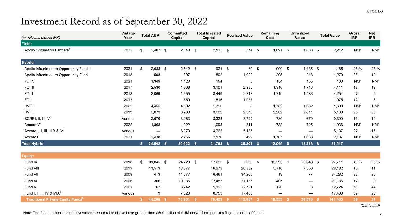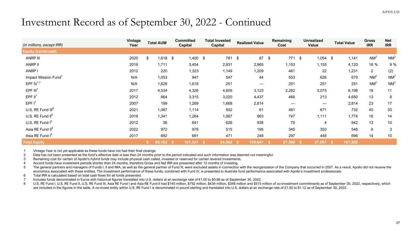 (in millions, except IRR) Vintage Year Total AUM Committed Capital Total Invested Capital Realized Value Remaining Cost Unrealized Value Total Value Gross IRR Net IRR Yield: Apollo Origination Partners1 2022 $ 2,407 $ 2,348 $ 2,135 $ 374 $ 1,891 $ 1,838 $ 2,212 NM2 NM2 Hybrid: Apollo Infrastructure Opportunity Fund II 2021 $ 2,683 $ 2,542 $ 921 $ 30 $ 900 $ 1,135 $ 1,165 28 % 23 % Apollo Infrastructure Opportunity Fund 2018 598 897 802 1,022 205 248 1,270 25 19 FCI IV 2021 1,349 1,123 154 5 154 155 160 NM2 NM2 FCI III 2017 2,530 1,906 3,101 2,395 1,810 1,716 4,111 16 13 FCI II 2013 2,069 1,555 3,449 2,818 1,719 1,436 4,254 7 5 FCI I 2012 — 559 1,516 1,975 — — 1,975 12 8 HVF II 2022 4,455 4,592 1,790 8 1,782 1,682 1,690 NM2 NM2 HVF I 2019 3,873 3,238 3,682 2,372 2,202 2,811 5,183 25 20 SCRF I, II, III, IV3 Various 2,679 3,963 8,323 8,729 780 670 9,399 13 10 Accord V4 2022 1,868 1,922 1,095 311 788 725 1,036 NM2 NM2 Accord I, II, III, III B & IV4 Various — 6,070 4,765 5,137 — — 5,137 22 17 Accord+ 2021 2,438 2,255 2,170 499 1,705 1,638 2,137 NM2 NM2 Total Hybrid $ 24,542 $ 30,622 $ 31,768 $ 25,301 $ 12,045 $ 12,216 $ 37,517 Equity: Fund IX 2018 $ 31,845 $ 24,729 $ 17,293 $ 7,063 $ 13,293 $ 20,648 $ 27,711 40 % 26 % Fund VIII 2013 11,513 18,377 16,273 20,332 5,716 7,850 28,182 15 11 Fund VII 2008 413 14,677 16,461 34,205 19 77 34,282 33 25 Fund VI 2006 366 10,136 12,457 21,136 405 — 21,136 12 9 Fund V 2001 62 3,742 5,192 12,721 120 3 12,724 61 44 Fund I, II, III, IV & MIA5 Various 9 7,320 8,753 17,400 — — 17,400 39 26 Traditional Private Equity Funds6 $ 44,208 $ 78,981 $ 76,429 $ 112,857 $ 19,553 $ 28,578 $ 141,435 39 24 (Continued) Note: The funds included in the investment record table above have greater than $500 million of AUM and/or form part of a flagship series of funds. Investment Record as of September 30, 2022 26