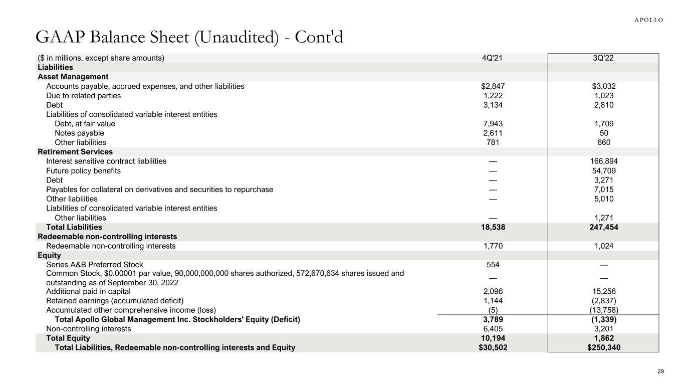 ($ in millions, except share amounts) 4Q'21 3Q'22 Liabilities Asset Management Accounts payable, accrued expenses, and other liabilities $2,847 $3,032 Due to related parties 1,222 1,023 Debt 3,134 2,810 Liabilities of consolidated variable interest entities Debt, at fair value 7,943 1,709 Notes payable 2,611 50 Other liabilities 781 660 Retirement Services Interest sensitive contract liabilities — 166,894 Future policy benefits — 54,709 Debt — 3,271 Payables for collateral on derivatives and securities to repurchase — 7,015 Other liabilities — 5,010 Liabilities of consolidated variable interest entities Other liabilities — 1,271 Total Liabilities 18,538 247,454 Redeemable non-controlling interests Redeemable non-controlling interests 1,770 1,024 Equity Series A&B Preferred Stock 554 — Common Stock, $0.00001 par value, 90,000,000,000 shares authorized, 572,670,634 shares issued and outstanding as of September 30, 2022 — — Additional paid in capital 2,096 15,256 Retained earnings (accumulated deficit) 1,144 (2,837) Accumulated other comprehensive income (loss) (5) (13,758) Total Apollo Global Management Inc. Stockholders' Equity (Deficit) 3,789 (1,339) Non-controlling interests 6,405 3,201 Total Equity 10,194 1,862 Total Liabilities, Redeemable non-controlling interests and Equity $30,502 $250,340 GAAP Balance Sheet (Unaudited) - Cont'd 29