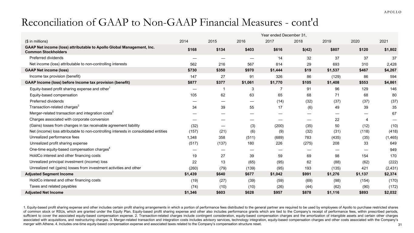 Year ended December 31, ($ in millions) 2014 2015 2016 2017 2018 2019 2020 2021 GAAP Net income (loss) attributable to Apollo Global Management, Inc. Common Stockholders $168 $134 $403 $616 $(42) $807 $120 $1,802 Preferred dividends — — — 14 32 37 37 37 Net income (loss) attributable to non-controlling interests 562 216 567 814 29 693 310 2,428 GAAP Net income (loss) $730 $350 $970 $1,444 $19 $1,537 $467 $4,267 Income tax provision (benefit) 147 27 91 326 86 (129) 86 594 GAAP Income (loss) before Income tax provision (benefit) $877 $377 $1,061 $1,770 $105 $1,408 $553 $4,861 Equity-based profit sharing expense and other1 — 1 3 7 91 96 129 146 Equity-based compensation 105 62 63 65 68 71 68 80 Preferred dividends — — — (14) (32) (37) (37) (37) Transaction-related charges2 34 39 55 17 (6) 49 39 35 Merger-related transaction and integration costs3 — — — — — — — 67 Charges associated with corporate conversion — — — — — 22 4 — (Gains) losses from changes in tax receivable agreement liability (32) — (3) (200) (35) 50 (12) (10) Net (income) loss attributable to non-controlling interests in consolidated entities (157) (21) (6) (9) (32) (31) (118) (418) Unrealized performance fees 1,348 358 (511) (689) 783 (435) (35) (1,465) Unrealized profit sharing expense (517) (137) 180 226 (275) 208 33 649 One-time equity-based compensation charges4 — — — — — — — 949 HoldCo interest and other financing costs 19 27 39 59 69 98 154 170 Unrealized principal investment (income) loss 22 13 (65) (95) 62 (88) (62) (222) Unrealized net (gains) losses from investment activities and other (260) (79) (139) (95) 193 (135) 421 (2,431) Adjusted Segment Income $1,439 $640 $677 $1,042 $991 $1,276 $1,137 $2,374 HoldCo interest and other financing costs (19) (27) (39) (59) (69) (98) (154) (170) Taxes and related payables (74) (10) (10) (26) (44) (62) (90) (172) Adjusted Net Income $1,346 $603 $628 $957 $878 $1,116 $893 $2,032 Reconciliation of GAAP to Non-GAAP Financial Measures - cont'd 31 1. Equity-based profit sharing expense and other includes certain profit sharing arrangements in which a portion of performance fees distributed to the general partner are required to be used by employees of Apollo to purchase restricted shares of common stock or RSUs, which are granted under the Equity Plan. Equity-based profit sharing expense and other also includes performance grants which are tied to the Company’s receipt of performance fees, within prescribed periods, sufficient to cover the associated equity-based compensation expense. 2. Transaction-related charges include contingent consideration, equity-based compensation charges and the amortization of intangible assets and certain other charges associated with acquisitions, and restructuring charges. 3. Merger-related transaction and integration costs includes advisory services, technology integration, equity-based compensation charges and other costs associated with the Company’s merger with Athene. 4. Includes one-time equity-based compensation expense and associated taxes related to the Company’s compensation structure reset.
