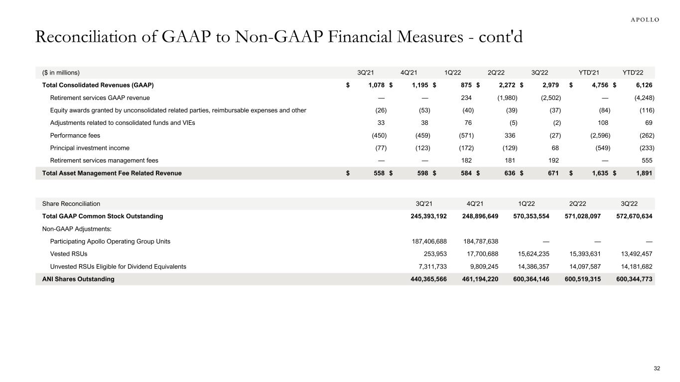 ($ in millions) 3Q'21 4Q'21 1Q'22 2Q'22 3Q'22 YTD'21 YTD'22 Total Consolidated Revenues (GAAP) $ 1,078 $ 1,195 $ 875 $ 2,272 $ 2,979 $ 4,756 $ 6,126 Retirement services GAAP revenue — — 234 (1,980) (2,502) — (4,248) Equity awards granted by unconsolidated related parties, reimbursable expenses and other (26) (53) (40) (39) (37) (84) (116) Adjustments related to consolidated funds and VIEs 33 38 76 (5) (2) 108 69 Performance fees (450) (459) (571) 336 (27) (2,596) (262) Principal investment income (77) (123) (172) (129) 68 (549) (233) Retirement services management fees — — 182 181 192 — 555 Total Asset Management Fee Related Revenue $ 558 $ 598 $ 584 $ 636 $ 671 $ 1,635 $ 1,891 Share Reconciliation 3Q'21 4Q'21 1Q'22 2Q'22 3Q'22 Total GAAP Common Stock Outstanding 245,393,192 248,896,649 570,353,554 571,028,097 572,670,634 Non-GAAP Adjustments: Participating Apollo Operating Group Units 187,406,688 184,787,638 — — — Vested RSUs 253,953 17,700,688 15,624,235 15,393,631 13,492,457 Unvested RSUs Eligible for Dividend Equivalents 7,311,733 9,809,245 14,386,357 14,097,587 14,181,682 ANI Shares Outstanding 440,365,566 461,194,220 600,364,146 600,519,315 600,344,773 Reconciliation of GAAP to Non-GAAP Financial Measures - cont'd 32
