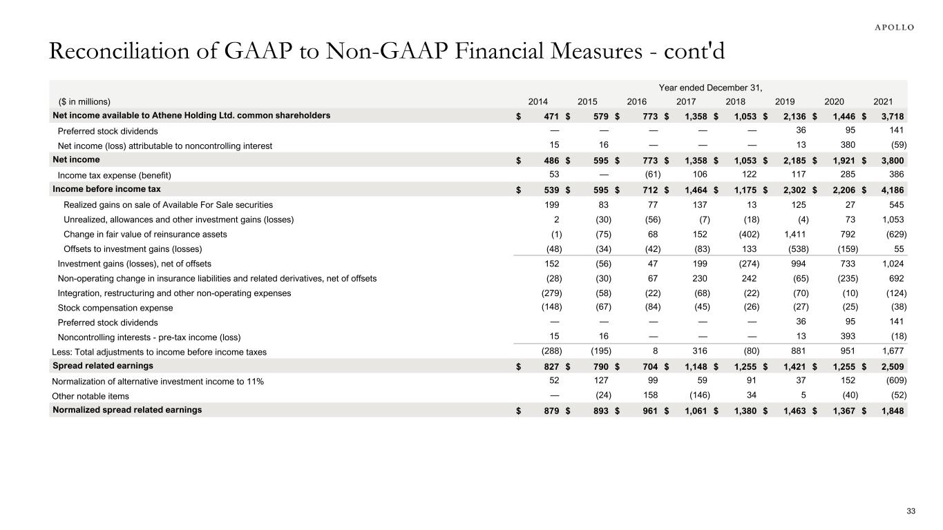 Year ended December 31, ($ in millions) 2014 2015 2016 2017 2018 2019 2020 2021 Net income available to Athene Holding Ltd. common shareholders $ 471 $ 579 $ 773 $ 1,358 $ 1,053 $ 2,136 $ 1,446 $ 3,718 Preferred stock dividends — — — — — 36 95 141 Net income (loss) attributable to noncontrolling interest 15 16 — — — 13 380 (59) Net income $ 486 $ 595 $ 773 $ 1,358 $ 1,053 $ 2,185 $ 1,921 $ 3,800 Income tax expense (benefit) 53 — (61) 106 122 117 285 386 Income before income tax $ 539 $ 595 $ 712 $ 1,464 $ 1,175 $ 2,302 $ 2,206 $ 4,186 Realized gains on sale of Available For Sale securities 199 83 77 137 13 125 27 545 Unrealized, allowances and other investment gains (losses) 2 (30) (56) (7) (18) (4) 73 1,053 Change in fair value of reinsurance assets (1) (75) 68 152 (402) 1,411 792 (629) Offsets to investment gains (losses) (48) (34) (42) (83) 133 (538) (159) 55 Investment gains (losses), net of offsets 152 (56) 47 199 (274) 994 733 1,024 Non-operating change in insurance liabilities and related derivatives, net of offsets (28) (30) 67 230 242 (65) (235) 692 Integration, restructuring and other non-operating expenses (279) (58) (22) (68) (22) (70) (10) (124) Stock compensation expense (148) (67) (84) (45) (26) (27) (25) (38) Preferred stock dividends — — — — — 36 95 141 Noncontrolling interests - pre-tax income (loss) 15 16 — — — 13 393 (18) Less: Total adjustments to income before income taxes (288) (195) 8 316 (80) 881 951 1,677 Spread related earnings $ 827 $ 790 $ 704 $ 1,148 $ 1,255 $ 1,421 $ 1,255 $ 2,509 Normalization of alternative investment income to 11% 52 127 99 59 91 37 152 (609) Other notable items — (24) 158 (146) 34 5 (40) (52) Normalized spread related earnings $ 879 $ 893 $ 961 $ 1,061 $ 1,380 $ 1,463 $ 1,367 $ 1,848 Reconciliation of GAAP to Non-GAAP Financial Measures - cont'd 33