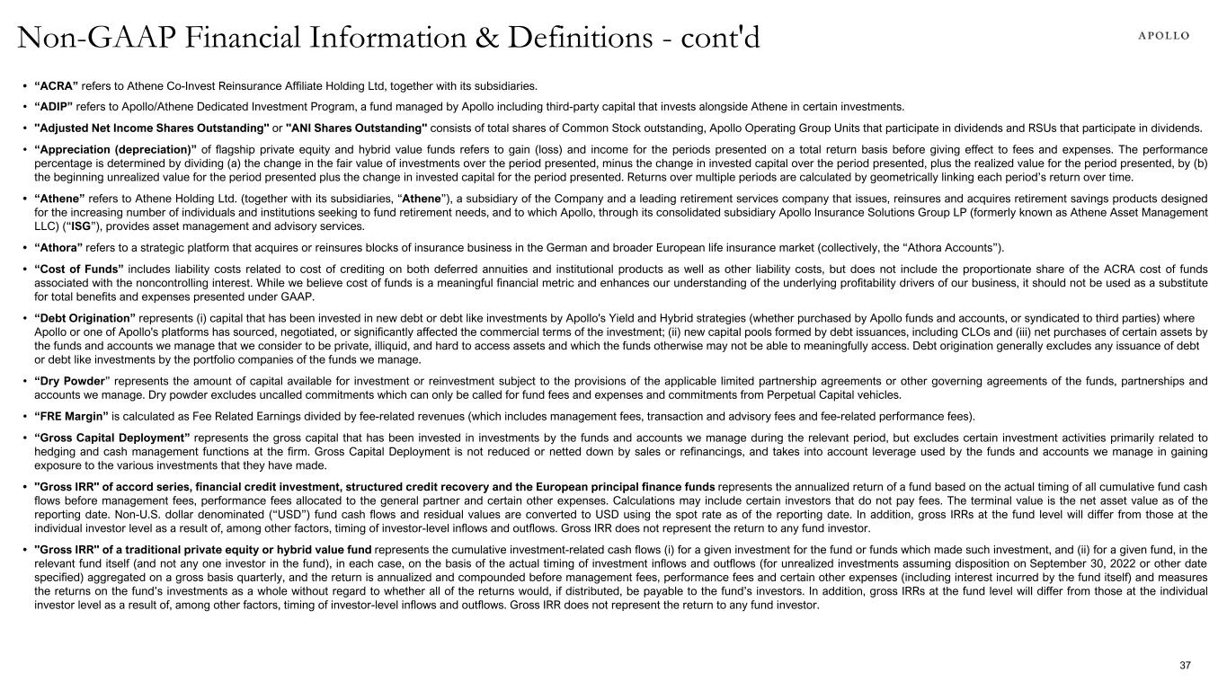 • “ACRA” refers to Athene Co-Invest Reinsurance Affiliate Holding Ltd, together with its subsidiaries. • “ADIP” refers to Apollo/Athene Dedicated Investment Program, a fund managed by Apollo including third-party capital that invests alongside Athene in certain investments. • "Adjusted Net Income Shares Outstanding" or "ANI Shares Outstanding" consists of total shares of Common Stock outstanding, Apollo Operating Group Units that participate in dividends and RSUs that participate in dividends. • “Appreciation (depreciation)” of flagship private equity and hybrid value funds refers to gain (loss) and income for the periods presented on a total return basis before giving effect to fees and expenses. The performance percentage is determined by dividing (a) the change in the fair value of investments over the period presented, minus the change in invested capital over the period presented, plus the realized value for the period presented, by (b) the beginning unrealized value for the period presented plus the change in invested capital for the period presented. Returns over multiple periods are calculated by geometrically linking each period’s return over time. • “Athene” refers to Athene Holding Ltd. (together with its subsidiaries, “Athene”), a subsidiary of the Company and a leading retirement services company that issues, reinsures and acquires retirement savings products designed for the increasing number of individuals and institutions seeking to fund retirement needs, and to which Apollo, through its consolidated subsidiary Apollo Insurance Solutions Group LP (formerly known as Athene Asset Management LLC) (“ISG”), provides asset management and advisory services. • “Athora” refers to a strategic platform that acquires or reinsures blocks of insurance business in the German and broader European life insurance market (collectively, the “Athora Accounts”). • “Cost of Funds” includes liability costs related to cost of crediting on both deferred annuities and institutional products as well as other liability costs, but does not include the proportionate share of the ACRA cost of funds associated with the noncontrolling interest. While we believe cost of funds is a meaningful financial metric and enhances our understanding of the underlying profitability drivers of our business, it should not be used as a substitute for total benefits and expenses presented under GAAP. • “Debt Origination” represents (i) capital that has been invested in new debt or debt like investments by Apollo's Yield and Hybrid strategies (whether purchased by Apollo funds and accounts, or syndicated to third parties) where Apollo or one of Apollo's platforms has sourced, negotiated, or significantly affected the commercial terms of the investment; (ii) new capital pools formed by debt issuances, including CLOs and (iii) net purchases of certain assets by the funds and accounts we manage that we consider to be private, illiquid, and hard to access assets and which the funds otherwise may not be able to meaningfully access. Debt origination generally excludes any issuance of debt or debt like investments by the portfolio companies of the funds we manage. • “Dry Powder” represents the amount of capital available for investment or reinvestment subject to the provisions of the applicable limited partnership agreements or other governing agreements of the funds, partnerships and accounts we manage. Dry powder excludes uncalled commitments which can only be called for fund fees and expenses and commitments from Perpetual Capital vehicles. • “FRE Margin” is calculated as Fee Related Earnings divided by fee-related revenues (which includes management fees, transaction and advisory fees and fee-related performance fees). • “Gross Capital Deployment” represents the gross capital that has been invested in investments by the funds and accounts we manage during the relevant period, but excludes certain investment activities primarily related to hedging and cash management functions at the firm. Gross Capital Deployment is not reduced or netted down by sales or refinancings, and takes into account leverage used by the funds and accounts we manage in gaining exposure to the various investments that they have made. • "Gross IRR" of accord series, financial credit investment, structured credit recovery and the European principal finance funds represents the annualized return of a fund based on the actual timing of all cumulative fund cash flows before management fees, performance fees allocated to the general partner and certain other expenses. Calculations may include certain investors that do not pay fees. The terminal value is the net asset value as of the reporting date. Non-U.S. dollar denominated (“USD”) fund cash flows and residual values are converted to USD using the spot rate as of the reporting date. In addition, gross IRRs at the fund level will differ from those at the individual investor level as a result of, among other factors, timing of investor-level inflows and outflows. Gross IRR does not represent the return to any fund investor. • "Gross IRR" of a traditional private equity or hybrid value fund represents the cumulative investment-related cash flows (i) for a given investment for the fund or funds which made such investment, and (ii) for a given fund, in the relevant fund itself (and not any one investor in the fund), in each case, on the basis of the actual timing of investment inflows and outflows (for unrealized investments assuming disposition on September 30, 2022 or other date specified) aggregated on a gross basis quarterly, and the return is annualized and compounded before management fees, performance fees and certain other expenses (including interest incurred by the fund itself) and measures the returns on the fund’s investments as a whole without regard to whether all of the returns would, if distributed, be payable t