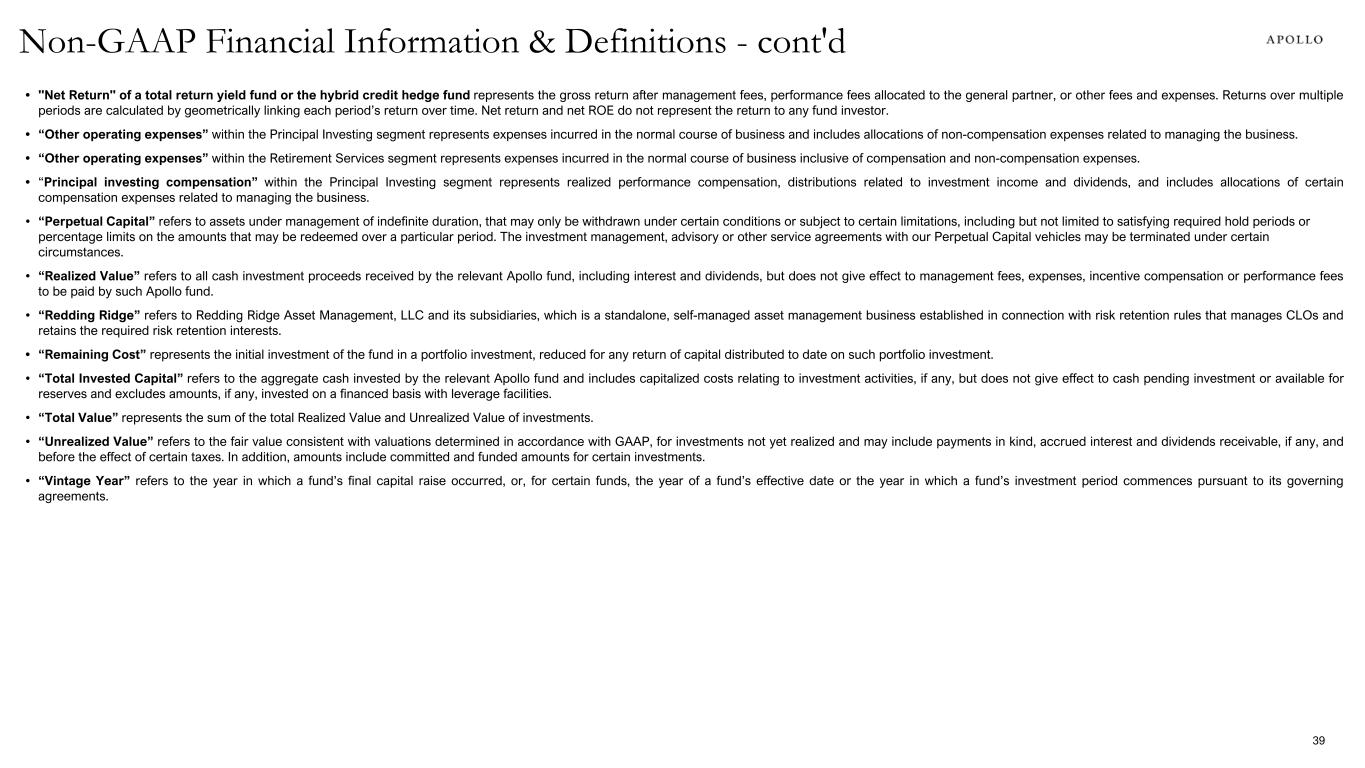 • "Net Return" of a total return yield fund or the hybrid credit hedge fund represents the gross return after management fees, performance fees allocated to the general partner, or other fees and expenses. Returns over multiple periods are calculated by geometrically linking each period’s return over time. Net return and net ROE do not represent the return to any fund investor. • “Other operating expenses” within the Principal Investing segment represents expenses incurred in the normal course of business and includes allocations of non-compensation expenses related to managing the business. • “Other operating expenses” within the Retirement Services segment represents expenses incurred in the normal course of business inclusive of compensation and non-compensation expenses. • “Principal investing compensation” within the Principal Investing segment represents realized performance compensation, distributions related to investment income and dividends, and includes allocations of certain compensation expenses related to managing the business. • “Perpetual Capital” refers to assets under management of indefinite duration, that may only be withdrawn under certain conditions or subject to certain limitations, including but not limited to satisfying required hold periods or percentage limits on the amounts that may be redeemed over a particular period. The investment management, advisory or other service agreements with our Perpetual Capital vehicles may be terminated under certain circumstances. • “Realized Value” refers to all cash investment proceeds received by the relevant Apollo fund, including interest and dividends, but does not give effect to management fees, expenses, incentive compensation or performance fees to be paid by such Apollo fund. • “Redding Ridge” refers to Redding Ridge Asset Management, LLC and its subsidiaries, which is a standalone, self-managed asset management business established in connection with risk retention rules that manages CLOs and retains the required risk retention interests. • “Remaining Cost” represents the initial investment of the fund in a portfolio investment, reduced for any return of capital distributed to date on such portfolio investment. • “Total Invested Capital” refers to the aggregate cash invested by the relevant Apollo fund and includes capitalized costs relating to investment activities, if any, but does not give effect to cash pending investment or available for reserves and excludes amounts, if any, invested on a financed basis with leverage facilities. • “Total Value” represents the sum of the total Realized Value and Unrealized Value of investments. • “Unrealized Value” refers to the fair value consistent with valuations determined in accordance with GAAP, for investments not yet realized and may include payments in kind, accrued interest and dividends receivable, if any, and before the effect of certain taxes. In addition, amounts include committed and funded amounts for certain investments. • “Vintage Year” refers to the year in which a fund’s final capital raise occurred, or, for certain funds, the year of a fund’s effective date or the year in which a fund’s investment period commences pursuant to its governing agreements. Non-GAAP Financial Information & Definitions - cont'd 39