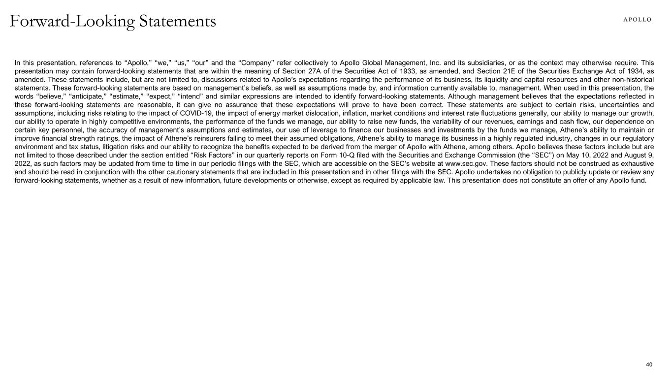 Forward-Looking Statements In this presentation, references to “Apollo,” “we,” “us,” “our” and the “Company” refer collectively to Apollo Global Management, Inc. and its subsidiaries, or as the context may otherwise require. This presentation may contain forward-looking statements that are within the meaning of Section 27A of the Securities Act of 1933, as amended, and Section 21E of the Securities Exchange Act of 1934, as amended. These statements include, but are not limited to, discussions related to Apollo’s expectations regarding the performance of its business, its liquidity and capital resources and other non-historical statements. These forward-looking statements are based on management’s beliefs, as well as assumptions made by, and information currently available to, management. When used in this presentation, the words “believe,” “anticipate,” “estimate,” “expect,” “intend” and similar expressions are intended to identify forward-looking statements. Although management believes that the expectations reflected in these forward-looking statements are reasonable, it can give no assurance that these expectations will prove to have been correct. These statements are subject to certain risks, uncertainties and assumptions, including risks relating to the impact of COVID-19, the impact of energy market dislocation, inflation, market conditions and interest rate fluctuations generally, our ability to manage our growth, our ability to operate in highly competitive environments, the performance of the funds we manage, our ability to raise new funds, the variability of our revenues, earnings and cash flow, our dependence on certain key personnel, the accuracy of management’s assumptions and estimates, our use of leverage to finance our businesses and investments by the funds we manage, Athene’s ability to maintain or improve financial strength ratings, the impact of Athene’s reinsurers failing to meet their assumed obligations, Athene’s ability to manage its business in a highly regulated industry, changes in our regulatory environment and tax status, litigation risks and our ability to recognize the benefits expected to be derived from the merger of Apollo with Athene, among others. Apollo believes these factors include but are not limited to those described under the section entitled “Risk Factors” in our quarterly reports on Form 10-Q filed with the Securities and Exchange Commission (the “SEC”) on May 10, 2022 and August 9, 2022, as such factors may be updated from time to time in our periodic filings with the SEC, which are accessible on the SEC’s website at www.sec.gov. These factors should not be construed as exhaustive and should be read in conjunction with the other cautionary statements that are included in this presentation and in other filings with the SEC. Apollo undertakes no obligation to publicly update or review any forward-looking statements, whether as a result of new information, future developments or otherwise, except as required by applicable law. This presentation does not constitute an offer of any Apollo fund. 40