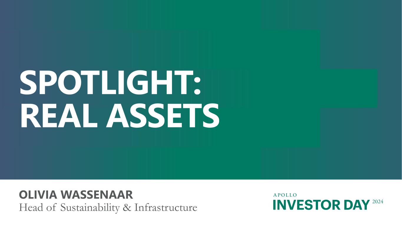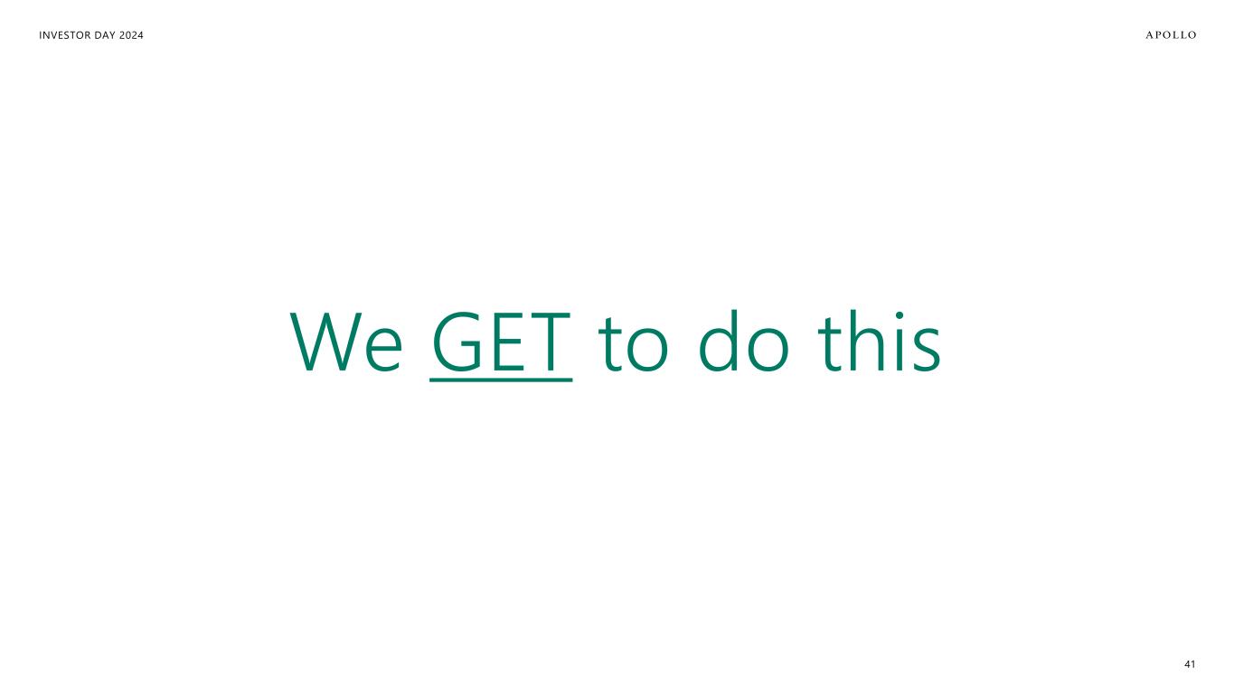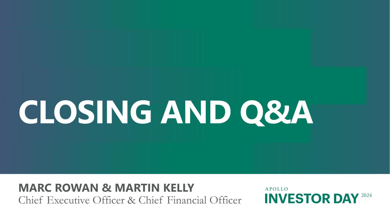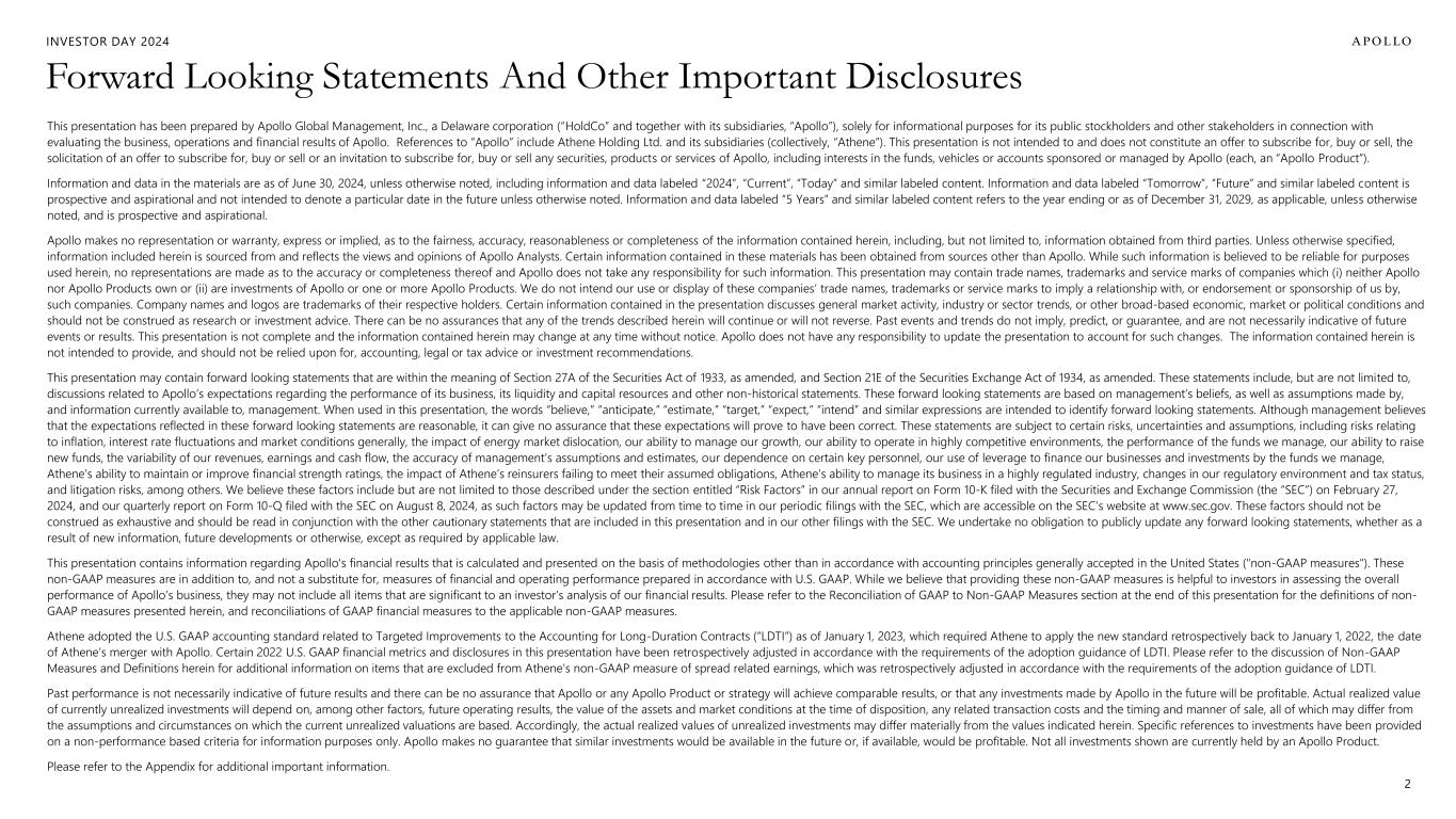 INVESTOR DAY 2024 Additional Important Information Estimates and Assumptions This presentation includes certain unaudited financial and business projections and goals on Apollo’s future outlook (the “Estimates”). Estimates, and their underlying assumptions, are inherently unpredictable and undue reliance should not be placed thereon. The Estimates reflect the internal financial model that Apollo uses in connection with its strategic planning and are based on numerous variables and assumptions made by Apollo’s management with respect to industry performance, general business, economic, regulatory, market and financial conditions and other future events, as well as matters specific to Apollo’s businesses, all of which are difficult or impossible to predict accurately and many of which are beyond the control of Apollo’s management. Because the Estimates cover multiple years, by their nature, they also become subject to greater uncertainty and are less reliable with each successive year. The Estimates reflect subjective judgment in many respects and thus are susceptible to multiple interpretations and periodic revisions based on actual experience and business developments. As such, the Estimates constitute forward looking information and are subject to many risks and uncertainties that could cause actual results to differ materially from the results forecasted in these projections. Please consider carefully the Forward Looking Statements and Other Important Disclosures at the beginning of this presentation. There can be no assurance that the Estimates will be realized or that actual results will not be significantly higher or lower than forecast. The Estimates may be affected by Apollo’s ability to achieve strategic goals, objectives and targets over the applicable period. Accordingly, there can be no assurance that the Estimates will be realized, and actual results may vary materially from those shown. The Estimates cannot, therefore, be considered a guarantee of future operating results, and this information should not be relied on as such. The inclusion of the Estimates in this presentation should not be regarded as an indication that Apollo or any of its affiliates, advisors, officers, directors or representatives considered or considers the Estimates to be necessarily predictive of actual future events, and the Estimates should not be relied upon as such. The inclusion of the Estimates herein should not be deemed an admission or representation by Apollo that its management views the Estimates as material information. Neither Apollo nor any of its affiliates, advisors, officers, directors or representatives has made or makes any representation to any of Apollo’s stockholders or any other person regarding the ultimate performance of Apollo compared to the information contained in the Estimates or can give any assurance that actual results will not differ materially from the Estimates, and none of them undertakes any obligation to update or otherwise revise or reconcile the Estimates to reflect circumstances existing after the date the Estimates were generated or to reflect the occurrence of future events even in the event that any or all of the assumptions underlying the Estimates are shown to be in error. Certain of the projected financial information set forth herein may be considered non-GAAP financial measures. There are limitations inherent in non-GAAP financial measures, because they exclude charges and credits that are required to be included in a GAAP presentation. Non-GAAP financial measures should not be considered in isolation from, or as a substitute for, financial information presented in compliance with GAAP, and non-GAAP financial measures as used by Apollo may not be comparable to similarly titled amounts used by other companies. No reconciliation of non-GAAP financial measures in the Estimates to GAAP measures was created or used in connection with preparing the Estimates. In light of the foregoing factors and the uncertainties inherent in the Estimates, Apollo’s stockholders and others are cautioned not to place undue reliance on the Estimates. Without limiting the statements made in the prior paragraphs, please take note of the following additional important information. Assets Under Management (“AUM”) The estimates and expectations about new fund capital that Apollo can raise in various strategies and formats and Apollo’s AUM in the future depend on many assumptions about future events and circumstances, including but not limited to the fundraising environment generally, investor interest in the investment strategies presented, and the expected pace and the time periods within which fundraising will be completed. There are many factors that could delay, impede or prohibit the future fundraising that Apollo currently expects, including not limited to market disruption, loss of key personnel, lack of investor interest, negotiations with investors, and other events or circumstances that we may or may not be able to predict, manage or control (including but not limited to the matters discussed in the Forward Looking Statements and Other Important Disclosures section at the beginning of this presentation). Fee Related Earnings (“FRE”), Spread Related Earnings (“SRE”) and Principal Investing Income (“PII”) The estimates and expectations about Apollo’s FRE, SRE and PII in the future depend on many assumptions about future events and circumstances, including but not limited to (i) the assumptions about future fundraising and AUM, (ii) the actual terms and conditions of the Apollo Products to be raised in the future, including management fee rates and performance fees paid, (iii) the investment and transaction activity of Apollo entities, (iv) the ability to generate liability growth, realize target returns and target net spreads on Athene’s investment portfolio, (v) the variability and level of our operating expenses, and (vi) the timing