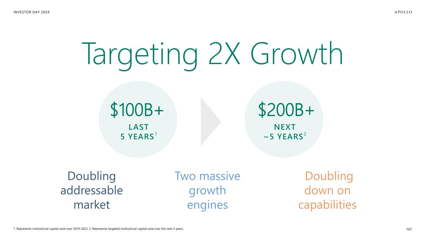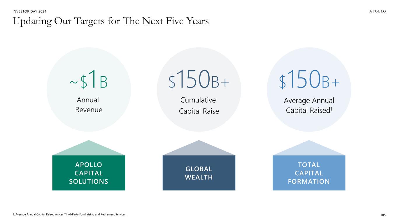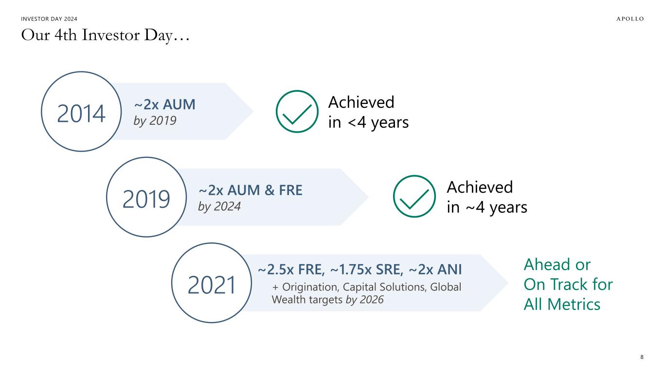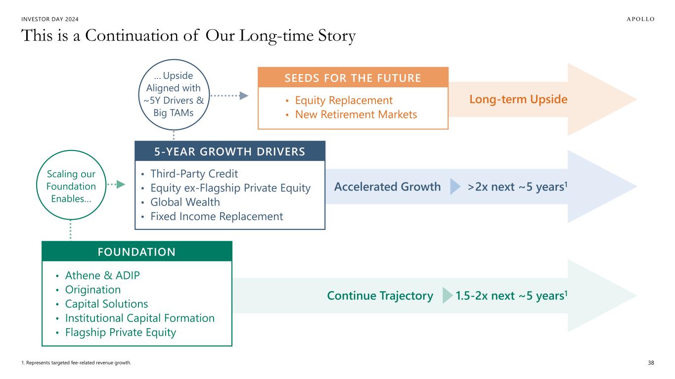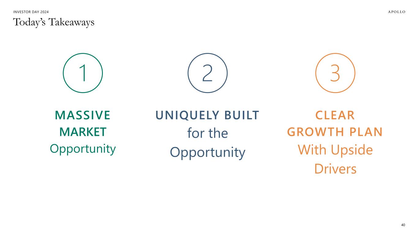 INVESTOR DAY 2024 Additional Important Information Estimates and Assumptions This presentation includes certain unaudited financial and business projections and goals on Apollo’s future outlook (the “Estimates”). Estimates, and their underlying assumptions, are inherently unpredictable and undue reliance should not be placed thereon. The Estimates reflect the internal financial model that Apollo uses in connection with its strategic planning and are based on numerous variables and assumptions made by Apollo’s management with respect to industry performance, general business, economic, regulatory, market and financial conditions and other future events, as well as matters specific to Apollo’s businesses, all of which are difficult or impossible to predict accurately and many of which are beyond the control of Apollo’s management. Because the Estimates cover multiple years, by their nature, they also become subject to greater uncertainty and are less reliable with each successive year. The Estimates reflect subjective judgment in many respects and thus are susceptible to multiple interpretations and periodic revisions based on actual experience and business developments. As such, the Estimates constitute forward looking information and are subject to many risks and uncertainties that could cause actual results to differ materially from the results forecasted in these projections. Please consider carefully the Forward Looking Statements and Other Important Disclosures at the beginning of this presentation. There can be no assurance that the Estimates will be realized or that actual results will not be significantly higher or lower than forecast. The Estimates may be affected by Apollo’s ability to achieve strategic goals, objectives and targets over the applicable period. Accordingly, there can be no assurance that the Estimates will be realized, and actual results may vary materially from those shown. The Estimates cannot, therefore, be considered a guarantee of future operating results, and this information should not be relied on as such. The inclusion of the Estimates in this presentation should not be regarded as an indication that Apollo or any of its affiliates, advisors, officers, directors or representatives considered or considers the Estimates to be necessarily predictive of actual future events, and the Estimates should not be relied upon as such. The inclusion of the Estimates herein should not be deemed an admission or representation by Apollo that its management views the Estimates as material information. Neither Apollo nor any of its affiliates, advisors, officers, directors or representatives has made or makes any representation to any of Apollo’s stockholders or any other person regarding the ultimate performance of Apollo compared to the information contained in the Estimates or can give any assurance that actual results will not differ materially from the Estimates, and none of them undertakes any obligation to update or otherwise revise or reconcile the Estimates to reflect circumstances existing after the date the Estimates were generated or to reflect the occurrence of future events even in the event that any or all of the assumptions underlying the Estimates are shown to be in error. Certain of the projected financial information set forth herein may be considered non-GAAP financial measures. There are limitations inherent in non-GAAP financial measures, because they exclude charges and credits that are required to be included in a GAAP presentation. Non-GAAP financial measures should not be considered in isolation from, or as a substitute for, financial information presented in compliance with GAAP, and non-GAAP financial measures as used by Apollo may not be comparable to similarly titled amounts used by other companies. No reconciliation of non-GAAP financial measures in the Estimates to GAAP measures was created or used in connection with preparing the Estimates. In light of the foregoing factors and the uncertainties inherent in the Estimates, Apollo’s stockholders and others are cautioned not to place undue reliance on the Estimates. Without limiting the statements made in the prior paragraphs, please take note of the following additional important information. Assets Under Management (“AUM”) The estimates and expectations about new fund capital that Apollo can raise in various strategies and formats and Apollo’s AUM in the future depend on many assumptions about future events and circumstances, including but not limited to the fundraising environment generally, investor interest in the investment strategies presented, and the expected pace and the time periods within which fundraising will be completed. There are many factors that could delay, impede or prohibit the future fundraising that Apollo currently expects, including not limited to market disruption, loss of key personnel, lack of investor interest, negotiations with investors, and other events or circumstances that we may or may not be able to predict, manage or control (including but not limited to the matters discussed in the Forward Looking Statements and Other Important Disclosures section at the beginning of this presentation). Fee Related Earnings (“FRE”), Spread Related Earnings (“SRE”) and Principal Investing Income (“PII”) The estimates and expectations about Apollo’s FRE, SRE and PII in the future depend on many assumptions about future events and circumstances, including but not limited to (i) the assumptions about future fundraising and AUM, (ii) the actual terms and conditions of the Apollo Products to be raised in the future, including management fee rates and performance fees paid, (iii) the investment and transaction activity of Apollo entities, (iv) the ability to generate liability growth, realize target returns and target net spreads on Athene’s investment portfolio, (v) the variability and level of our operating expenses, and (vi) the timing