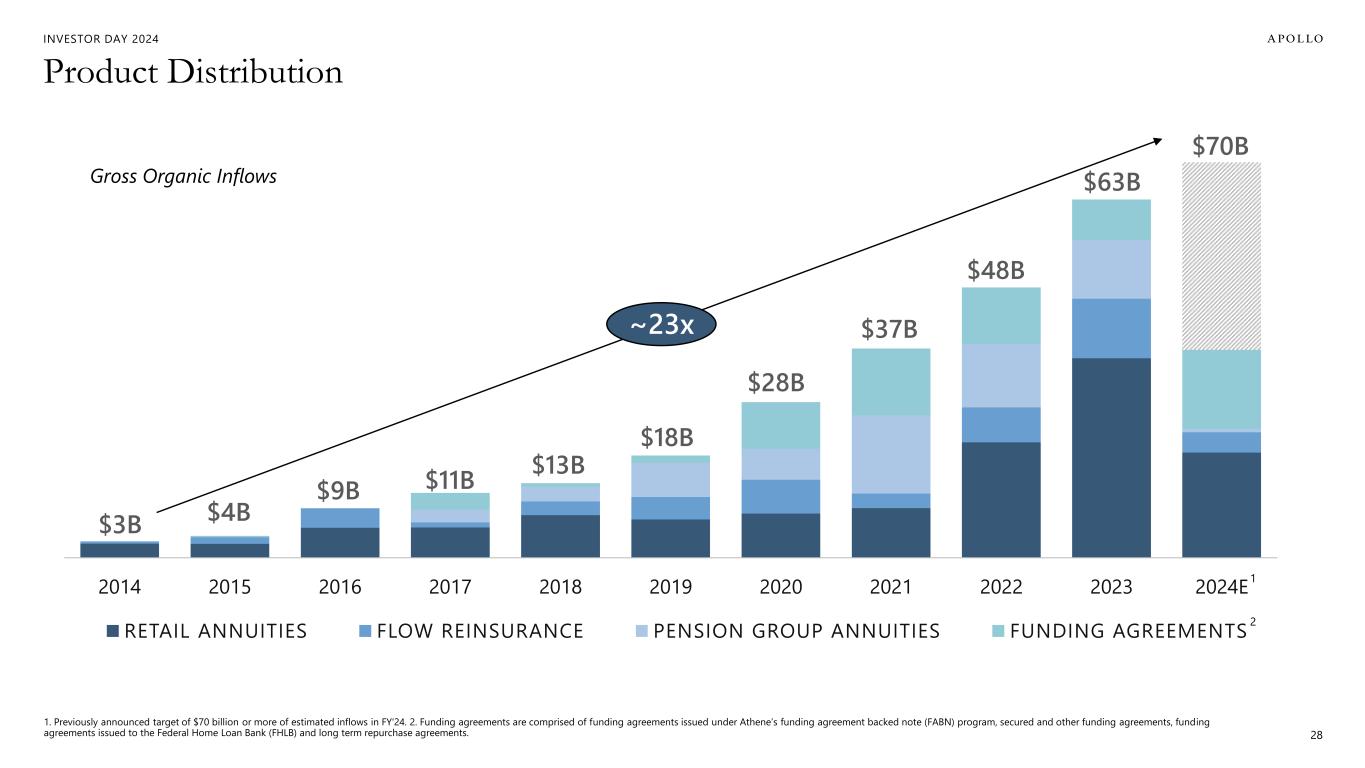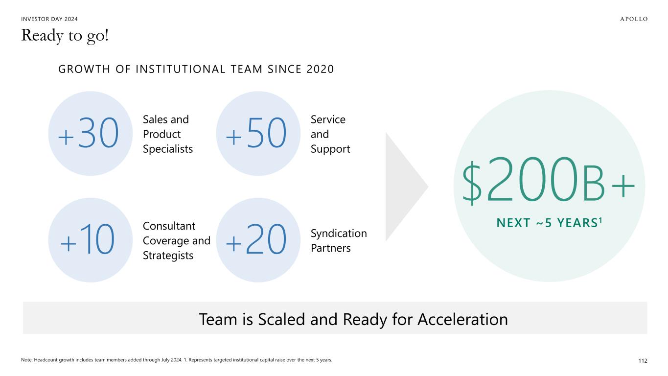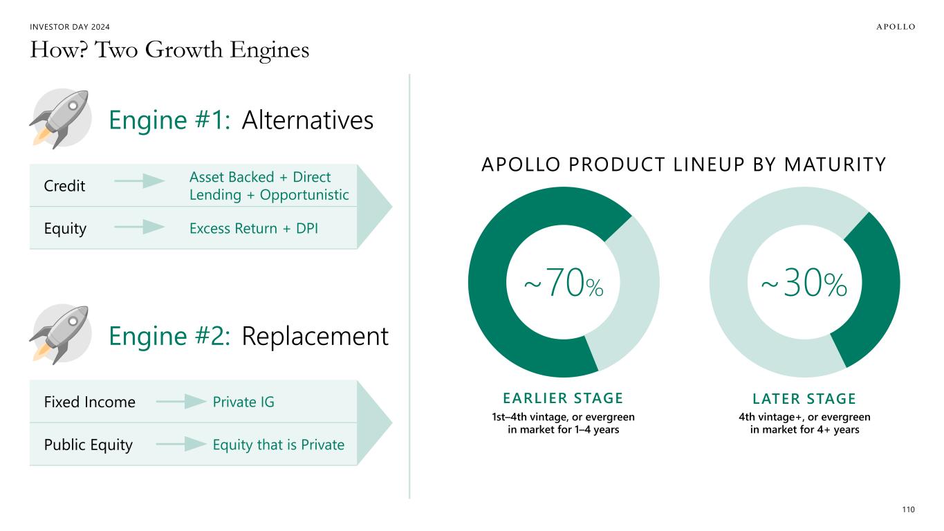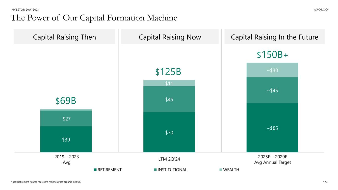 INVESTOR DAY 2024 Additional Important Information Estimates and Assumptions This presentation includes certain unaudited financial and business projections and goals on Apollo’s future outlook (the “Estimates”). Estimates, and their underlying assumptions, are inherently unpredictable and undue reliance should not be placed thereon. The Estimates reflect the internal financial model that Apollo uses in connection with its strategic planning and are based on numerous variables and assumptions made by Apollo’s management with respect to industry performance, general business, economic, regulatory, market and financial conditions and other future events, as well as matters specific to Apollo’s businesses, all of which are difficult or impossible to predict accurately and many of which are beyond the control of Apollo’s management. Because the Estimates cover multiple years, by their nature, they also become subject to greater uncertainty and are less reliable with each successive year. The Estimates reflect subjective judgment in many respects and thus are susceptible to multiple interpretations and periodic revisions based on actual experience and business developments. As such, the Estimates constitute forward looking information and are subject to many risks and uncertainties that could cause actual results to differ materially from the results forecasted in these projections. Please consider carefully the Forward Looking Statements and Other Important Disclosures at the beginning of this presentation. There can be no assurance that the Estimates will be realized or that actual results will not be significantly higher or lower than forecast. The Estimates may be affected by Apollo’s ability to achieve strategic goals, objectives and targets over the applicable period. Accordingly, there can be no assurance that the Estimates will be realized, and actual results may vary materially from those shown. The Estimates cannot, therefore, be considered a guarantee of future operating results, and this information should not be relied on as such. The inclusion of the Estimates in this presentation should not be regarded as an indication that Apollo or any of its affiliates, advisors, officers, directors or representatives considered or considers the Estimates to be necessarily predictive of actual future events, and the Estimates should not be relied upon as such. The inclusion of the Estimates herein should not be deemed an admission or representation by Apollo that its management views the Estimates as material information. Neither Apollo nor any of its affiliates, advisors, officers, directors or representatives has made or makes any representation to any of Apollo’s stockholders or any other person regarding the ultimate performance of Apollo compared to the information contained in the Estimates or can give any assurance that actual results will not differ materially from the Estimates, and none of them undertakes any obligation to update or otherwise revise or reconcile the Estimates to reflect circumstances existing after the date the Estimates were generated or to reflect the occurrence of future events even in the event that any or all of the assumptions underlying the Estimates are shown to be in error. Certain of the projected financial information set forth herein may be considered non-GAAP financial measures. There are limitations inherent in non-GAAP financial measures, because they exclude charges and credits that are required to be included in a GAAP presentation. Non-GAAP financial measures should not be considered in isolation from, or as a substitute for, financial information presented in compliance with GAAP, and non-GAAP financial measures as used by Apollo may not be comparable to similarly titled amounts used by other companies. No reconciliation of non-GAAP financial measures in the Estimates to GAAP measures was created or used in connection with preparing the Estimates. In light of the foregoing factors and the uncertainties inherent in the Estimates, Apollo’s stockholders and others are cautioned not to place undue reliance on the Estimates. Without limiting the statements made in the prior paragraphs, please take note of the following additional important information. Assets Under Management (“AUM”) The estimates and expectations about new fund capital that Apollo can raise in various strategies and formats and Apollo’s AUM in the future depend on many assumptions about future events and circumstances, including but not limited to the fundraising environment generally, investor interest in the investment strategies presented, and the expected pace and the time periods within which fundraising will be completed. There are many factors that could delay, impede or prohibit the future fundraising that Apollo currently expects, including not limited to market disruption, loss of key personnel, lack of investor interest, negotiations with investors, and other events or circumstances that we may or may not be able to predict, manage or control (including but not limited to the matters discussed in the Forward Looking Statements and Other Important Disclosures section at the beginning of this presentation). Fee Related Earnings (“FRE”), Spread Related Earnings (“SRE”) and Principal Investing Income (“PII”) The estimates and expectations about Apollo’s FRE, SRE and PII in the future depend on many assumptions about future events and circumstances, including but not limited to (i) the assumptions about future fundraising and AUM, (ii) the actual terms and conditions of the Apollo Products to be raised in the future, including management fee rates and performance fees paid, (iii) the investment and transaction activity of Apollo entities, (iv) the ability to generate liability growth, realize target returns and target net spreads on Athene’s investment portfolio, (v) the variability and level of our operating expenses, and (vi) the timing