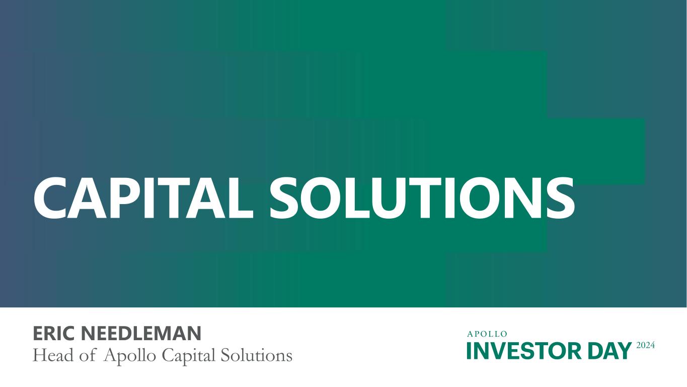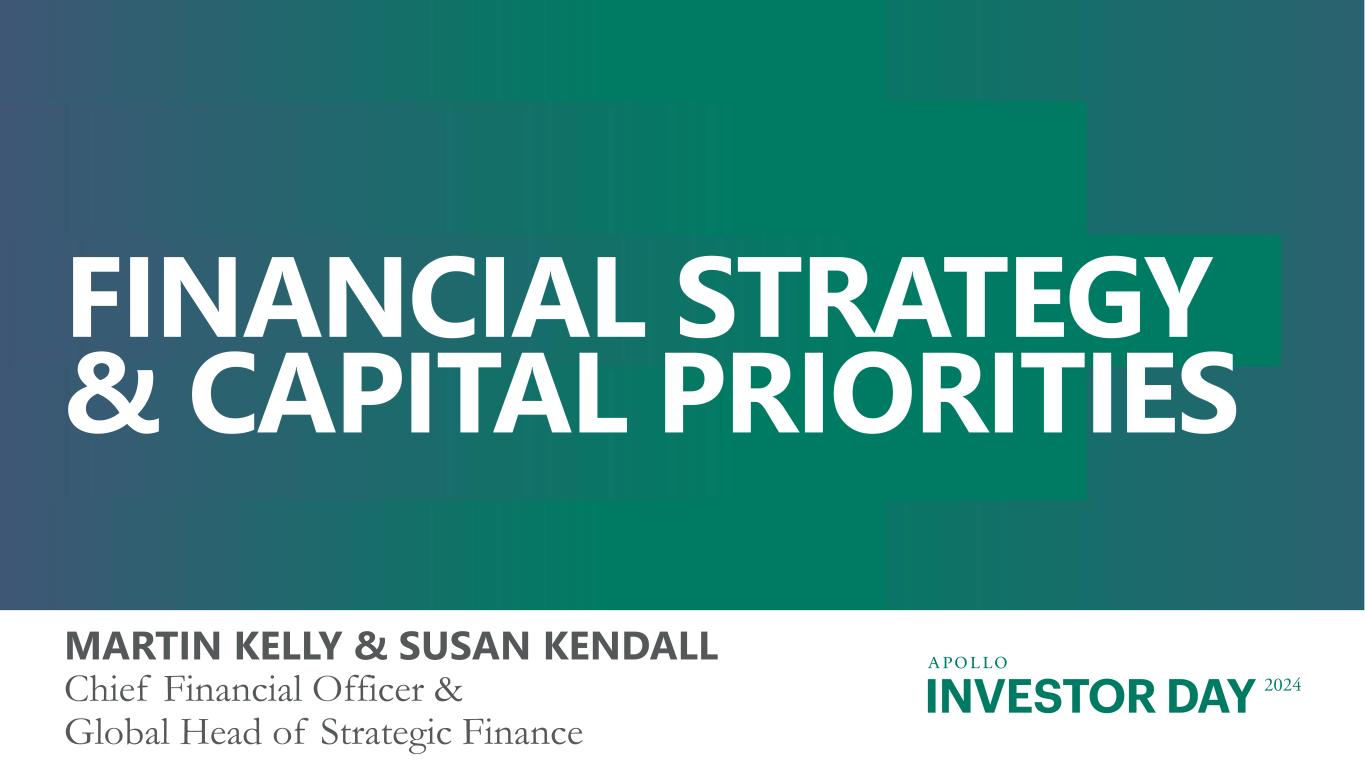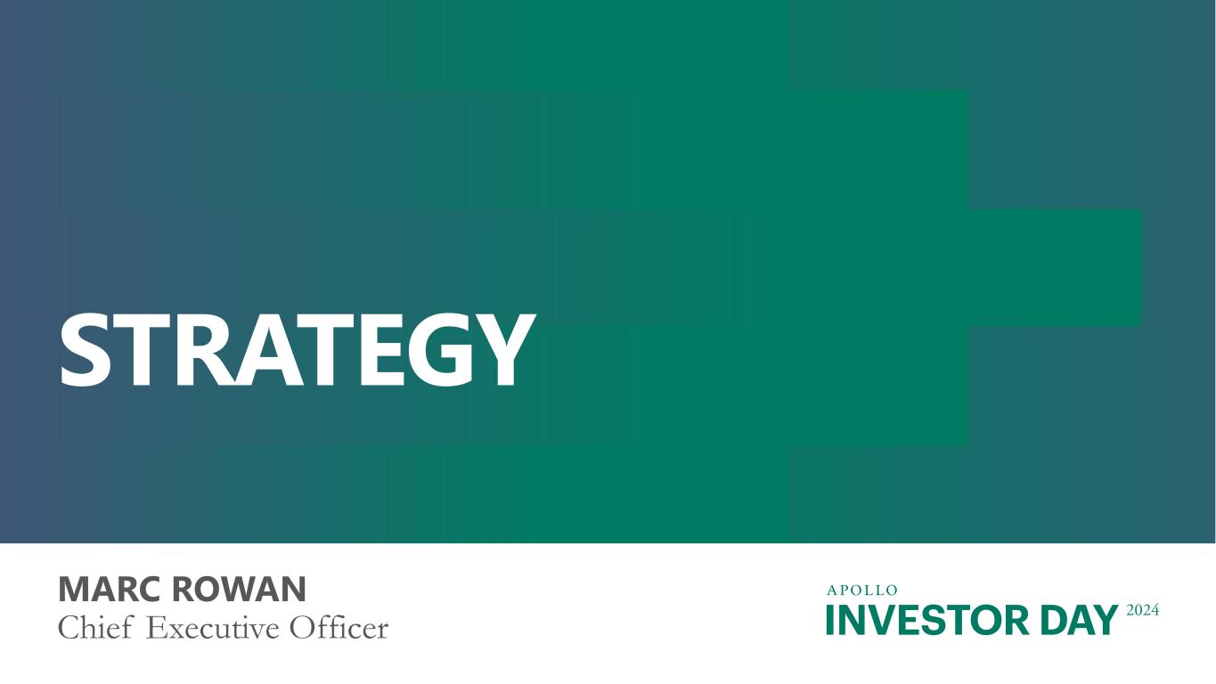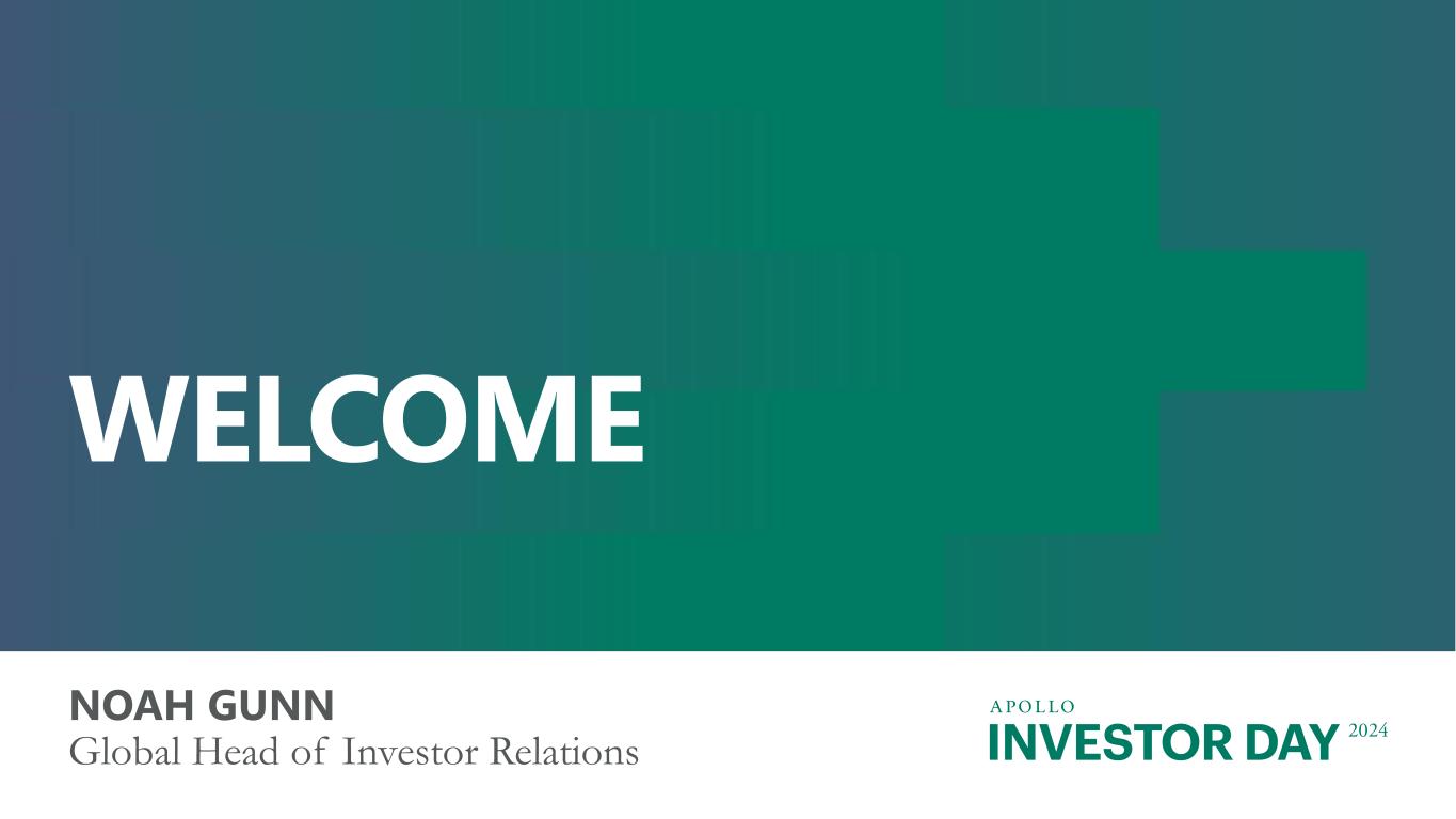 INVESTOR DAY 2024 Forward Looking Statements And Other Important Disclosures This presentation has been prepared by Apollo Global Management, Inc., a Delaware corporation (“HoldCo” and together with its subsidiaries, “Apollo”), solely for informational purposes for its public stockholders and other stakeholders in connection with evaluating the business, operations and financial results of Apollo. References to “Apollo” include Athene Holding Ltd. and its subsidiaries (collectively, “Athene”). This presentation is not intended to and does not constitute an offer to subscribe for, buy or sell, the solicitation of an offer to subscribe for, buy or sell or an invitation to subscribe for, buy or sell any securities, products or services of Apollo, including interests in the funds, vehicles or accounts sponsored or managed by Apollo (each, an “Apollo Product”). Information and data in the materials are as of June 30, 2024, unless otherwise noted, including information and data labeled “2024”, “Current”, “Today” and similar labeled content. Information and data labeled “Tomorrow”, “Future” and similar labeled content is prospective and aspirational and not intended to denote a particular date in the future unless otherwise noted. Information and data labeled “5 Years” and similar labeled content refers to the year ending or as of December 31, 2029, as applicable, unless otherwise noted, and is prospective and aspirational. Apollo makes no representation or warranty, express or implied, as to the fairness, accuracy, reasonableness or completeness of the information contained herein, including, but not limited to, information obtained from third parties. Unless otherwise specified, information included herein is sourced from and reflects the views and opinions of Apollo Analysts. Certain information contained in these materials has been obtained from sources other than Apollo. While such information is believed to be reliable for purposes used herein, no representations are made as to the accuracy or completeness thereof and Apollo does not take any responsibility for such information. This presentation may contain trade names, trademarks and service marks of companies which (i) neither Apollo nor Apollo Products own or (ii) are investments of Apollo or one or more Apollo Products. We do not intend our use or display of these companies’ trade names, trademarks or service marks to imply a relationship with, or endorsement or sponsorship of us by, such companies. Company names and logos are trademarks of their respective holders. Certain information contained in the presentation discusses general market activity, industry or sector trends, or other broad-based economic, market or political conditions and should not be construed as research or investment advice. There can be no assurances that any of the trends described herein will continue or will not reverse. Past events and trends do not imply, predict, or guarantee, and are not necessarily indicative of future events or results. This presentation is not complete and the information contained herein may change at any time without notice. Apollo does not have any responsibility to update the presentation to account for such changes. The information contained herein is not intended to provide, and should not be relied upon for, accounting, legal or tax advice or investment recommendations. This presentation may contain forward looking statements that are within the meaning of Section 27A of the Securities Act of 1933, as amended, and Section 21E of the Securities Exchange Act of 1934, as amended. These statements include, but are not limited to, discussions related to Apollo’s expectations regarding the performance of its business, its liquidity and capital resources and other non-historical statements. These forward looking statements are based on management’s beliefs, as well as assumptions made by, and information currently available to, management. When used in this presentation, the words “believe,” “anticipate,” “estimate,” “target,” “expect,” “intend” and similar expressions are intended to identify forward looking statements. Although management believes that the expectations reflected in these forward looking statements are reasonable, it can give no assurance that these expectations will prove to have been correct. These statements are subject to certain risks, uncertainties and assumptions, including risks relating to inflation, interest rate fluctuations and market conditions generally, the impact of energy market dislocation, our ability to manage our growth, our ability to operate in highly competitive environments, the performance of the funds we manage, our ability to raise new funds, the variability of our revenues, earnings and cash flow, the accuracy of management’s assumptions and estimates, our dependence on certain key personnel, our use of leverage to finance our businesses and investments by the funds we manage, Athene’s ability to maintain or improve financial strength ratings, the impact of Athene’s reinsurers failing to meet their assumed obligations, Athene’s ability to manage its business in a highly regulated industry, changes in our regulatory environment and tax status, and litigation risks, among others. We believe these factors include but are not limited to those described under the section entitled “Risk Factors” in our annual report on Form 10-K filed with the Securities and Exchange Commission (the “SEC”) on February 27, 2024, and our quarterly report on Form 10-Q filed with the SEC on August 8, 2024, as such factors may be updated from time to time in our periodic filings with the SEC, which are accessible on the SEC’s website at www.sec.gov. These factors should not be construed as exhaustive and should be read in conjunction with the other cautionary statements that are included in this presentation and in our other