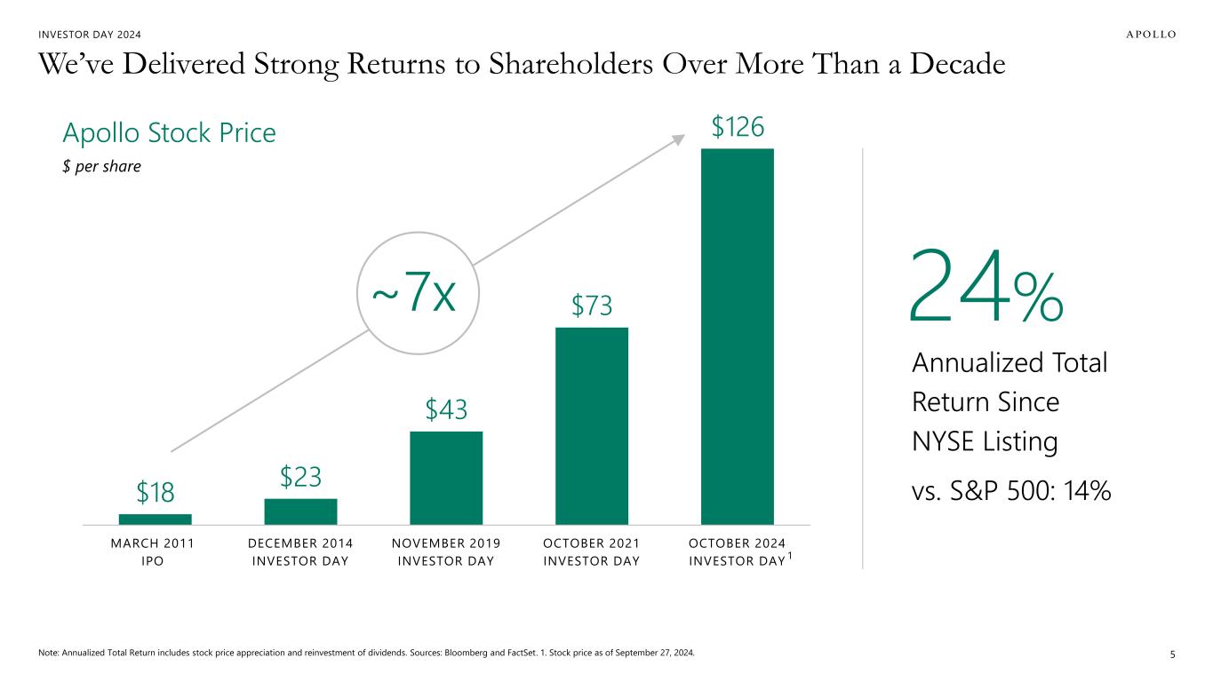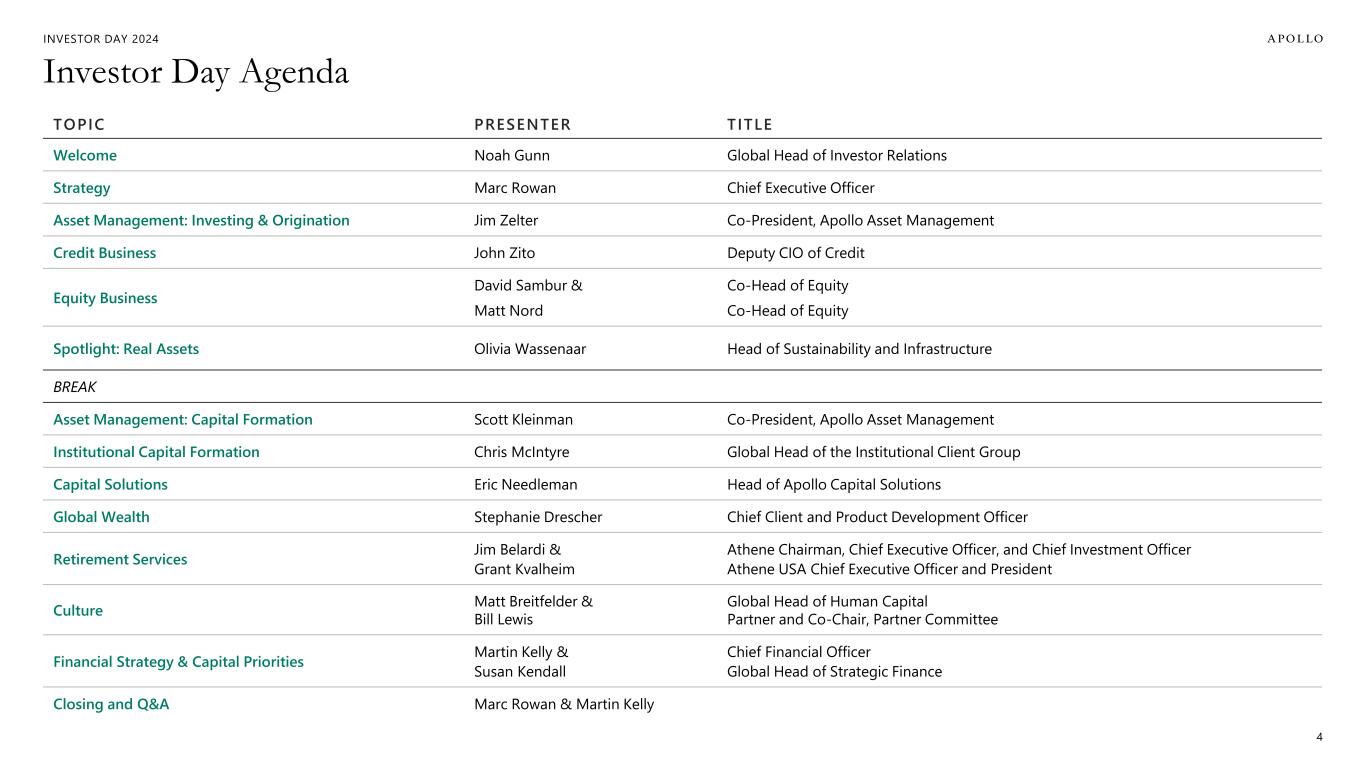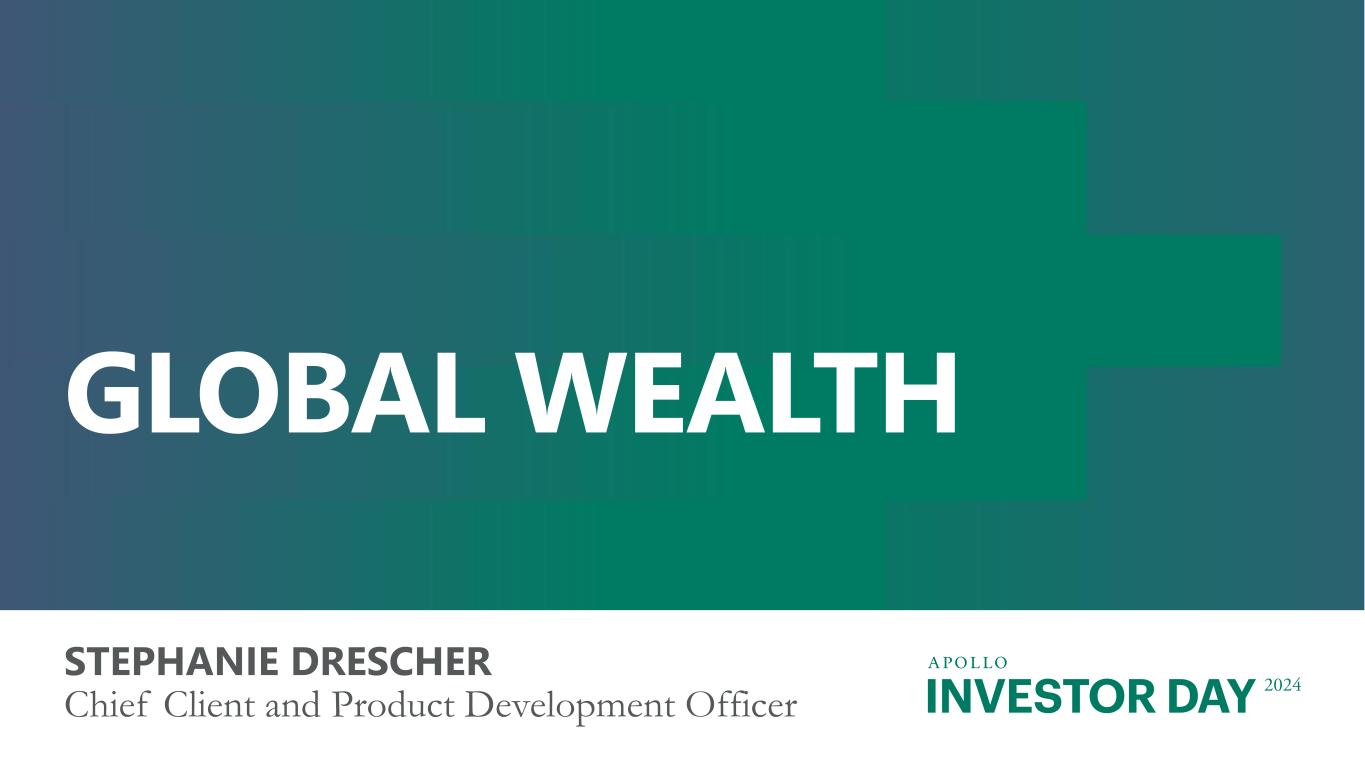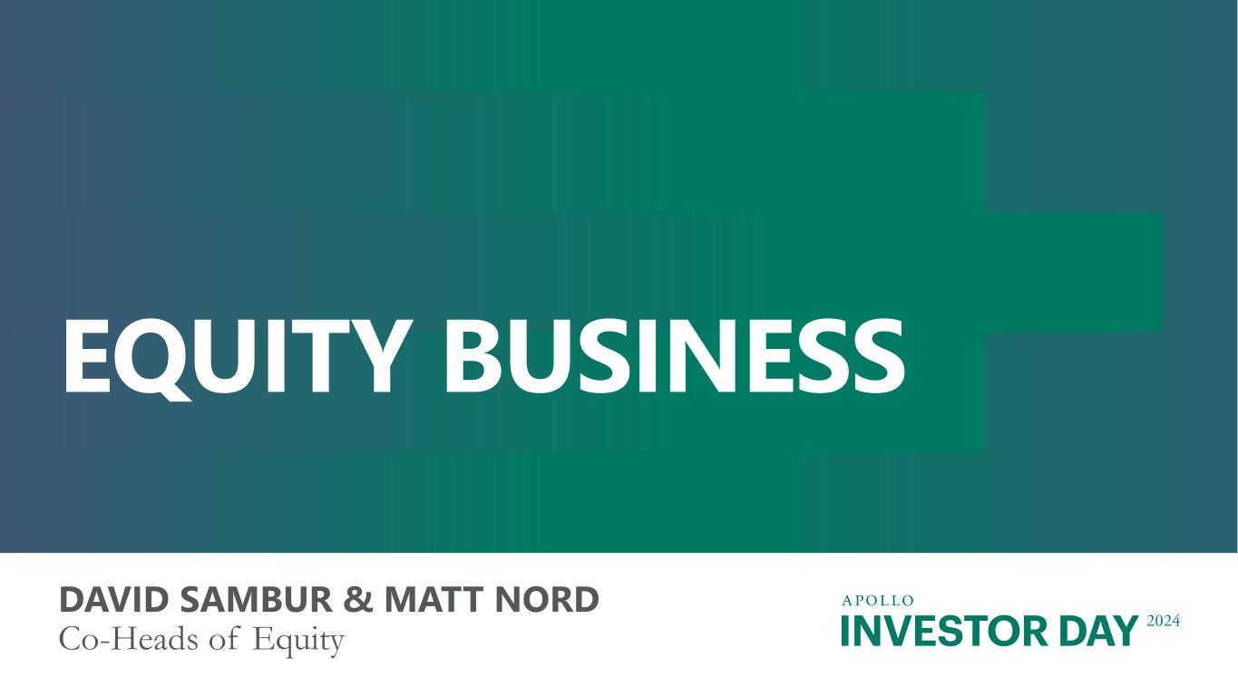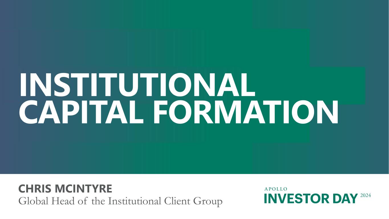 INVESTOR DAY 2024 Forward Looking Statements And Other Important Disclosures This presentation has been prepared by Apollo Global Management, Inc., a Delaware corporation (“HoldCo” and together with its subsidiaries, “Apollo”), solely for informational purposes for its public stockholders and other stakeholders in connection with evaluating the business, operations and financial results of Apollo. References to “Apollo” include Athene Holding Ltd. and its subsidiaries (collectively, “Athene”). This presentation is not intended to and does not constitute an offer to subscribe for, buy or sell, the solicitation of an offer to subscribe for, buy or sell or an invitation to subscribe for, buy or sell any securities, products or services of Apollo, including interests in the funds, vehicles or accounts sponsored or managed by Apollo (each, an “Apollo Product”). Information and data in the materials are as of June 30, 2024, unless otherwise noted, including information and data labeled “2024”, “Current”, “Today” and similar labeled content. Information and data labeled “Tomorrow”, “Future” and similar labeled content is prospective and aspirational and not intended to denote a particular date in the future unless otherwise noted. Information and data labeled “5 Years” and similar labeled content refers to the year ending or as of December 31, 2029, as applicable, unless otherwise noted, and is prospective and aspirational. Apollo makes no representation or warranty, express or implied, as to the fairness, accuracy, reasonableness or completeness of the information contained herein, including, but not limited to, information obtained from third parties. Unless otherwise specified, information included herein is sourced from and reflects the views and opinions of Apollo Analysts. Certain information contained in these materials has been obtained from sources other than Apollo. While such information is believed to be reliable for purposes used herein, no representations are made as to the accuracy or completeness thereof and Apollo does not take any responsibility for such information. This presentation may contain trade names, trademarks and service marks of companies which (i) neither Apollo nor Apollo Products own or (ii) are investments of Apollo or one or more Apollo Products. We do not intend our use or display of these companies’ trade names, trademarks or service marks to imply a relationship with, or endorsement or sponsorship of us by, such companies. Company names and logos are trademarks of their respective holders. Certain information contained in the presentation discusses general market activity, industry or sector trends, or other broad-based economic, market or political conditions and should not be construed as research or investment advice. There can be no assurances that any of the trends described herein will continue or will not reverse. Past events and trends do not imply, predict, or guarantee, and are not necessarily indicative of future events or results. This presentation is not complete and the information contained herein may change at any time without notice. Apollo does not have any responsibility to update the presentation to account for such changes. The information contained herein is not intended to provide, and should not be relied upon for, accounting, legal or tax advice or investment recommendations. This presentation may contain forward looking statements that are within the meaning of Section 27A of the Securities Act of 1933, as amended, and Section 21E of the Securities Exchange Act of 1934, as amended. These statements include, but are not limited to, discussions related to Apollo’s expectations regarding the performance of its business, its liquidity and capital resources and other non-historical statements. These forward looking statements are based on management’s beliefs, as well as assumptions made by, and information currently available to, management. When used in this presentation, the words “believe,” “anticipate,” “estimate,” “target,” “expect,” “intend” and similar expressions are intended to identify forward looking statements. Although management believes that the expectations reflected in these forward looking statements are reasonable, it can give no assurance that these expectations will prove to have been correct. These statements are subject to certain risks, uncertainties and assumptions, including risks relating to inflation, interest rate fluctuations and market conditions generally, the impact of energy market dislocation, our ability to manage our growth, our ability to operate in highly competitive environments, the performance of the funds we manage, our ability to raise new funds, the variability of our revenues, earnings and cash flow, the accuracy of management’s assumptions and estimates, our dependence on certain key personnel, our use of leverage to finance our businesses and investments by the funds we manage, Athene’s ability to maintain or improve financial strength ratings, the impact of Athene’s reinsurers failing to meet their assumed obligations, Athene’s ability to manage its business in a highly regulated industry, changes in our regulatory environment and tax status, and litigation risks, among others. We believe these factors include but are not limited to those described under the section entitled “Risk Factors” in our annual report on Form 10-K filed with the Securities and Exchange Commission (the “SEC”) on February 27, 2024, and our quarterly report on Form 10-Q filed with the SEC on August 8, 2024, as such factors may be updated from time to time in our periodic filings with the SEC, which are accessible on the SEC’s website at www.sec.gov. These factors should not be construed as exhaustive and should be read in conjunction with the other cautionary statements that are included in this presentation and in our other