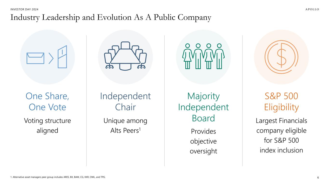 INVESTOR DAY 2024 We’ve Delivered Strong Returns to Shareholders Over More Than a Decade Note: Annualized Total Return includes stock price appreciation and reinvestment of dividends. Sources: Bloomberg and FactSet. 1. Stock price as of September 27, 2024. 5 $18 $23 $43 $73 $126 MARCH 2011 IPO DECEMBER 2014 INVESTOR DAY NOVEMBER 2019 INVESTOR DAY OCTOBER 2021 INVESTOR DAY OCTOBER 2024 INVESTOR DAY Annualized Total Return Since NYSE Listing vs. S&P 500: 14% 24%~7x Apollo Stock Price $ per share 1