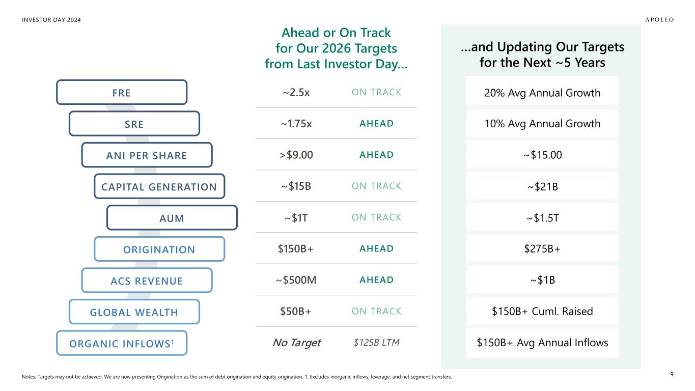 INVESTOR DAY 2024 Our 4th Investor Day… 2019 Achieved in ~4 years 2014 ~2x AUM by 2019 Achieved in <4 years 2021 ~2.5x FRE, ~1.75x SRE, ~2x ANI + Origination, Capital Solutions, Global Wealth targets by 2026 Ahead or On Track for All Metrics ~2x AUM & FRE by 2024 8