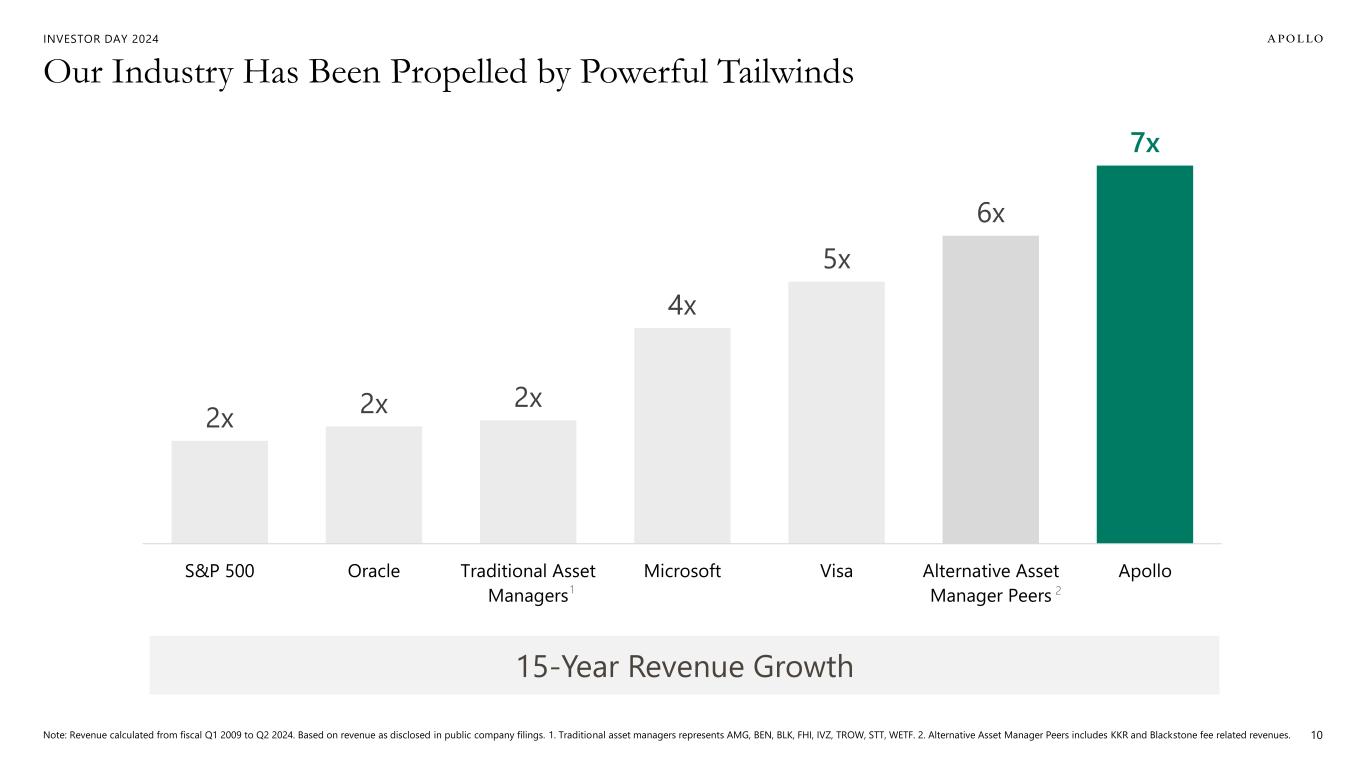 INVESTOR DAY 2024 Our Industry Has Been Propelled by Powerful Tailwinds Note: Revenue calculated from fiscal Q1 2009 to Q2 2024. Based on revenue as disclosed in public company filings. 1. Traditional asset managers represents AMG, BEN, BLK, FHI, IVZ, TROW, STT, WETF. 2. Alternative Asset Manager Peers includes KKR and Blackstone fee related revenues. 10 15-Year Revenue Growth 2x 2x 2x 4x 5x 6x 7x S&P 500 Oracle Traditional Asset Managers Microsoft Visa Alternative Asset Manager Peers Apollo 1 2