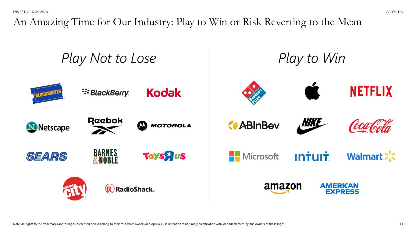 INVESTOR DAY 2024 An Amazing Time for Our Industry: Play to Win or Risk Reverting to the Mean Note: All rights to the trademarks and/or logos presented herein belong to their respective owners and Apollo's use hereof does not imply an affiliation with, or endorsement by, the owners of these logos. Play to WinPlay Not to Lose 11