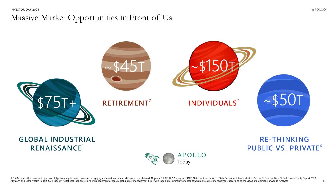 INVESTOR DAY 2024 POST-GFC POST-MERGER Apollo’s 35-Year Journey Consistently Growing Our Foundation & Expanding Our Capabilities Through Cycles AT FOUNDING Private Equity Platforms ADIP Capital Solutions Wealth Credit Athene 12