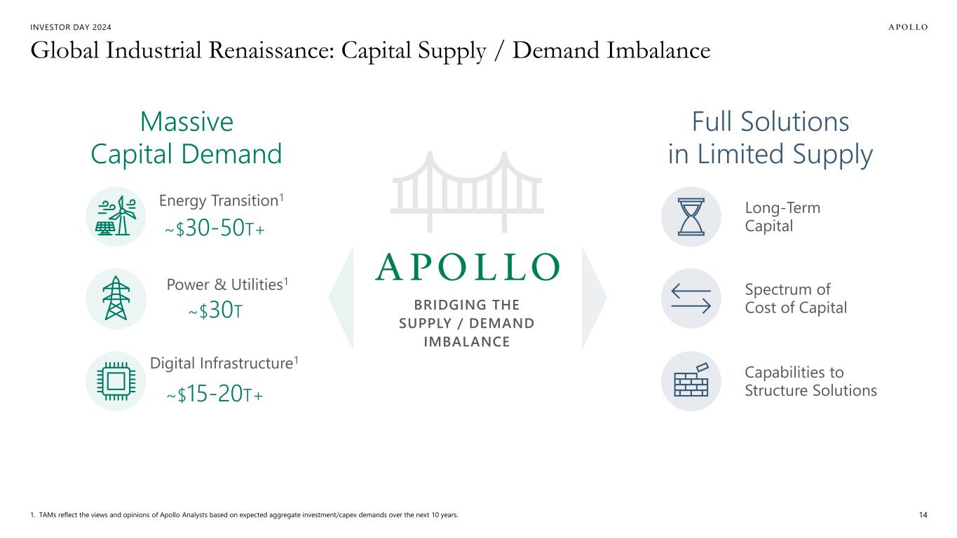 INVESTOR DAY 2024 ~$50T RE-THINKING PUBLIC VS. PRIVATE4 $75T+ GLOBAL INDUSTRIAL RENAISSANCE 1 Massive Market Opportunities in Front of Us Today RETIREMENT2 ~$45T ~$150 T INDIVIDUALS3 1. TAMs reflect the views and opinions of Apollo Analysts based on expected aggregate investment/capex demands over the next 10 years. 2. 2021 IAIS Survey and 1Q23 National Association of State Retirement Administrators Survey. 3. Sources: Bain Global Private Equity Report 2023, Altrata World Ultra Wealth Report 2024, Fidelity. 4. Reflects total assets under management of top 25 global asset management firms with capabilities primarily oriented toward active asset management, according to the views and opinions of Apollo Analysts. 13