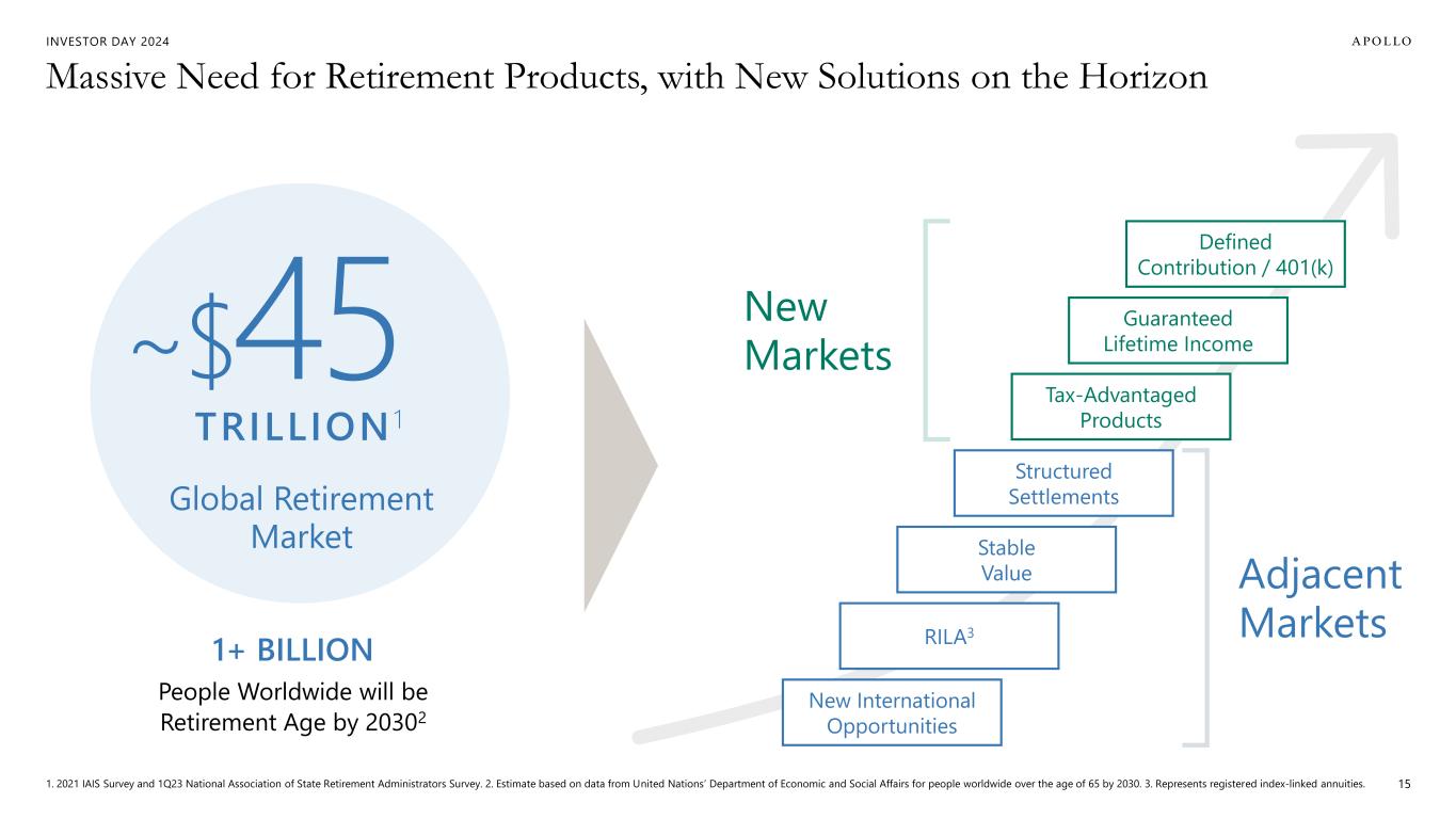 INVESTOR DAY 2024 Global Industrial Renaissance: Capital Supply / Demand Imbalance 1. TAMs reflect the views and opinions of Apollo Analysts based on expected aggregate investment/capex demands over the next 10 years. 14 Massive Capital Demand Full Solutions in Limited Supply Long-Term Capital Spectrum of Cost of Capital Capabilities to Structure Solutions BRIDGING THE SUPPLY / DEMAND IMBALANCE ~$30-50T+ Energy Transition1 ~$30T Power & Utilities1 ~$15-20T+ Digital Infrastructure1