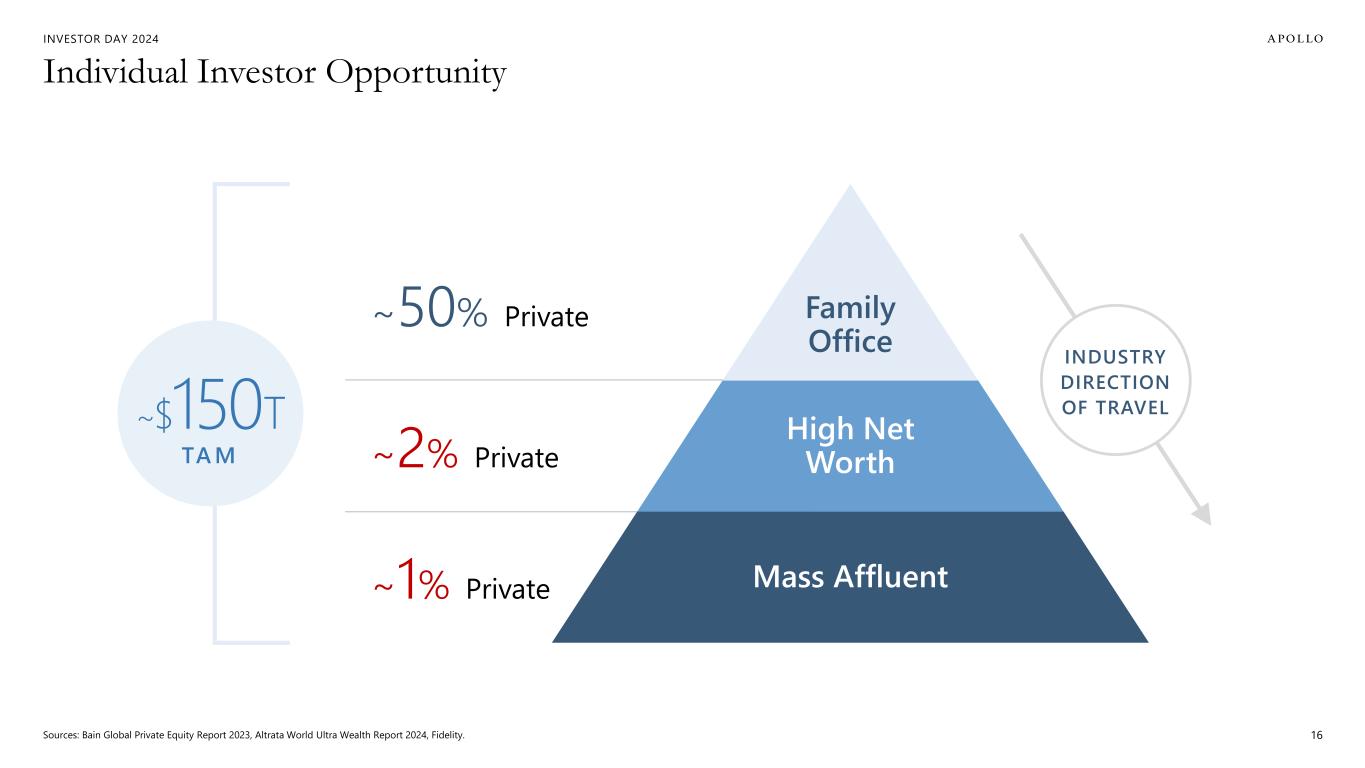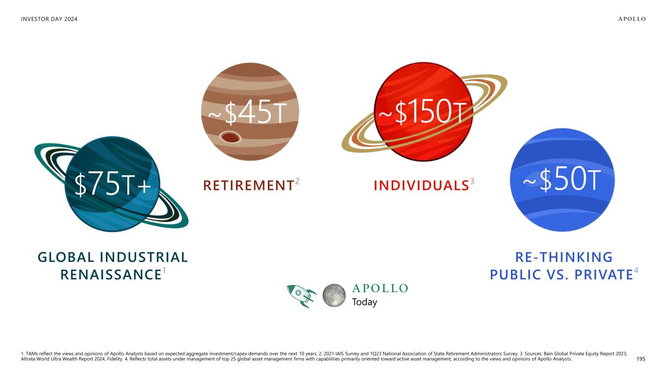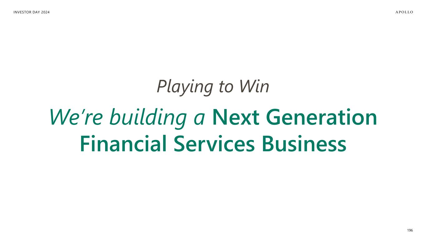 INVESTOR DAY 2024 ~$50T RE-THINKING PUBLIC VS. PRIVATE4 $75T+ GLOBAL INDUSTRIAL RENAISSANCE 1 Today RETIREMENT2 ~$45T ~$150 T INDIVIDUALS3 1. TAMs reflect the views and opinions of Apollo Analysts based on expected aggregate investment/capex demands over the next 10 years. 2. 2021 IAIS Survey and 1Q23 National Association of State Retirement Administrators Survey. 3. Sources: Bain Global Private Equity Report 2023, Altrata World Ultra Wealth Report 2024, Fidelity. 4. Reflects total assets under management of top 25 global asset management firms with capabilities primarily oriented toward active asset management, according to the views and opinions of Apollo Analysts. 195
