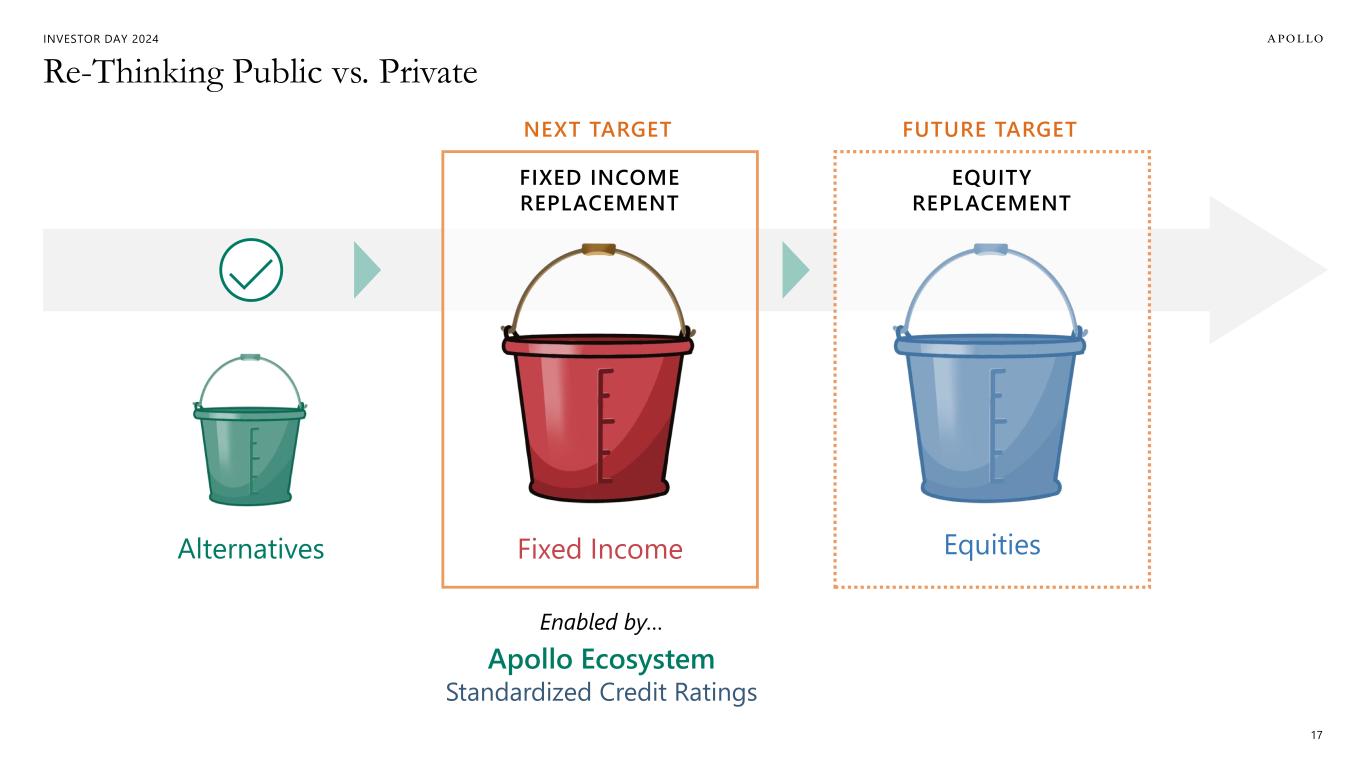 INVESTOR DAY 2024 Re-Thinking Public vs. Private EQUITY REPLACEMENT FUTURE TARGET FIXED INCOME REPLACEMENT NEXT TARGET EquitiesFixed IncomeAlternatives Enabled by… Apollo Ecosystem Standardized Credit Ratings 17