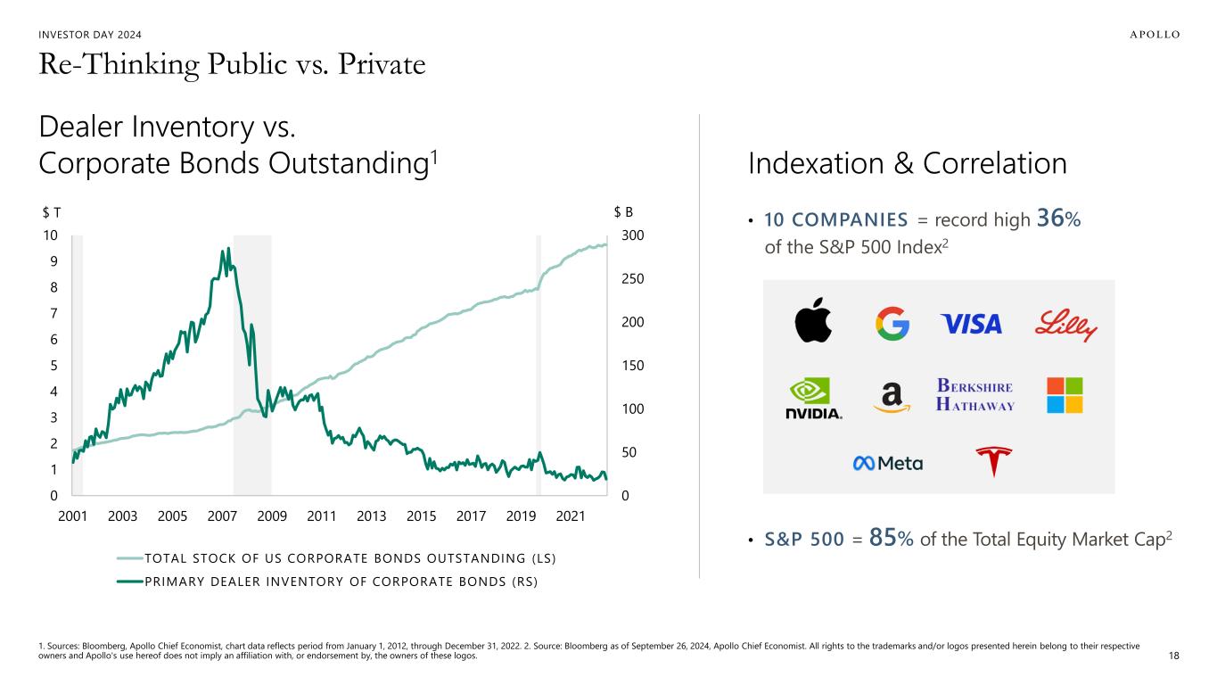 INVESTOR DAY 2024 Re-Thinking Public vs. Private 1. Sources: Bloomberg, Apollo Chief Economist, chart data reflects period from January 1, 2012, through December 31, 2022. 2. Source: Bloomberg as of September 26, 2024, Apollo Chief Economist. All rights to the trademarks and/or logos presented herein belong to their respective owners and Apollo's use hereof does not imply an affiliation with, or endorsement by, the owners of these logos. 0 50 100 150 200 250 300 0 1 2 3 4 5 6 7 8 9 10 2001 2003 2005 2007 2009 2011 2013 2015 2017 2019 2021 $ B$ T TOTAL STOCK OF US CORPORATE BONDS OUTSTANDING (LS) PRIMARY DEALER INVENTORY OF CORPORATE BONDS (RS) Dealer Inventory vs. Corporate Bonds Outstanding1 Indexation & Correlation • 10 COMPANIES = record high 36% of the S&P 500 Index2 • S&P 500 = 85% of the Total Equity Market Cap2 18