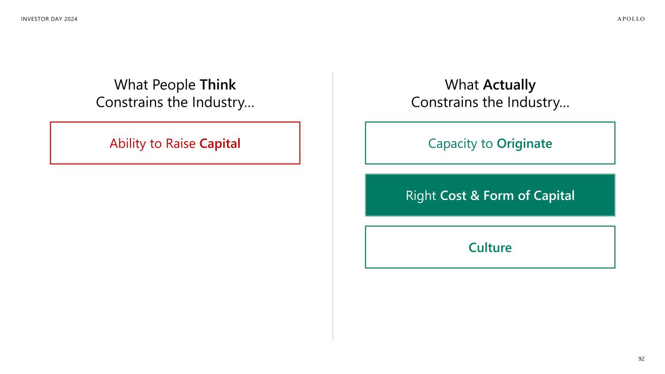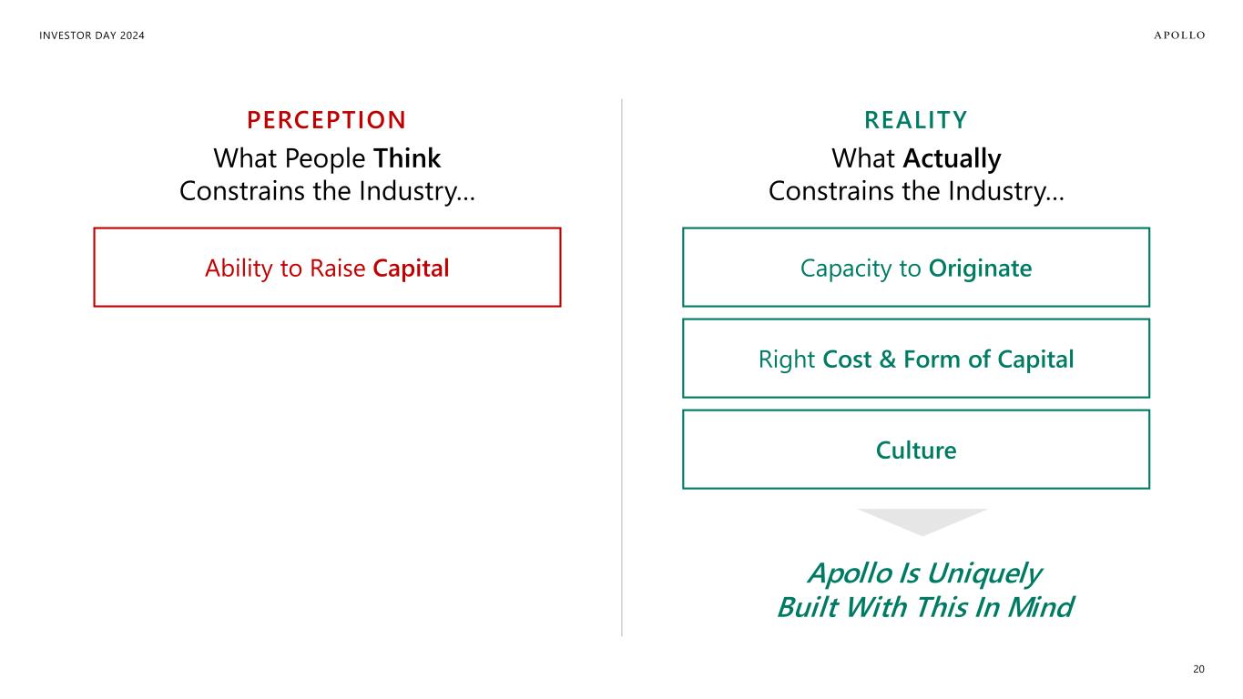 INVESTOR DAY 2024 20 Ability to Raise Capital Right Cost & Form of Capital Capacity to Originate Apollo Is Uniquely Built With This In Mind Culture What People Think Constrains the Industry… PERCEPTION What Actually Constrains the Industry… REALITY
