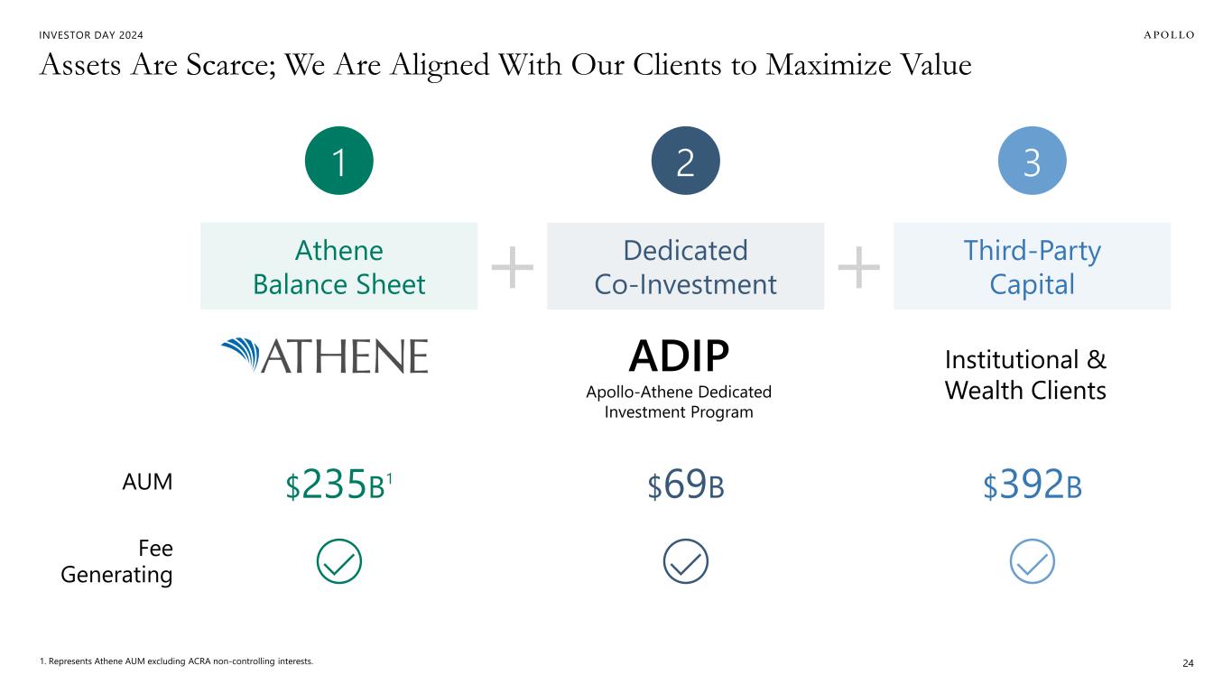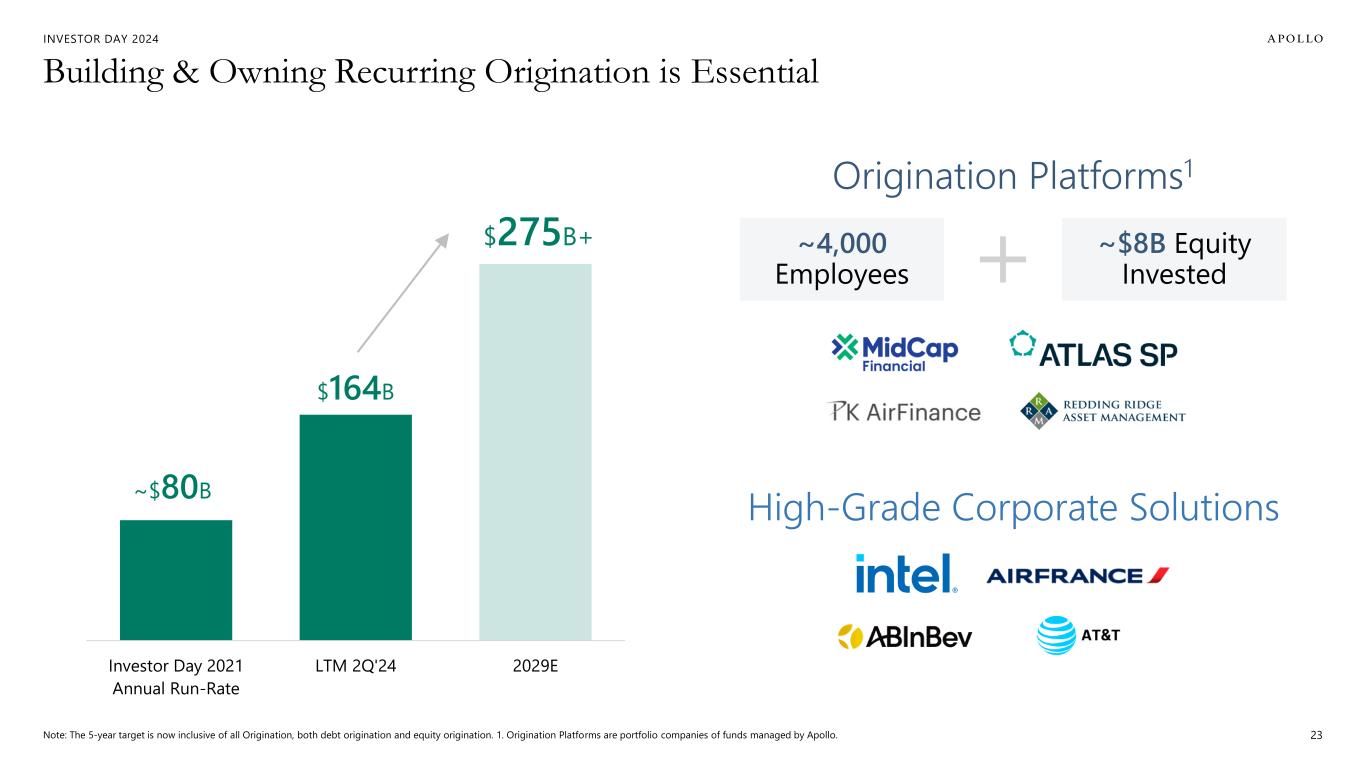 INVESTOR DAY 2024 Building & Owning Recurring Origination is Essential Note: The 5-year target is now inclusive of all Origination, both debt origination and equity origination. 1. Origination Platforms are portfolio companies of funds managed by Apollo. 23 Origination Platforms1 High-Grade Corporate Solutions ~$8B Equity Invested ~4,000 Employees Investor Day 2021 Annual Run-Rate LTM 2Q'24 2029E $164B $275B+ ~$80B