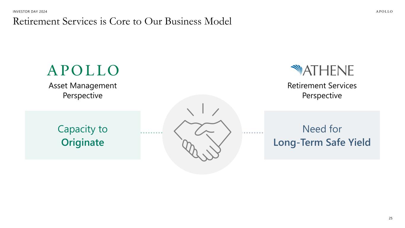 INVESTOR DAY 2024 Assets Are Scarce; We Are Aligned With Our Clients to Maximize Value 24 ADIP Apollo-Athene Dedicated Investment Program Institutional & Wealth Clients Athene Balance Sheet 1 Dedicated Co-Investment Third-Party Capital 32 Fee Generating AUM $235B1 $69B $392B 1. Represents Athene AUM excluding ACRA non-controlling interests.