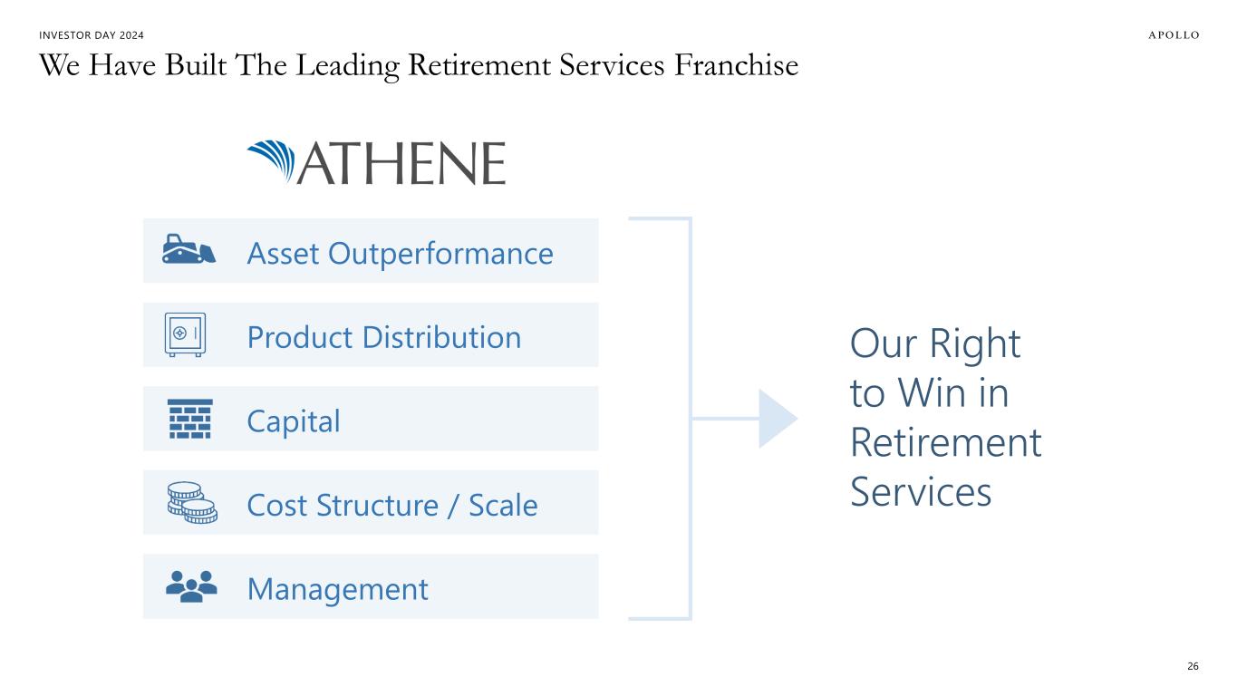 INVESTOR DAY 2024 Retirement Services is Core to Our Business Model 25 Asset Management Perspective Retirement Services Perspective Need for Long-Term Safe Yield Capacity to Originate
