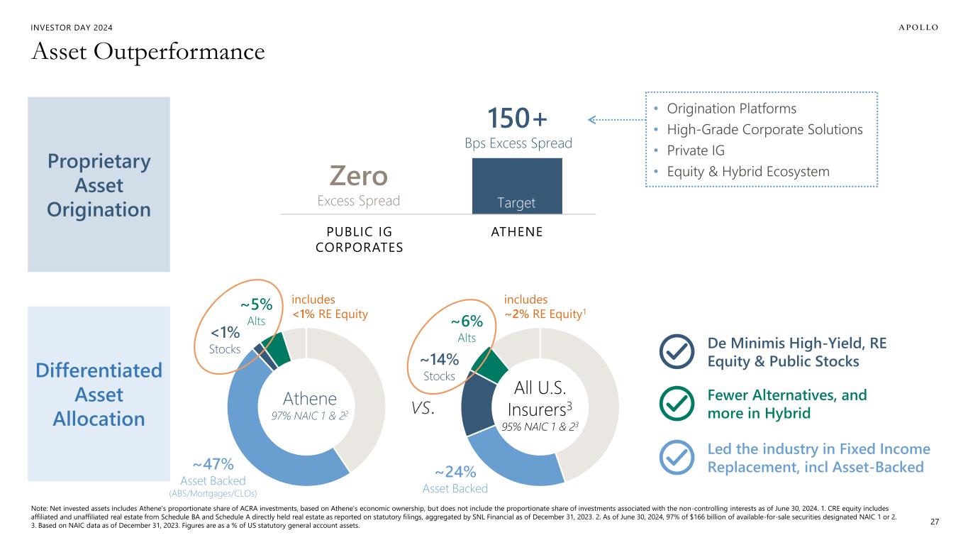 INVESTOR DAY 2024 27 vs. Asset Outperformance Proprietary Asset Origination PUBLIC IG CORPORATES ATHENE Zero Excess Spread 150+ Bps Excess Spread Differentiated Asset Allocation Target ~14% Stocks ~6% Alts ~5% Alts Led the industry in Fixed Income Replacement, incl Asset-Backed Fewer Alternatives, and more in Hybrid • Origination Platforms • High-Grade Corporate Solutions • Private IG • Equity & Hybrid Ecosystem Note: Net invested assets includes Athene's proportionate share of ACRA investments, based on Athene's economic ownership, but does not include the proportionate share of investments associated with the non-controlling interests as of June 30, 2024. 1. CRE equity includes affiliated and unaffiliated real estate from Schedule BA and Schedule A directly held real estate as reported on statutory filings, aggregated by SNL Financial as of December 31, 2023. 2. As of June 30, 2024, 97% of $166 billion of available-for-sale securities designated NAIC 1 or 2. 3. Based on NAIC data as of December 31, 2023. Figures are as a % of US statutory general account assets. De Minimis High-Yield, RE Equity & Public Stocks ~24% Asset Backed <1% Stocks ~47% Asset Backed (ABS/Mortgages/CLOs) includes <1% RE Equity includes ~2% RE Equity1 Athene 97% NAIC 1 & 22 All U.S. Insurers3 95% NAIC 1 & 23