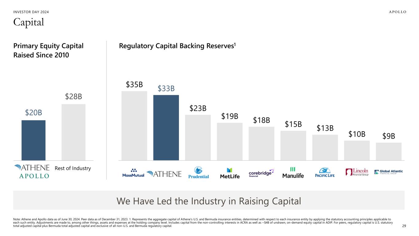 INVESTOR DAY 2024 2014 2015 2016 2017 2018 2019 2020 2021 2022 2023 2024E RETAIL ANNUITIES FLOW REINSURANCE PENSION GROUP ANNUITIES FUNDING AGREEMENTS Product Distribution 28 1. Previously announced target of $70 billion or more of estimated inflows in FY'24. 2. Funding agreements are comprised of funding agreements issued under Athene’s funding agreement backed note (FABN) program, secured and other funding agreements, funding agreements issued to the Federal Home Loan Bank (FHLB) and long term repurchase agreements. $3B $4B $9B $11B $13B $18B $28B $37B $48B $63B $70B ~23x Gross Organic Inflows 2 1
