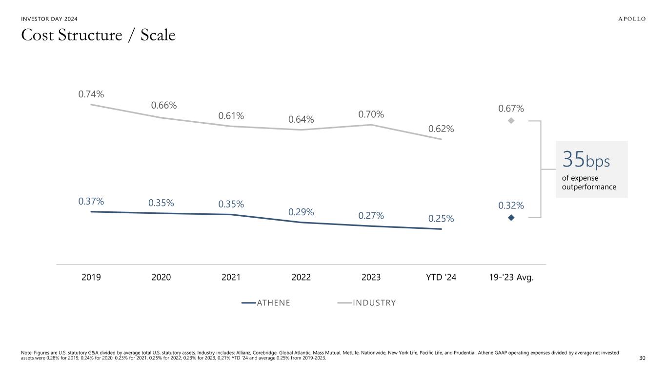 INVESTOR DAY 2024 $20B $28B Rest of Industry $35B $33B $23B $19B $18B $15B $13B $10B $9B Capital 29 Regulatory Capital Backing Reserves1Primary Equity Capital Raised Since 2010 We Have Led the Industry in Raising Capital Note: Athene and Apollo data as of June 30, 2024. Peer data as of December 31, 2023. 1. Represents the aggregate capital of Athene’s U.S. and Bermuda insurance entities, determined with respect to each insurance entity by applying the statutory accounting principles applicable to each such entity. Adjustments are made to, among other things, assets and expenses at the holding company level. Includes capital from the non-controlling interests in ACRA as well as ~$4B of undrawn, on-demand equity capital in ADIP. For peers, regulatory capital is U.S. statutory total adjusted capital plus Bermuda total adjusted capital and exclusive of all non-U.S. and Bermuda regulatory capital.