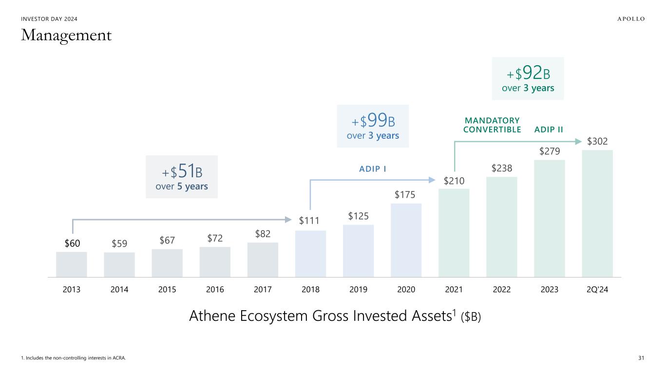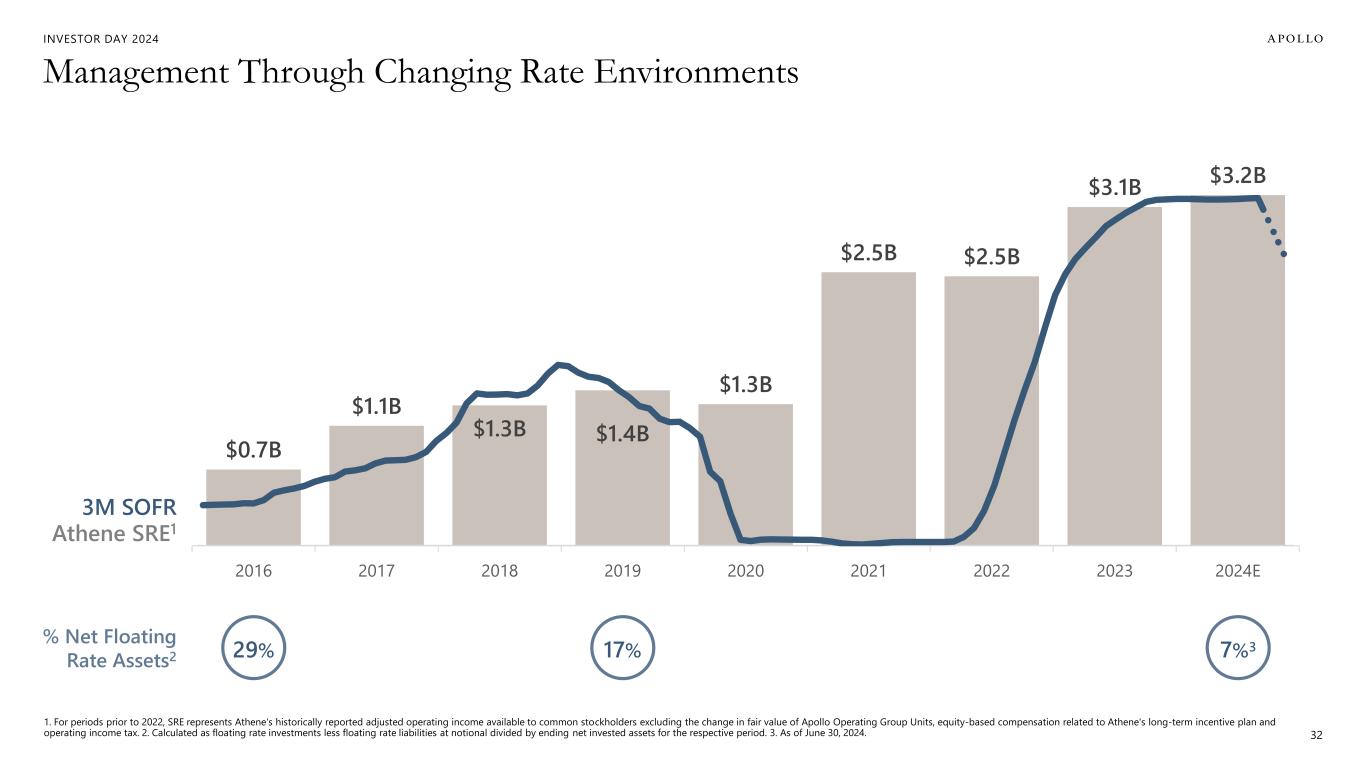 INVESTOR DAY 2024 $60 $59 $67 $72 $82 $111 $125 $175 $210 $238 $279 $302 2013 2014 2015 2016 2017 2018 2019 2020 2021 2022 2023 2Q'24 Management 1. Includes the non-controlling interests in ACRA. 31 MANDATORY CONVERTIBLE ADIP II ADIP I+$51B over 5 years +$99B over 3 years +$92B over 3 years Athene Ecosystem Gross Invested Assets1 ($B)